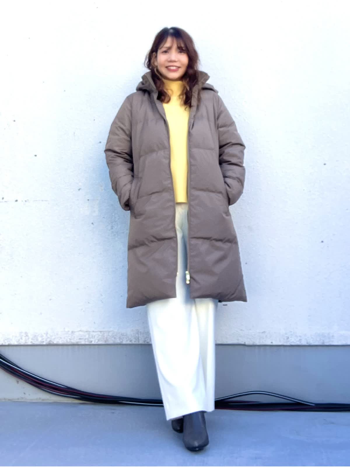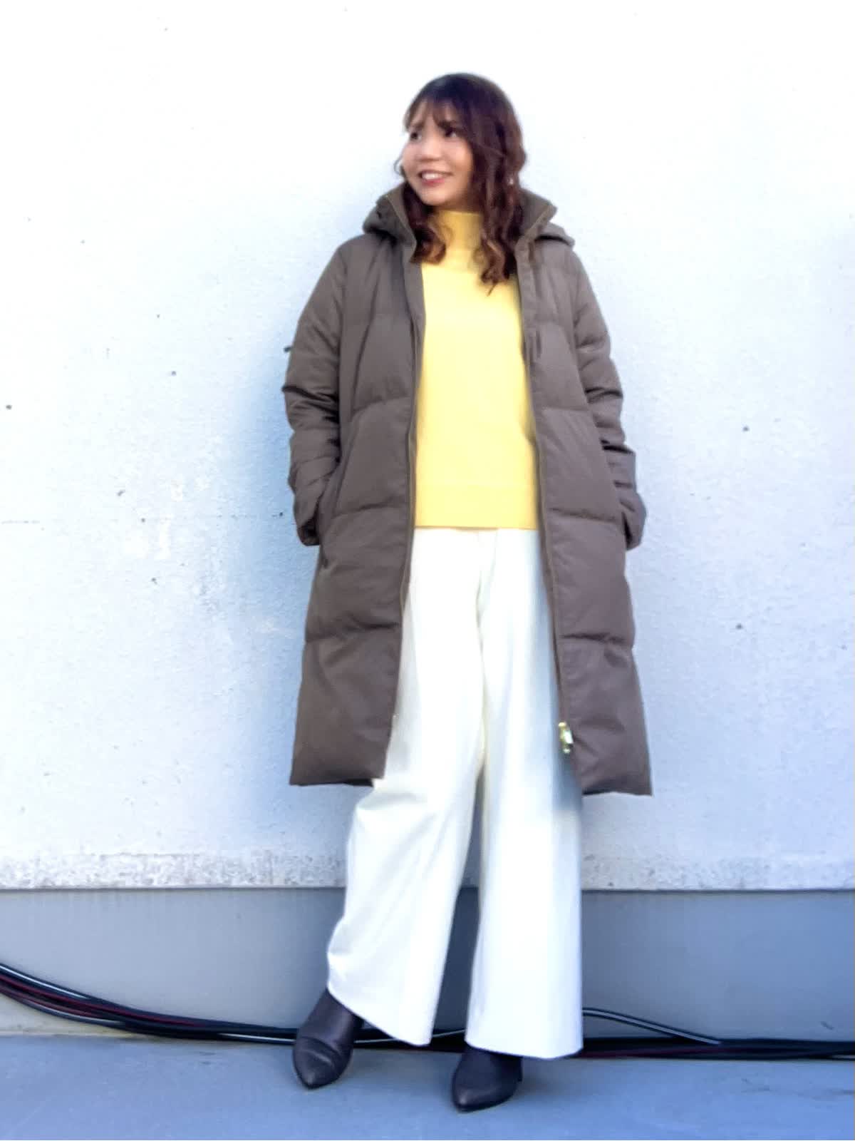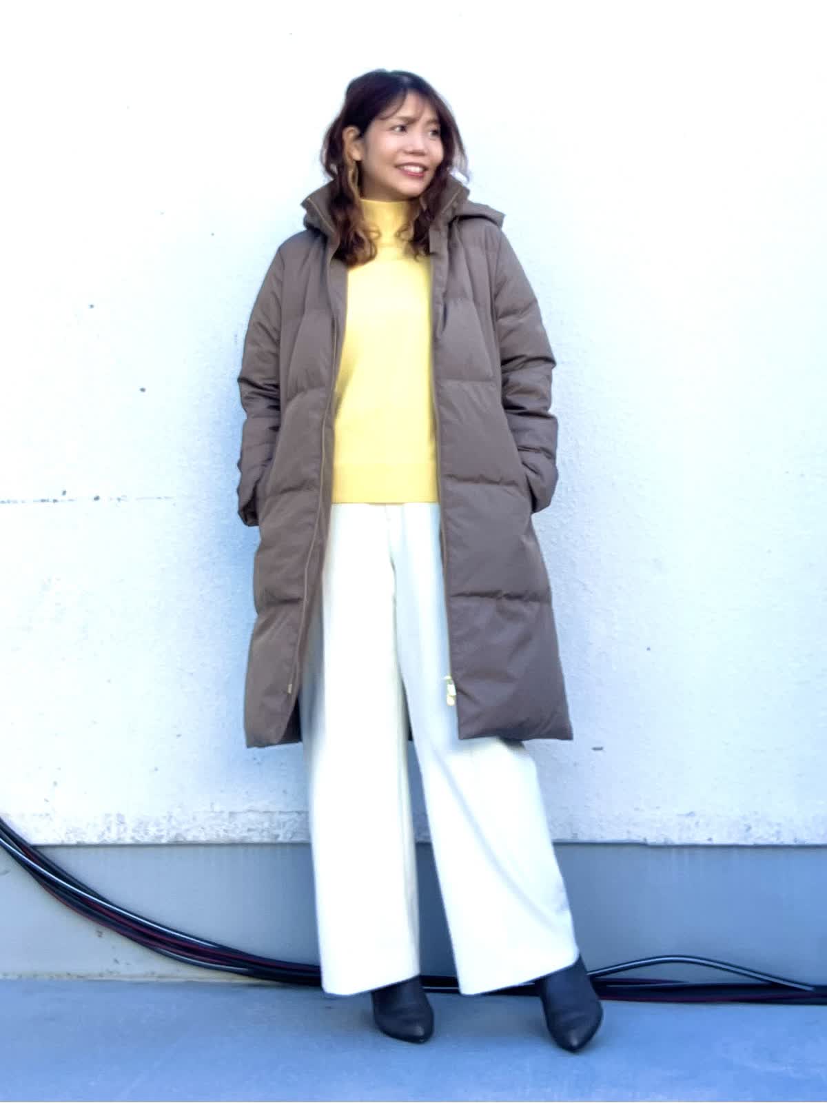 【着用アイテム:カラー/サイズ】 ダウン:モカチャ/11号 ニット:イエロー/9号 パンツ:オフホワイト/9号 とてもスッキリと着て頂けるロングダウン。暖かく襟内側のリブニットがポイントです。 インナーにはカラーが綺麗なニットを合わせました。