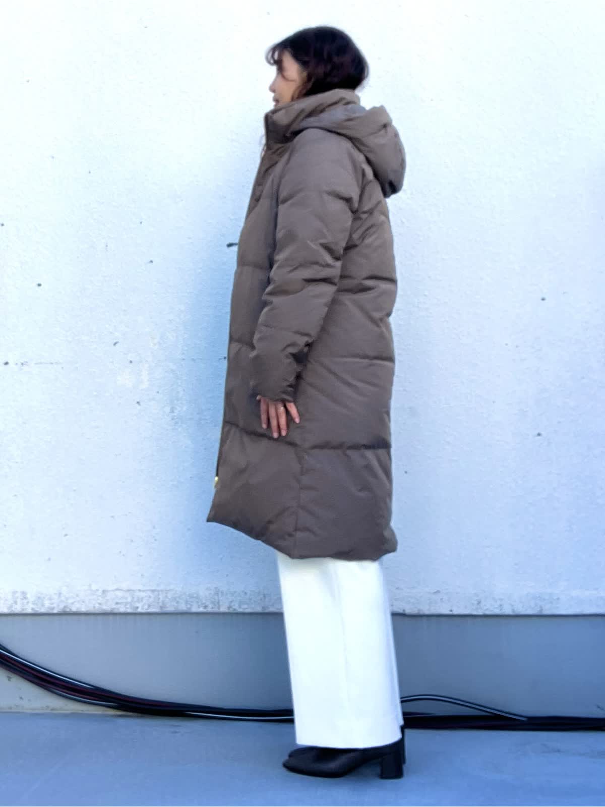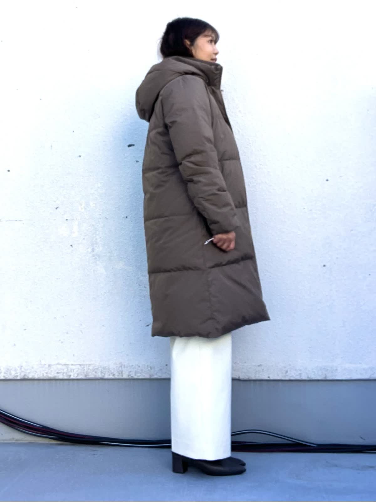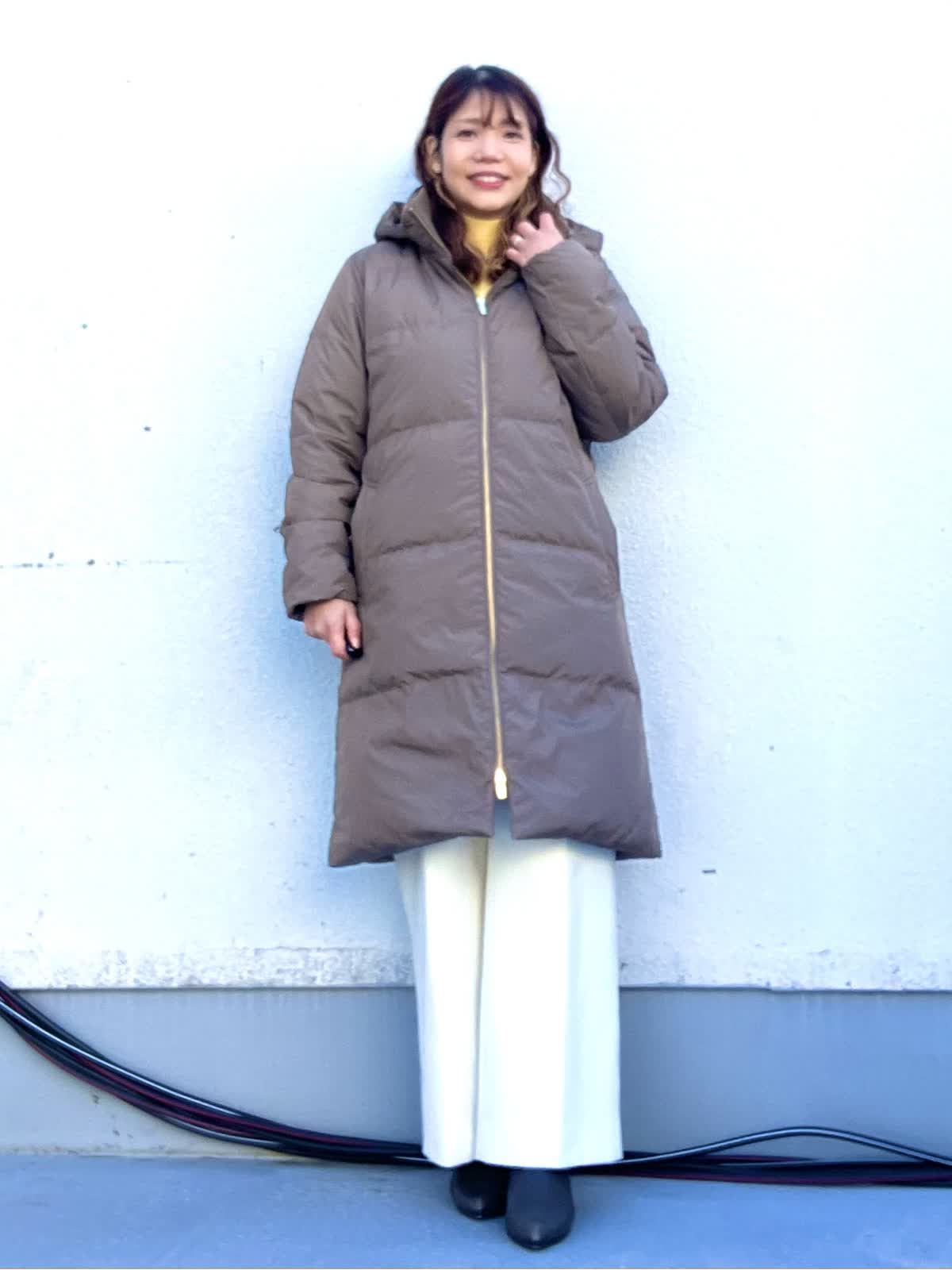 【着用アイテム:カラー/サイズ】 ダウン:モカチャ/11号 ニット:イエロー/9号 パンツ:オフホワイト/9号 とてもスッキリと着て頂けるロングダウン。暖かく襟内側のリブニットがポイントです。 インナーにはカラーが綺麗なニットを合わせました。