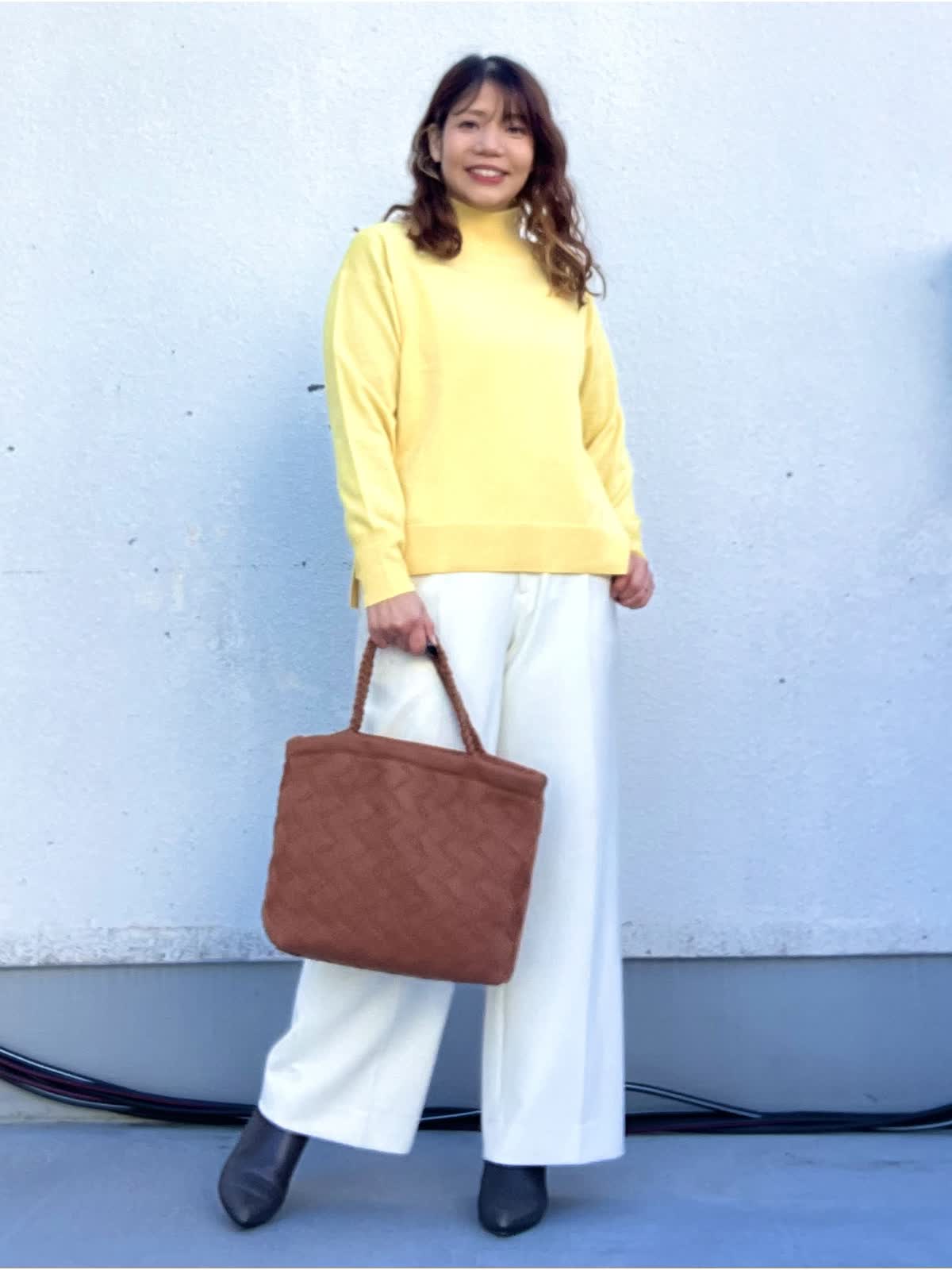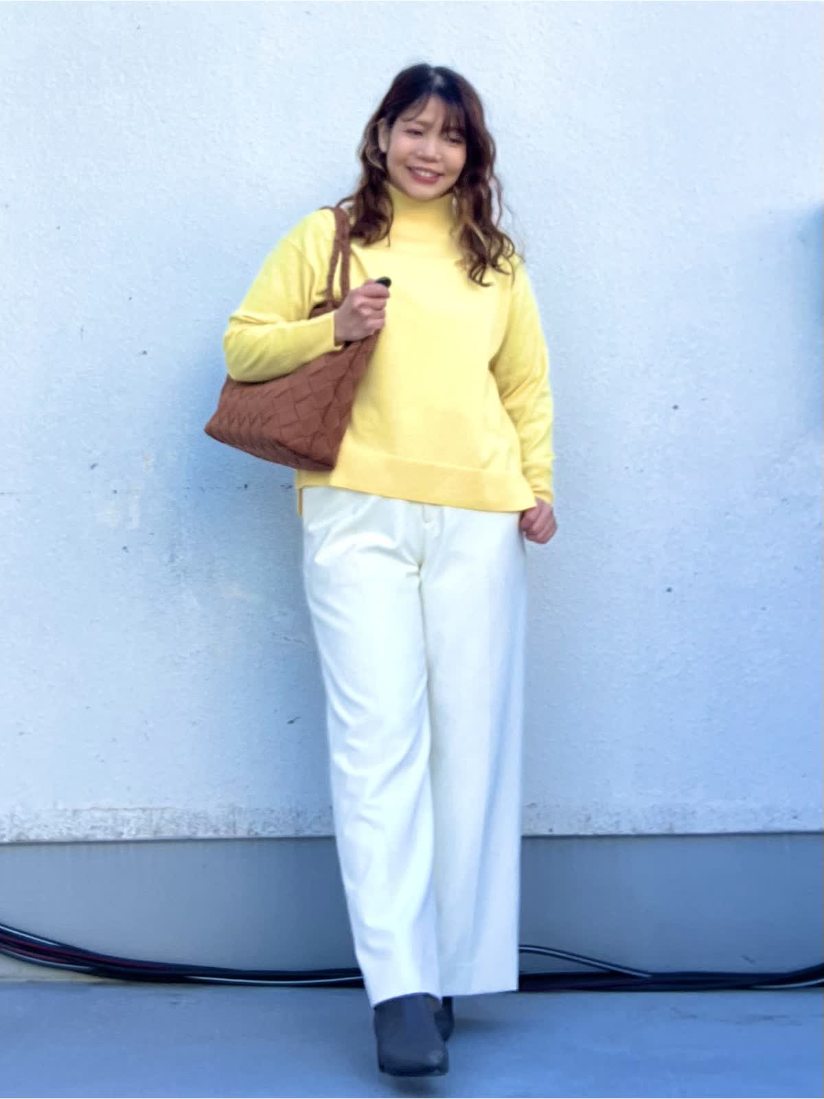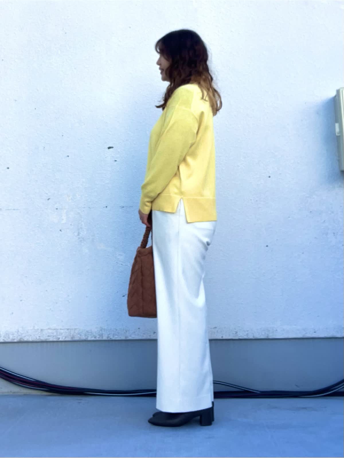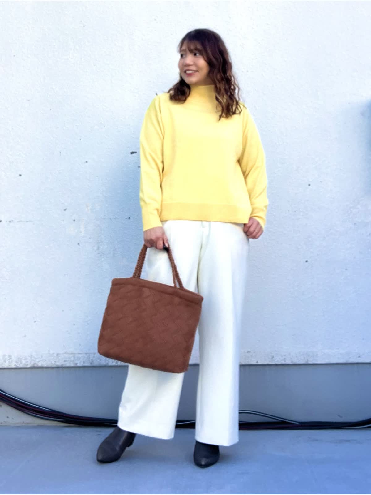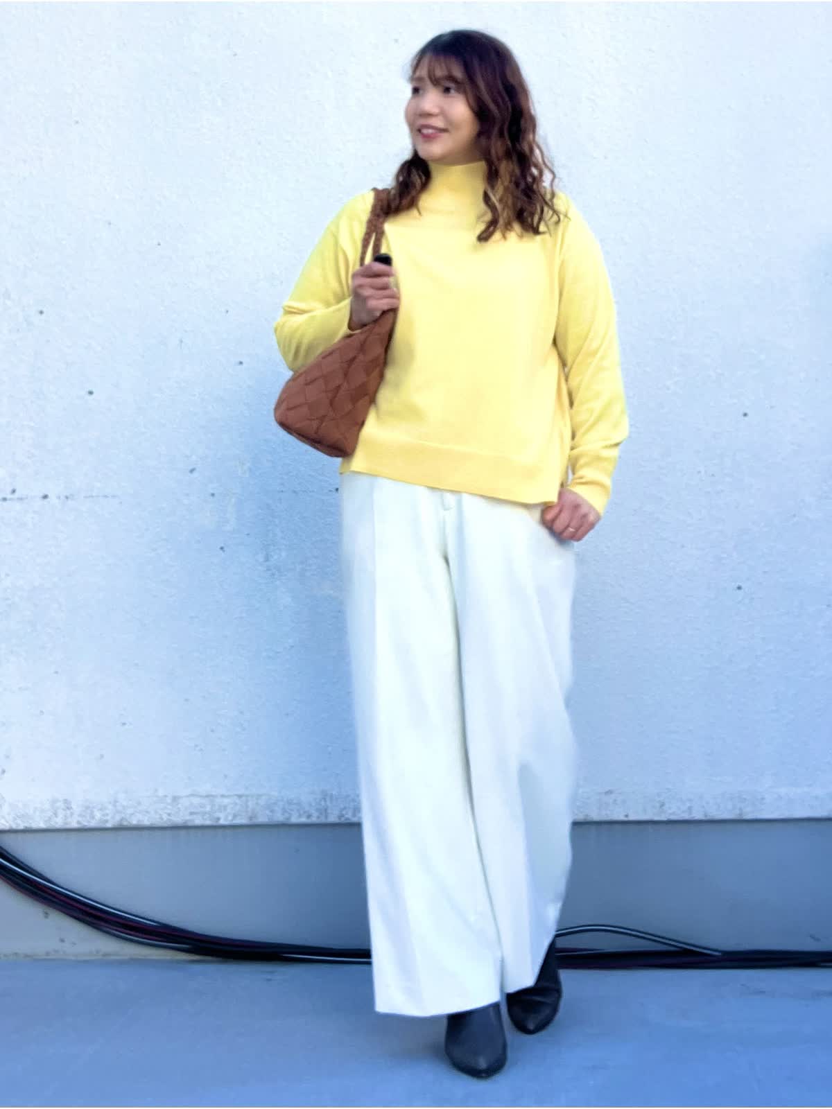【着用アイテム:カラー/サイズ】 ニット:イエロー/9号 パンツ:オフホワイト/9号 カラーがとっても綺麗なこちらのハイネックニットは程よいサイズ感で体型カバーもしてくれます。スカート合わせ、パンツ合わせどちらも合わせやすい着丈で万能ニットです。