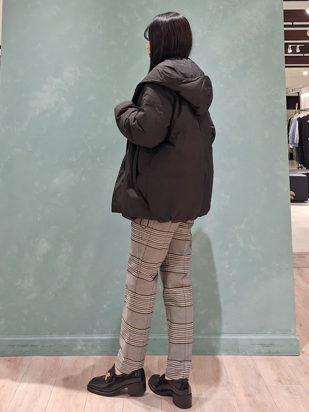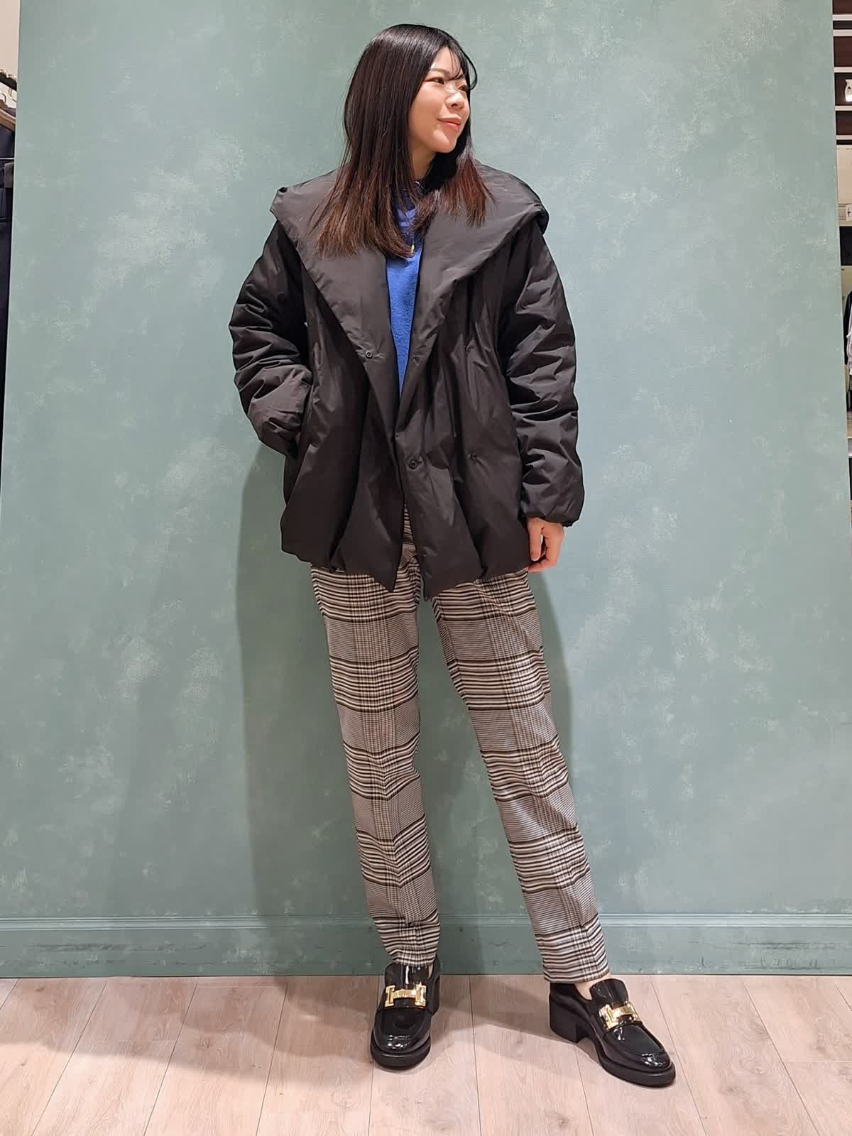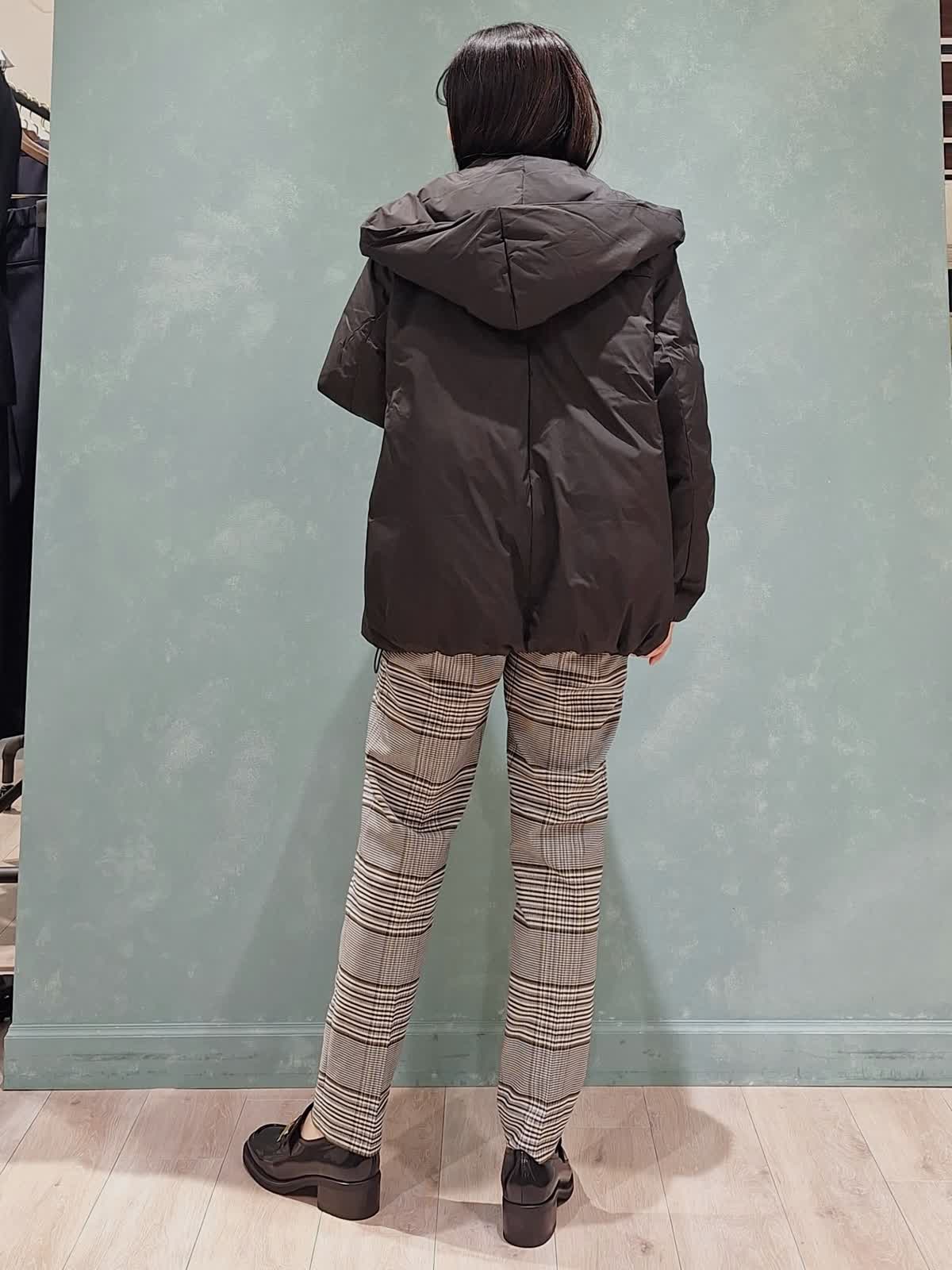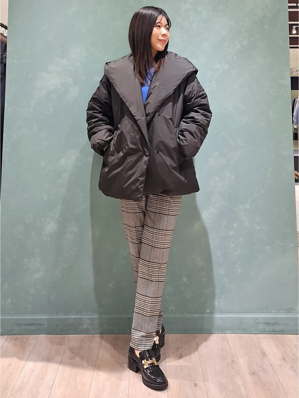 【着用サイズ、カラー】ダウン:7号、ブラック ニット:9号、ブルー パンツ:7号、柄大 冬の休日スタイル。アウターはショールフードダウン。ボリューム感があり、ショールカラーで小顔見え効果が期待できます!1〜3は裾絞りなし、4〜7は裾絞りありです。ふかふかで抜群の保温性!腰回りが隠れる位の着丈はボトムが合わせやすいのでお勧めです。インナーはウール100%カラーニット×定番チェックテーパードパンツを合わせました。ブルベさんにお勧めのカラーです。全て洗えるイージーケアタイプなのも嬉しいポイントです♪