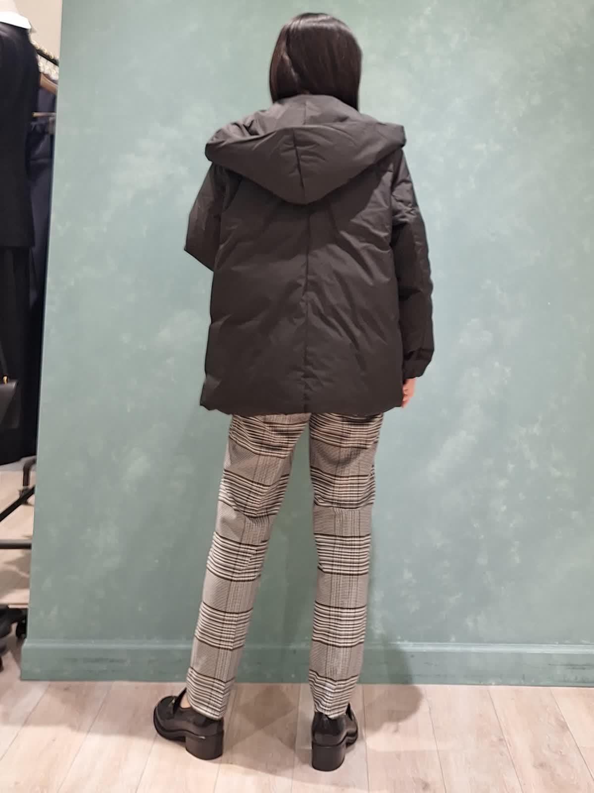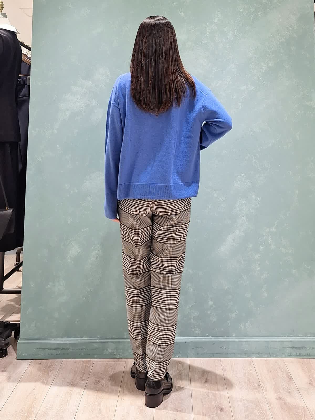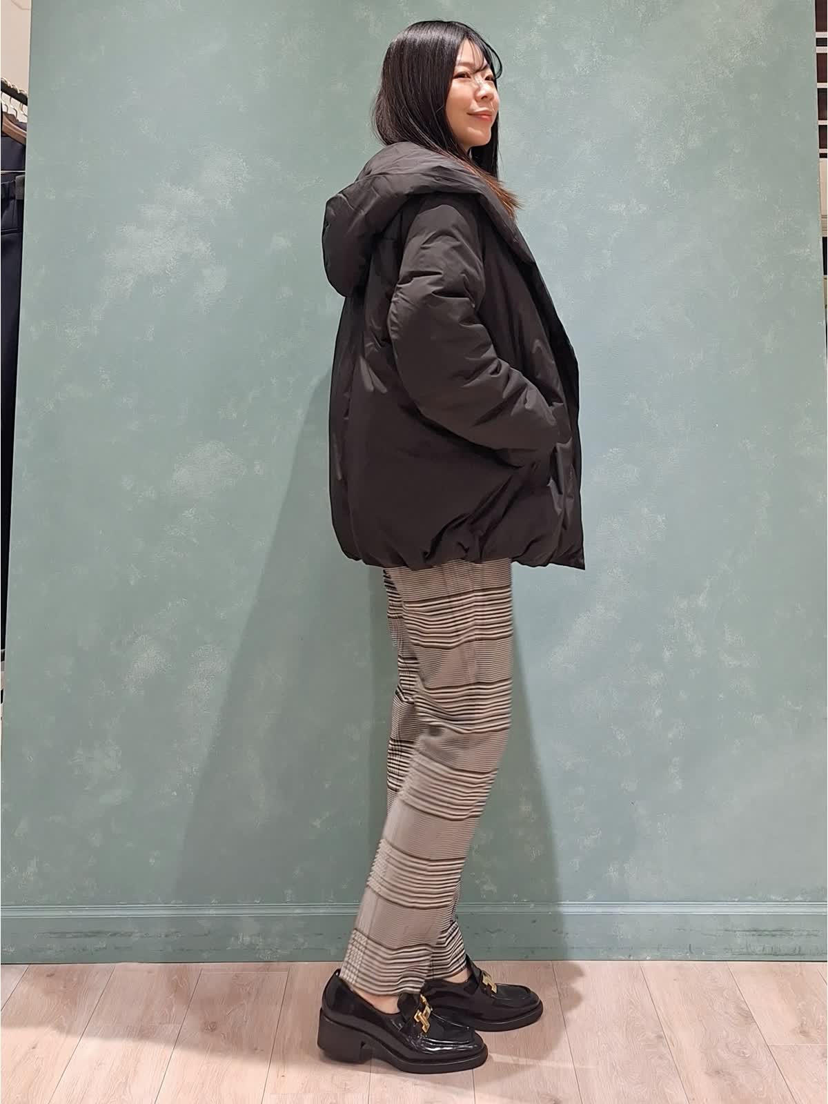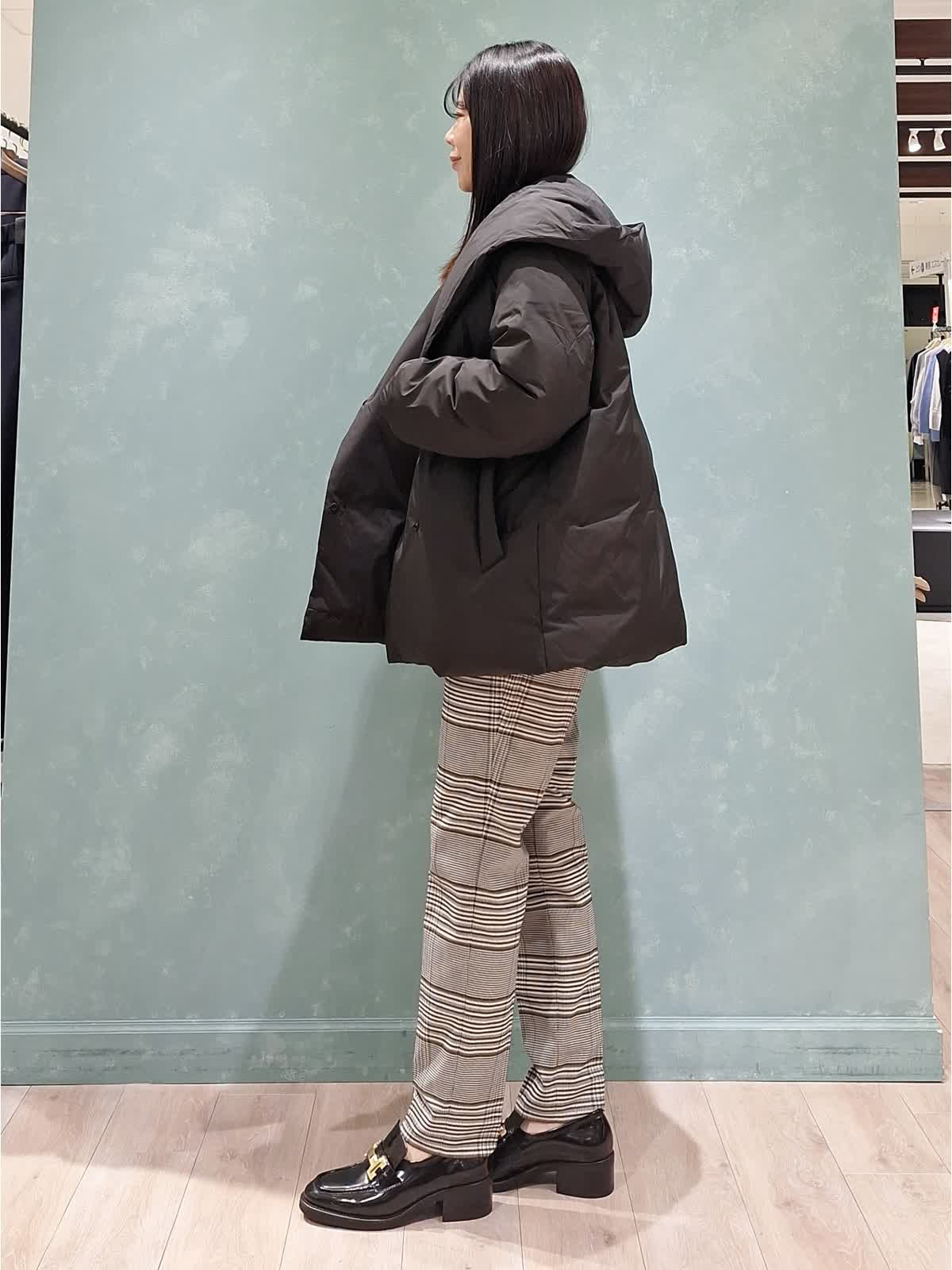 【着用サイズ、カラー】ダウン:7号、ブラック ニット:9号、ブルー パンツ:7号、柄大 冬の休日スタイル。アウターはショールフードダウン。ボリューム感があり、ショールカラーで小顔見え効果が期待できます!1〜3は裾絞りなし、4〜7は裾絞りありです。ふかふかで抜群の保温性!腰回りが隠れる位の着丈はボトムが合わせやすいのでお勧めです。インナーはウール100%カラーニット×定番チェックテーパードパンツを合わせました。ブルベさんにお勧めのカラーです。全て洗えるイージーケアタイプなのも嬉しいポイントです♪