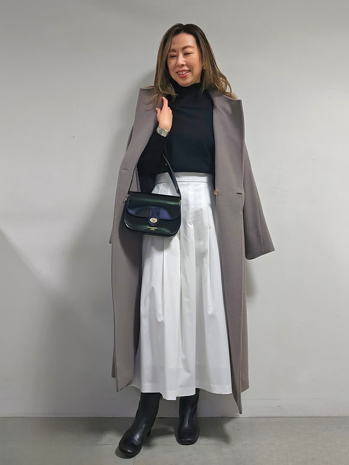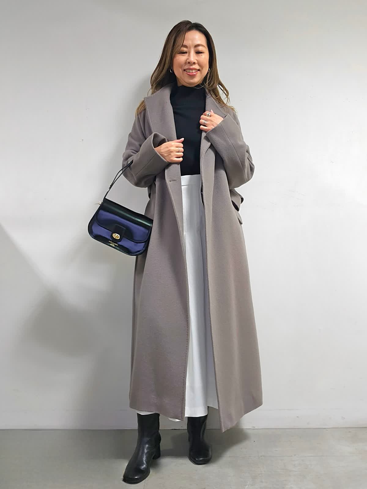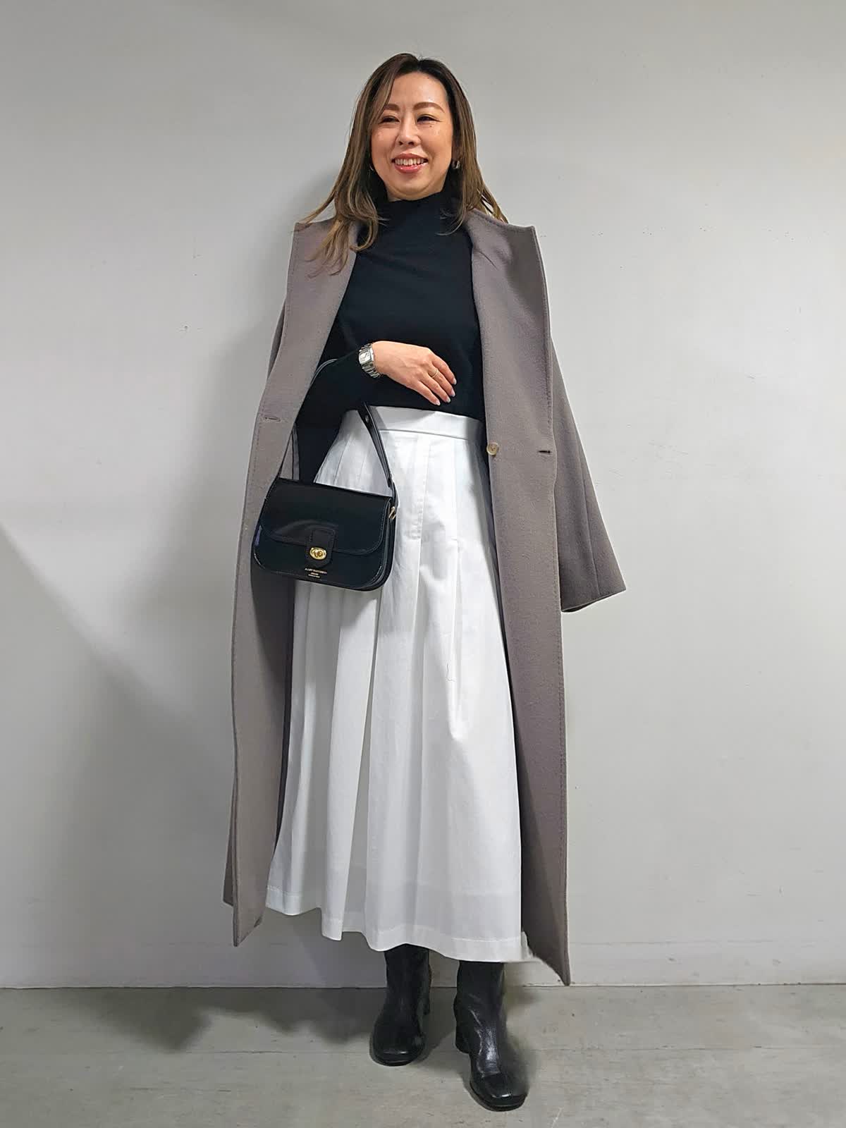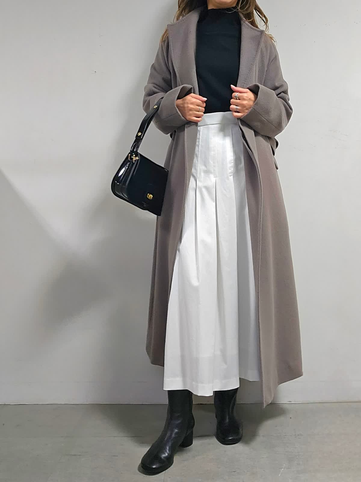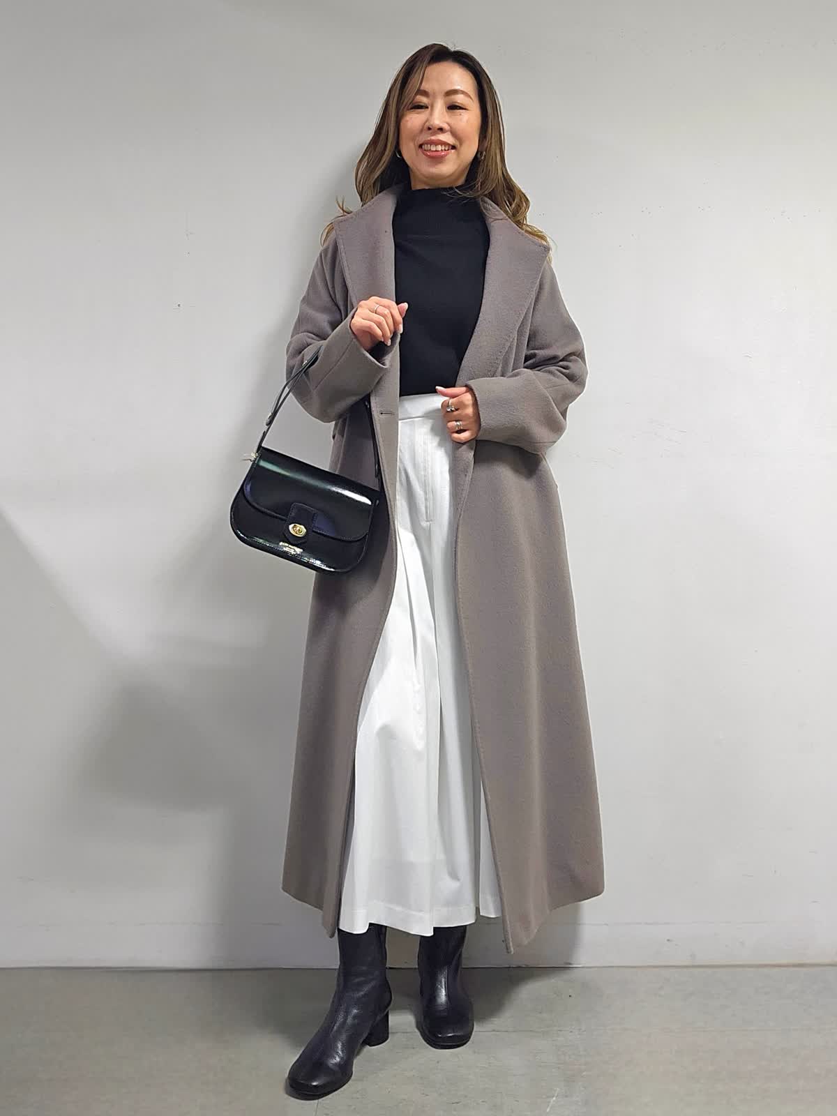【着用カラー・サイズ】コート:グレーベージュ・7号 ニット:ブラック・9号 スカート:オフホワイト・7号 バッグ:ブラック 上品でなめらかな素材感のウールコート。 リッチに品よく見せてくれます。シーンレスで活躍でき、トレンドに偏りがないのも外せない条件の1つ。スタイリング次第で表情豊かにアレンジできるのも優秀ポイントです。