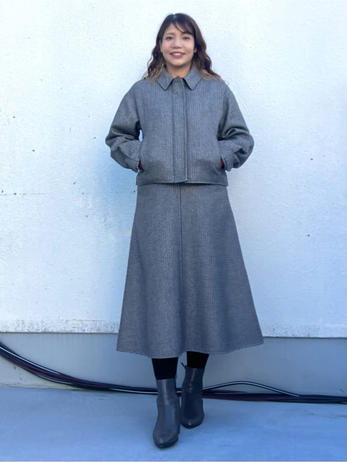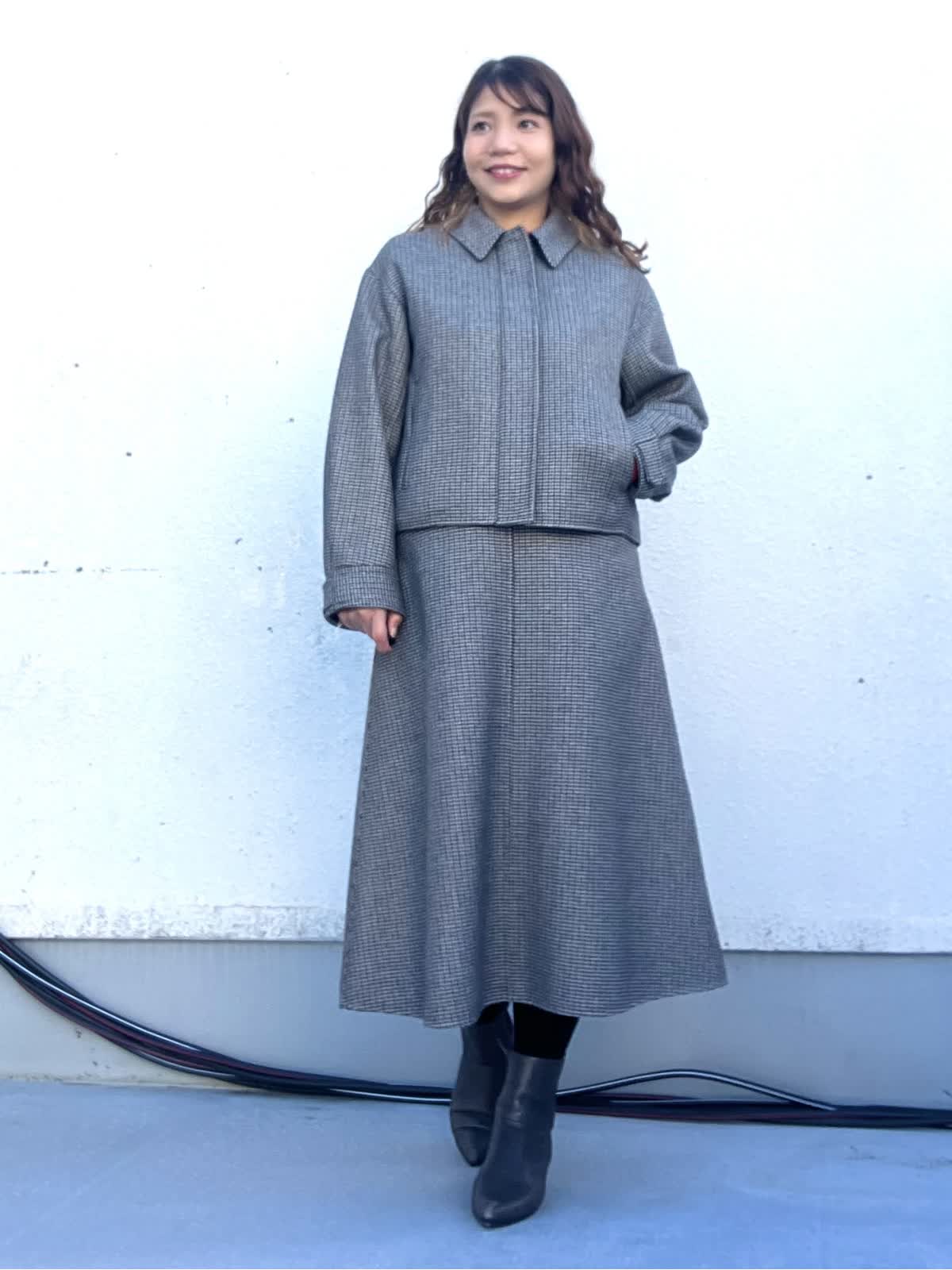 【着用アイテム:カラー/サイズ】 ブルゾン:柄小/9号 スカート:柄小/9号 ニット:シュイロ/9号 細かなチェック柄が上品な印象のジャケットとスカートのセットアップ。 ジャケットは程よくコンパクトな着丈で、前を開けても閉じてもバランスよく着用可能。 きちんと感がありながら、肩や身頃にゆとりを持たせているため窮屈感なく着ていただけます。 スカートは腰まわりはすっきり、裾に向かって自然に広がるシルエット。 ロング丈でも重たく見えず、歩いた時のラインが綺麗に出るのが特徴です。 単品使いもしやすく、ジャケットはパンツ合わせ、スカートはニットやブラウス合わせなど、着回し力の高いセットアップです。