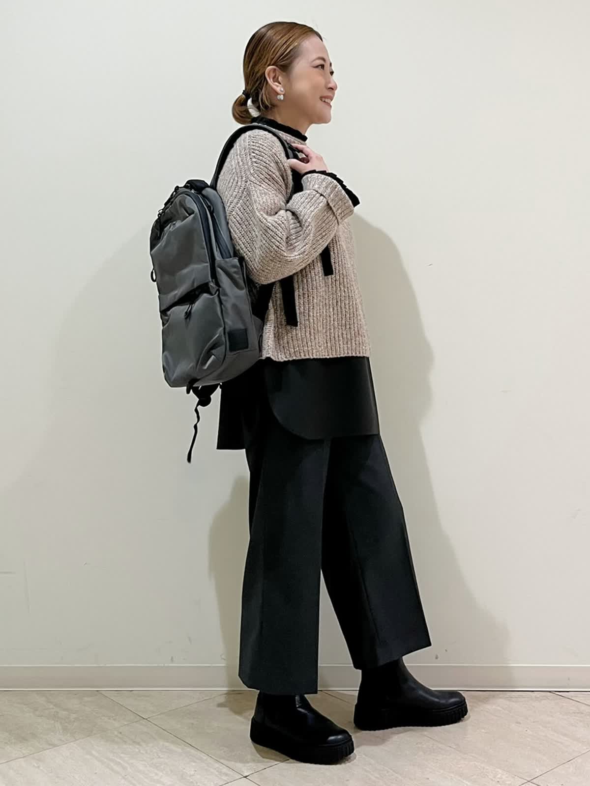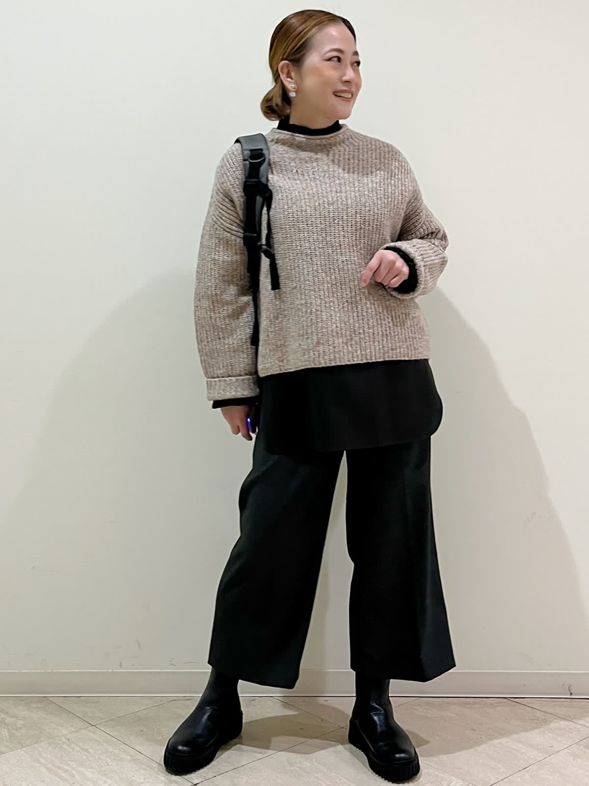 【着用カラー】ニット:キャメル ブラウス:ブラウン パンツ:チャコールグレー
