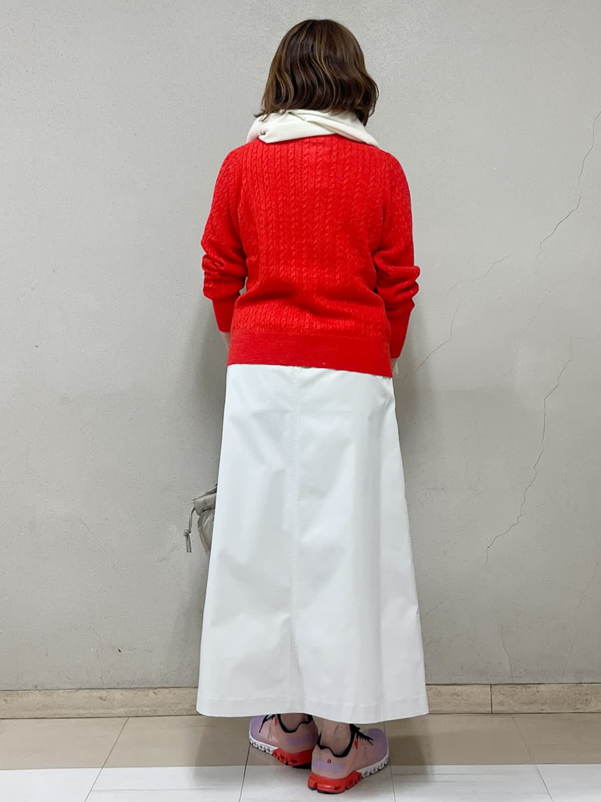 【着用サイズ】ニット:フリーサイズ スカート:9号 【着用カラー】ニット:シュイロ スカート:ベージュ 休日のお出かけコーディネートです。きれいなシュイロのニットはケーブル編みが上品な印象です。アルパカなのでふんわり軽く暖かいです。ニットが引き立つスカートを合わせてみました。光沢がありAラインのシルエットがきれいなロングスカートです。