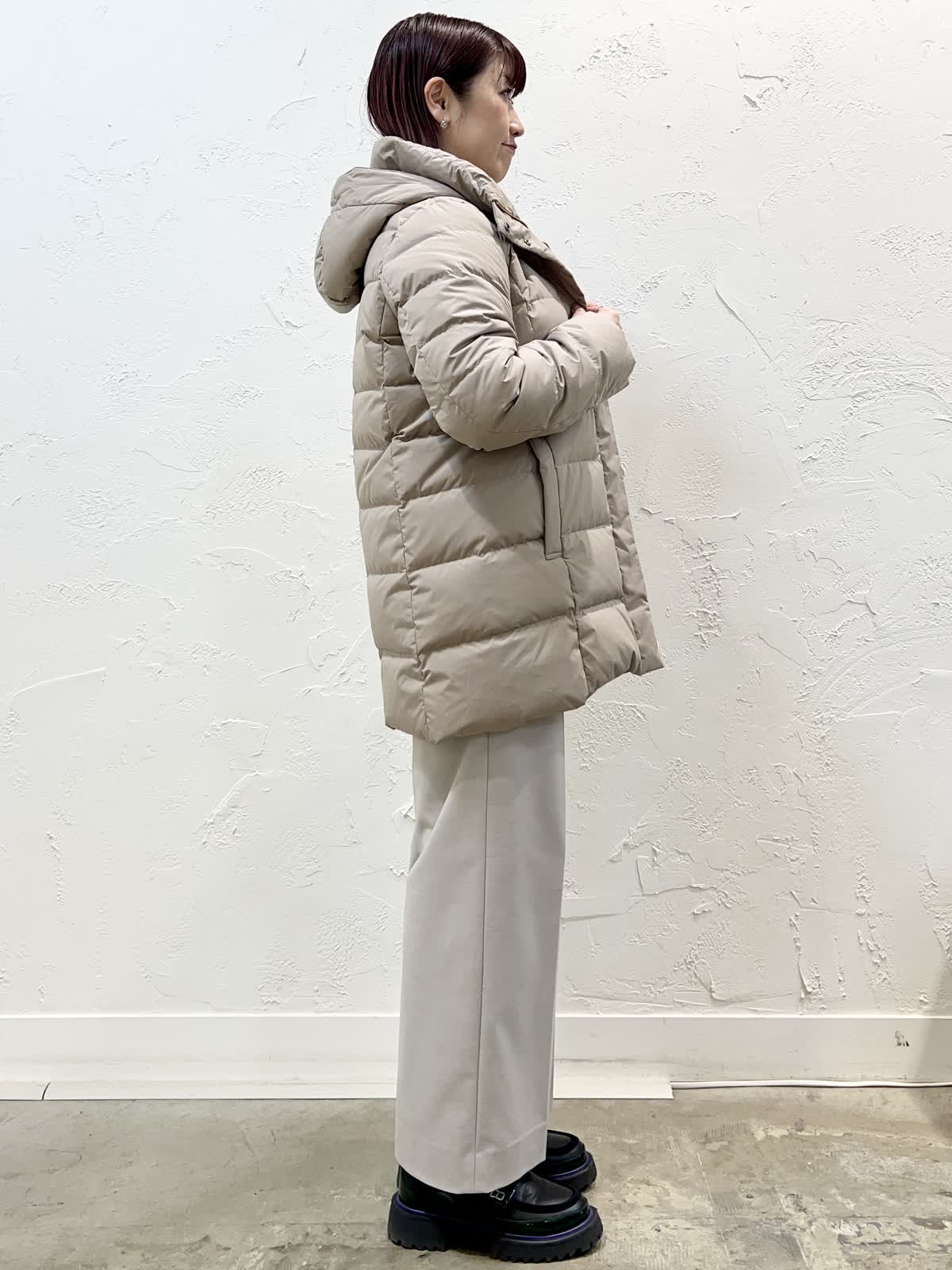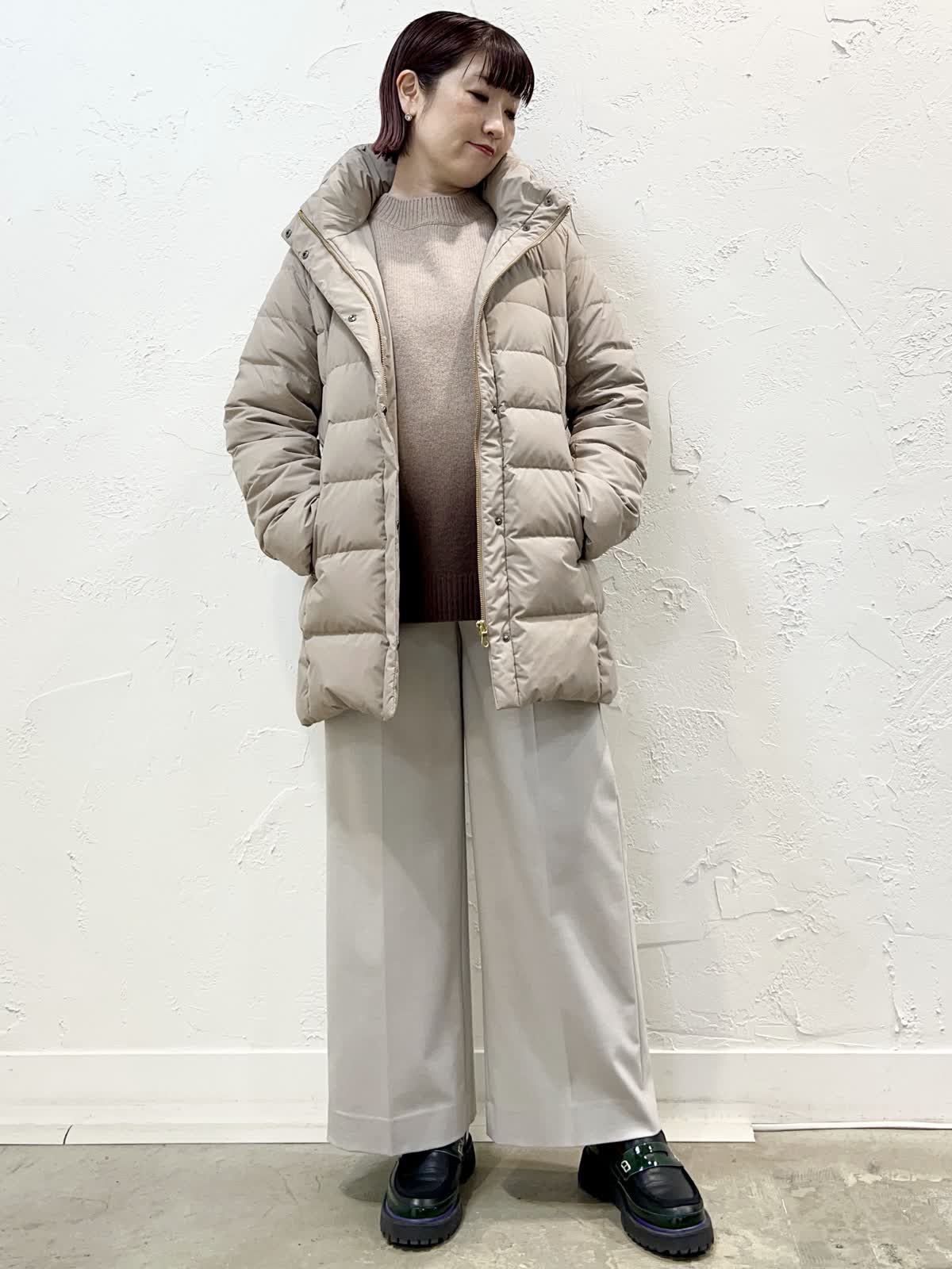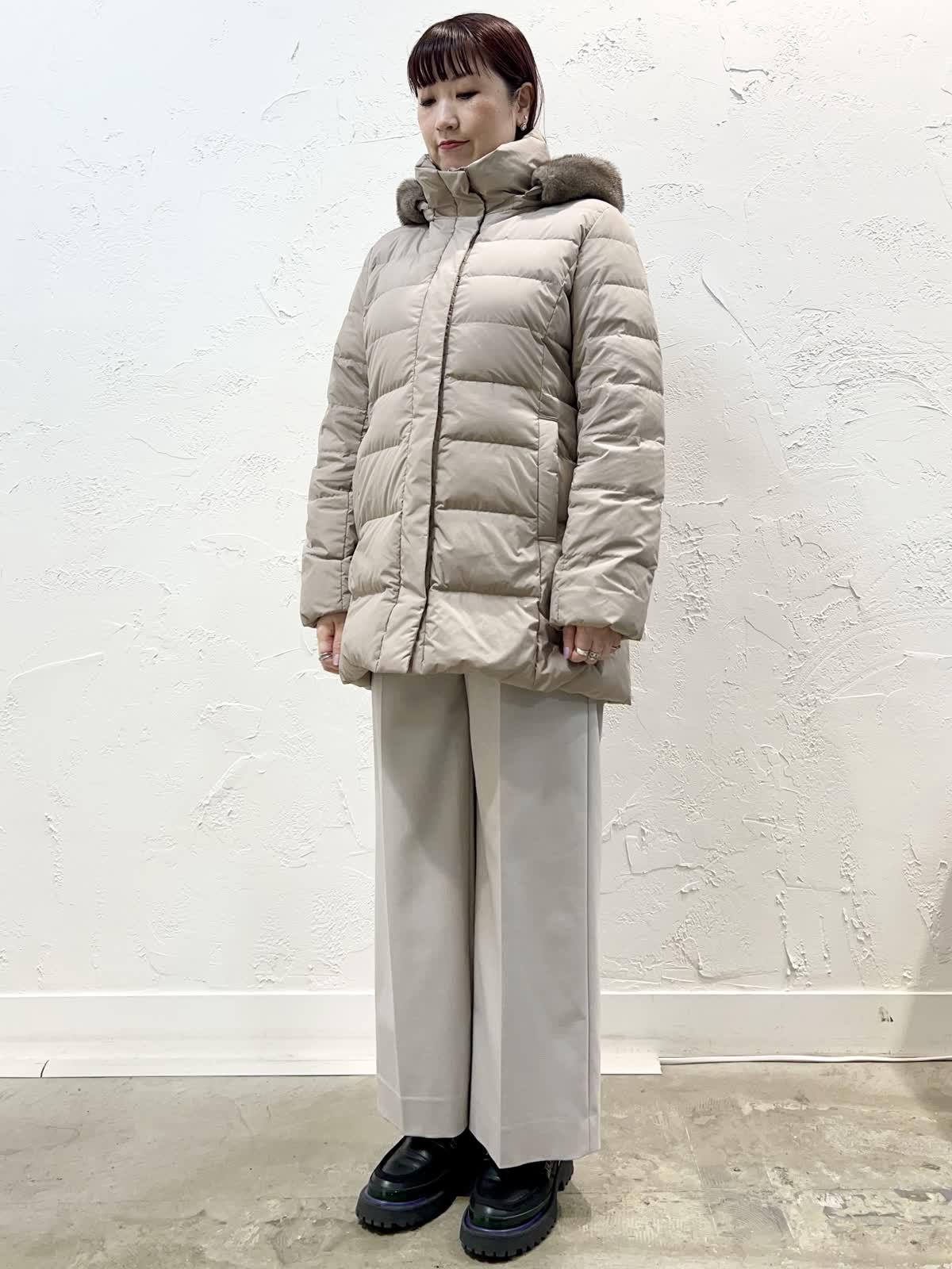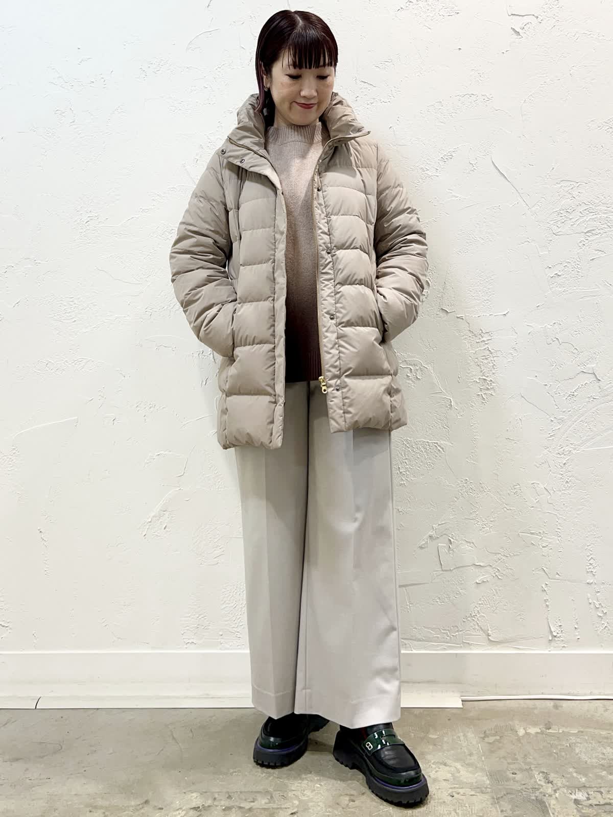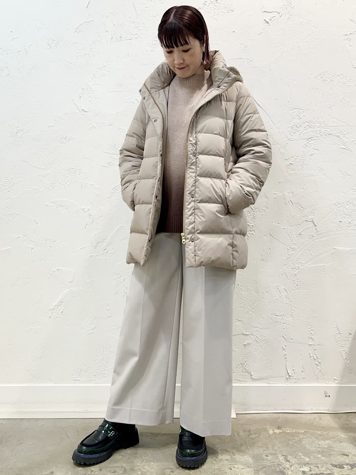 【着用サイズ/カラー】ダウン:11号/ベージュ ニット:9号/ブラウン パンツ:9号/ベージュ 『定番人気!ミドル丈ダウン』 [ダウン]飽きのこない定番ミドル丈のダウンです。表面はとても軽く微光沢の素材を使っています。ウエストが程よく絞られているのでダウンでもスッキリ見えます。フェイクファー部分だけ、フードごと、どちらも外せるのでシーンに合わせて使い分けが出来ます。サイズはやや細身でした。 [ニット]柔らかく膨らみのあるウール100%のニットです。軽く着心地が良いです。優しいブラウン系のグラデーションで一枚でサマになるデザインです。 [パンツ]ウール混で裏地付きのセミワイドパンツです。ウエストの後ろはゴムになっています。丈はやや短めですが、ウエストはいつものサイズで大丈夫だと思います。