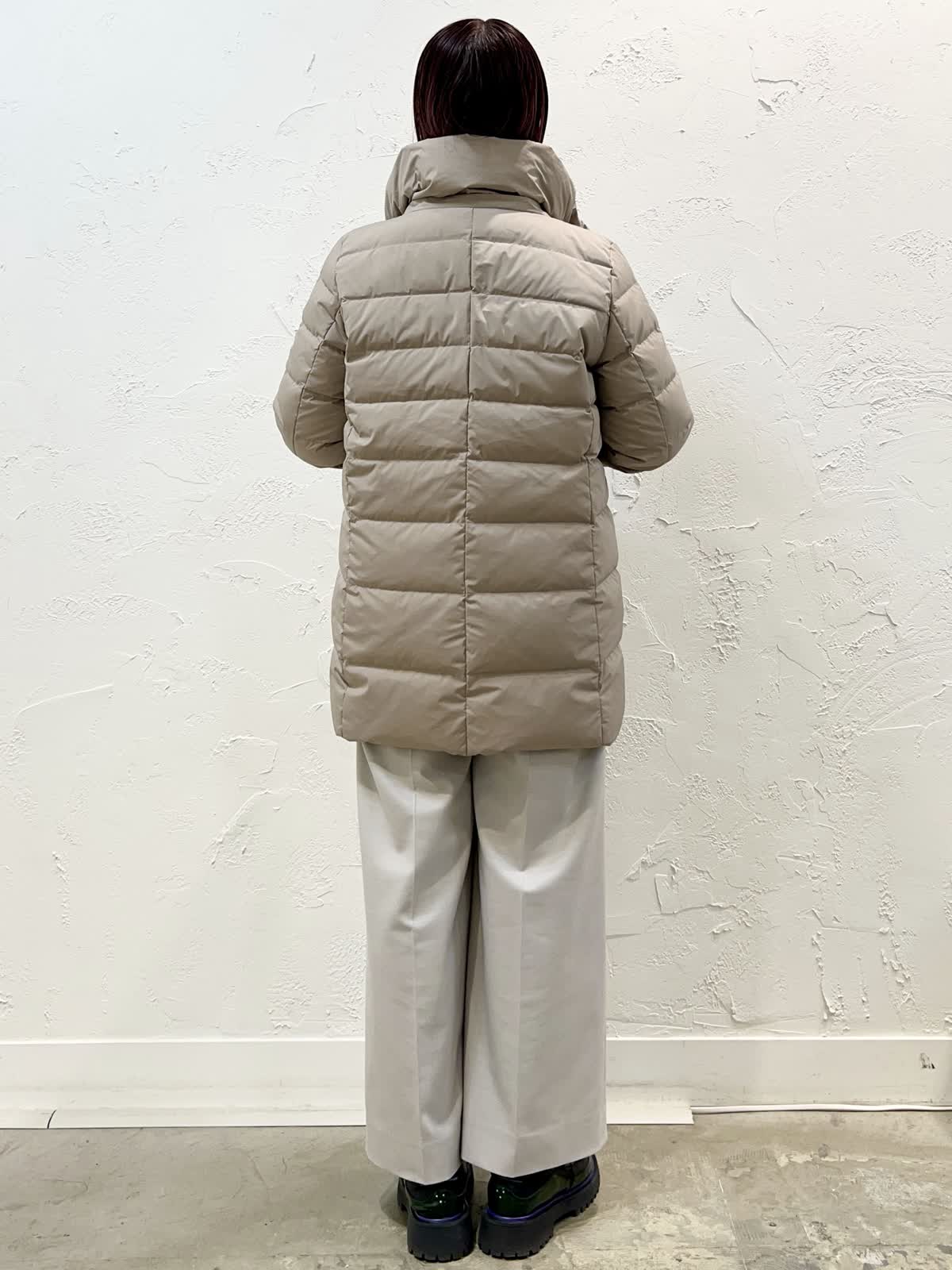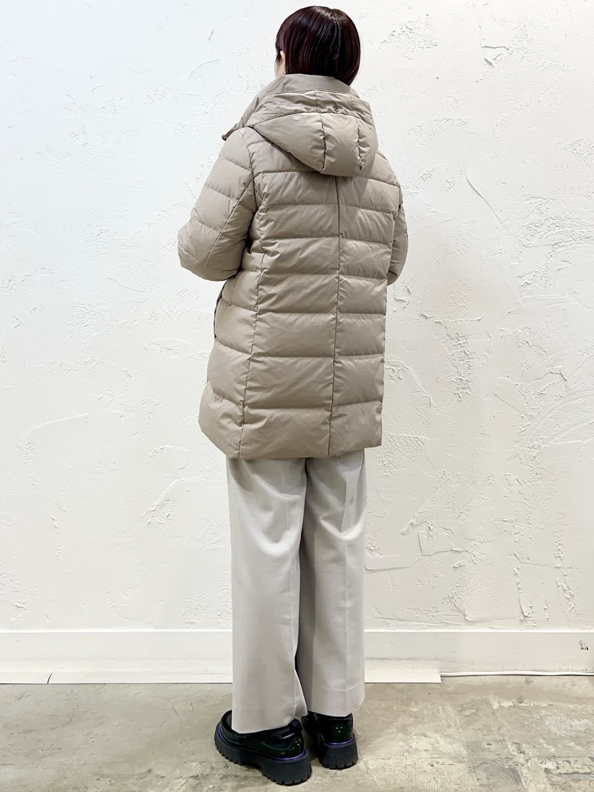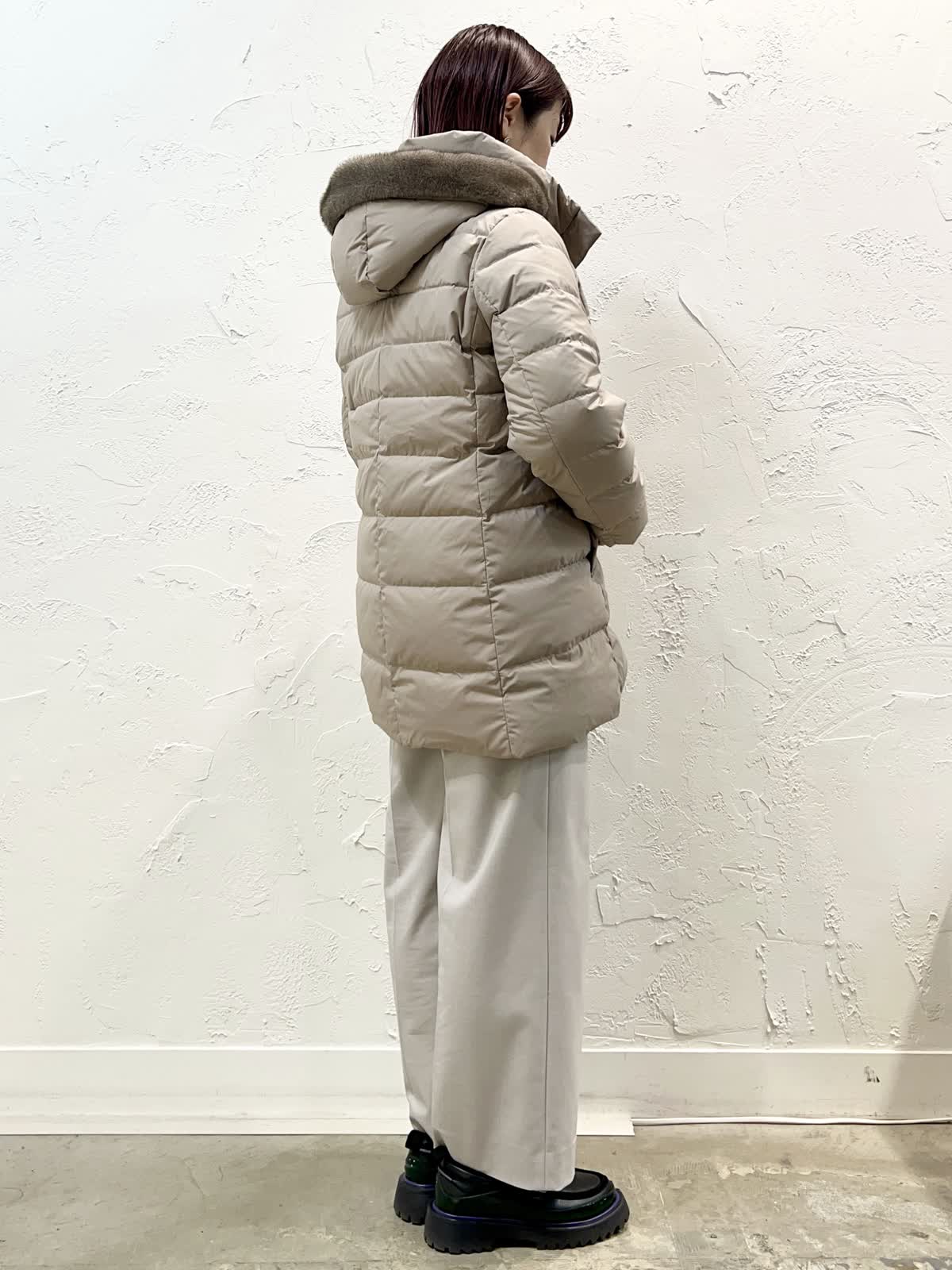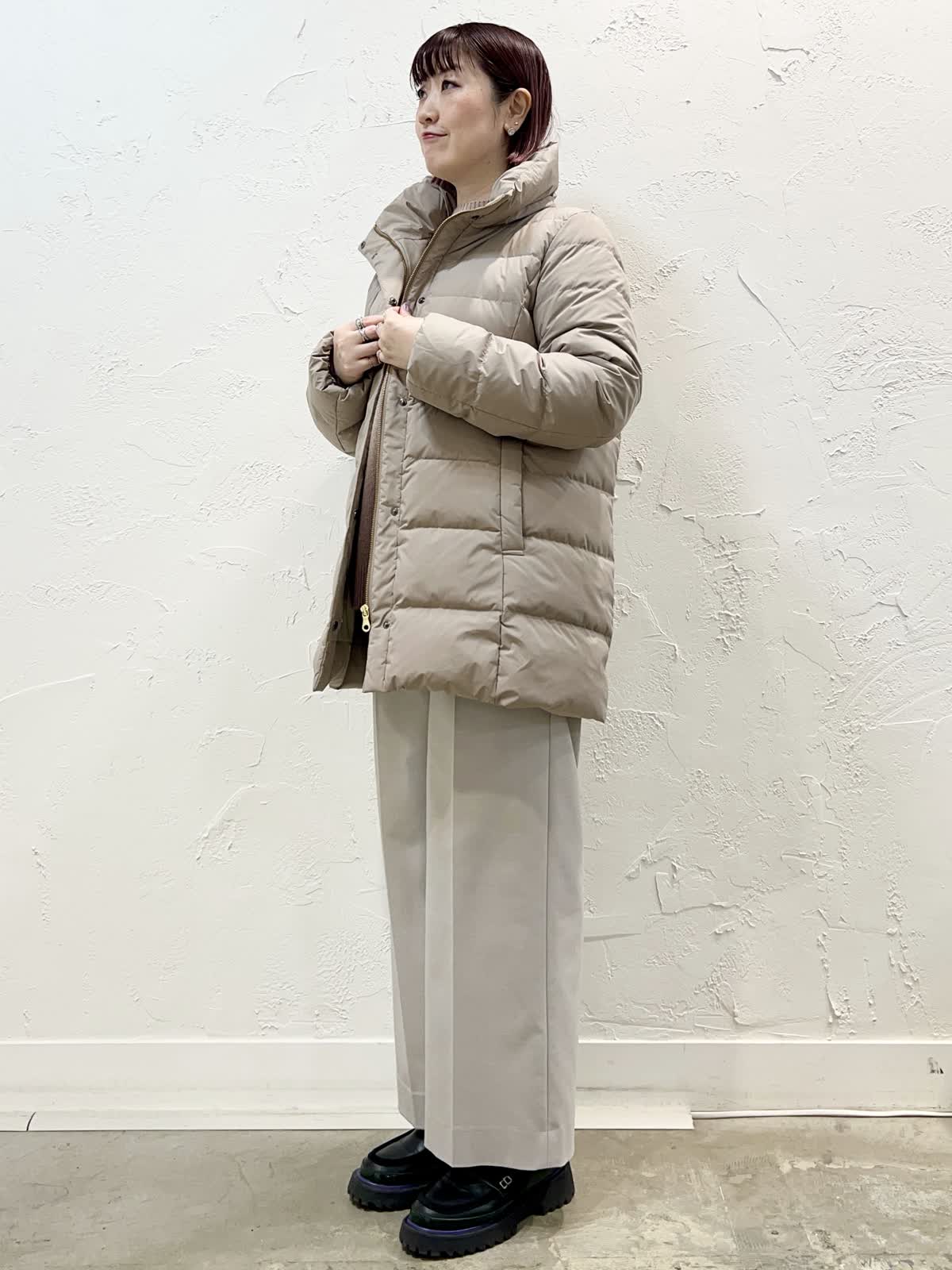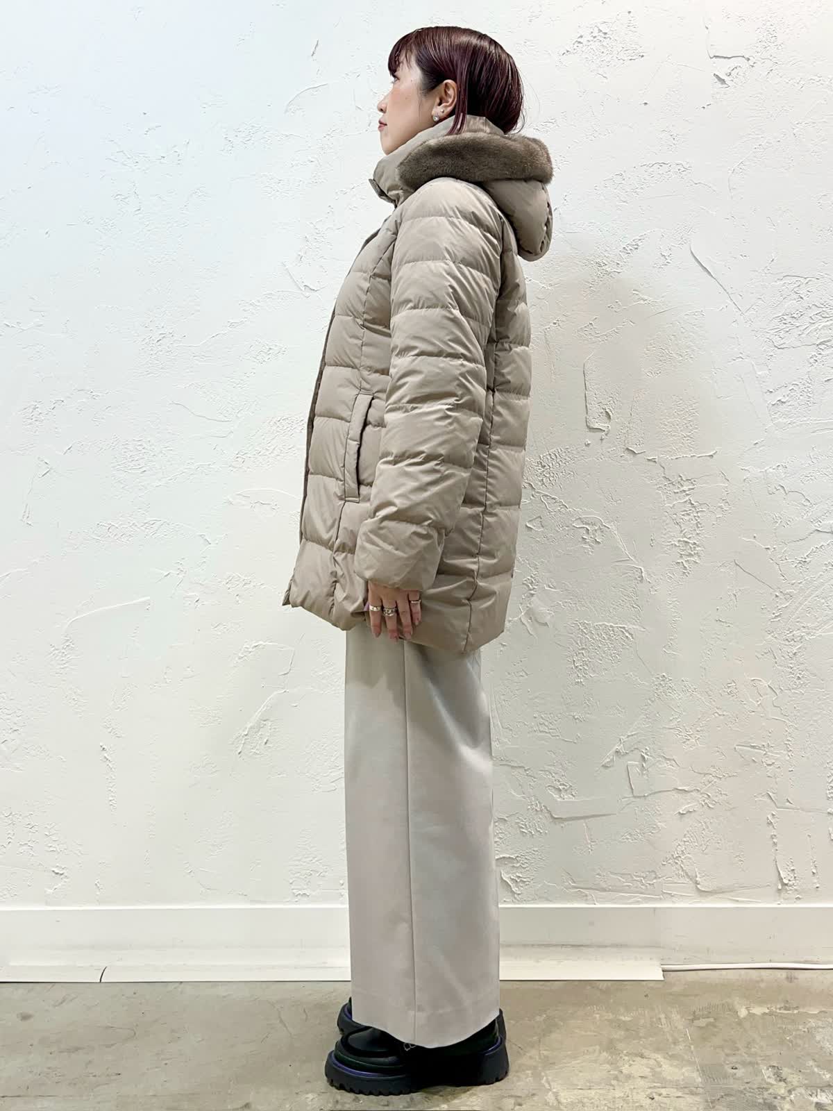 【着用サイズ/カラー】ダウン:11号/ベージュ ニット:9号/ブラウン パンツ:9号/ベージュ 『定番人気!ミドル丈ダウン』 [ダウン]飽きのこない定番ミドル丈のダウンです。表面はとても軽く微光沢の素材を使っています。ウエストが程よく絞られているのでダウンでもスッキリ見えます。フェイクファー部分だけ、フードごと、どちらも外せるのでシーンに合わせて使い分けが出来ます。サイズはやや細身でした。 [ニット]柔らかく膨らみのあるウール100%のニットです。軽く着心地が良いです。優しいブラウン系のグラデーションで一枚でサマになるデザインです。 [パンツ]ウール混で裏地付きのセミワイドパンツです。ウエストの後ろはゴムになっています。丈はやや短めですが、ウエストはいつものサイズで大丈夫だと思います。