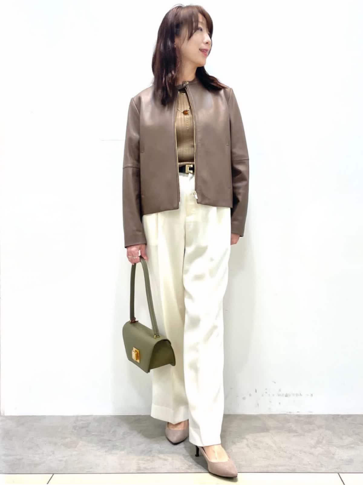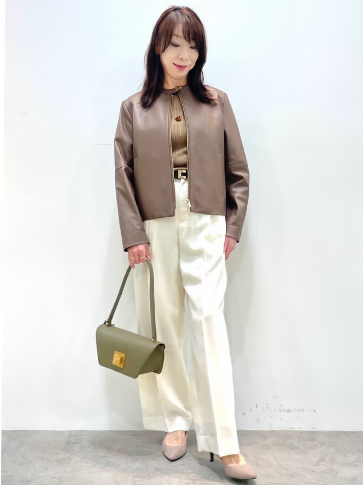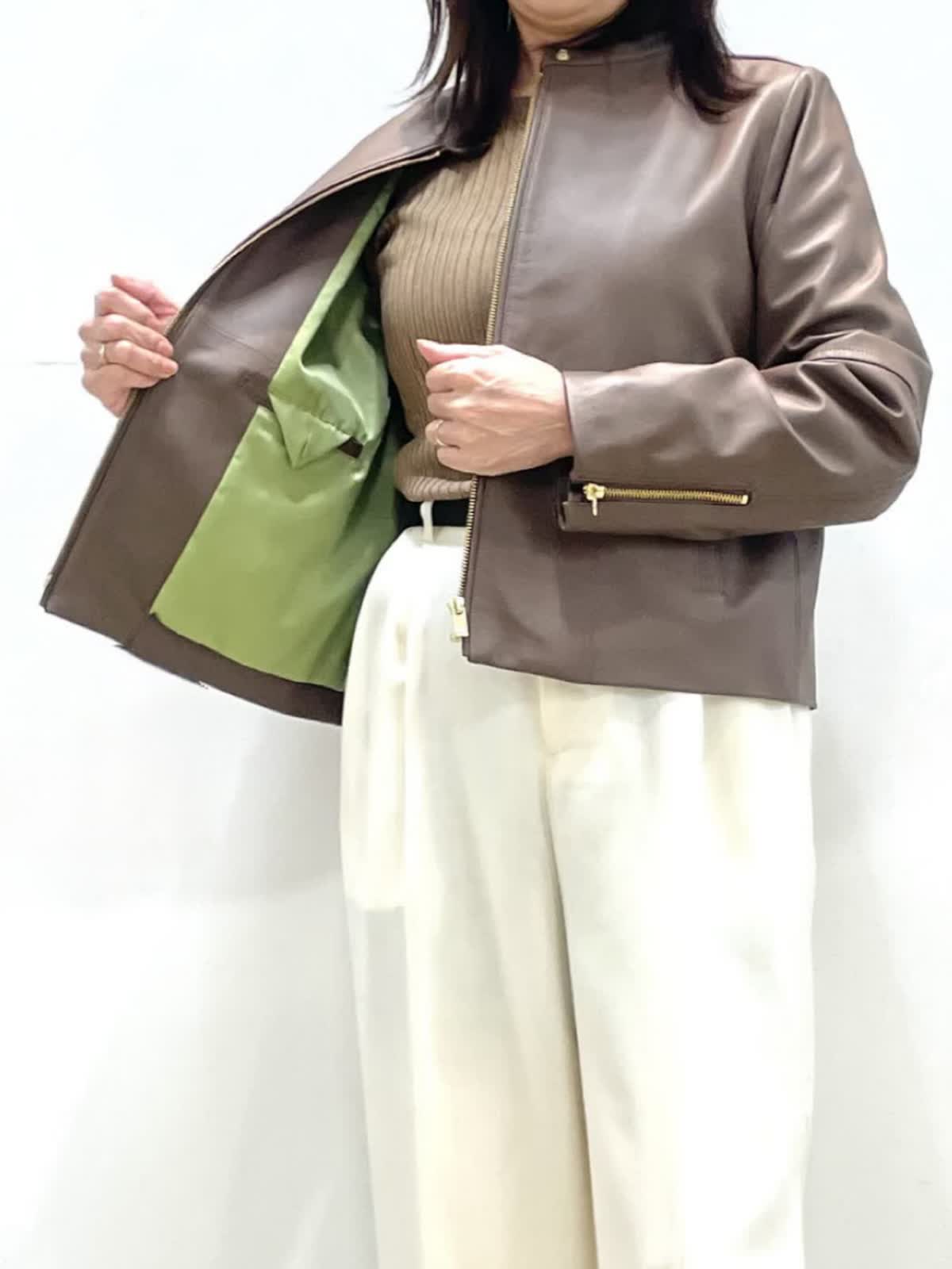 【着用サイズ】全て9号 【着用カラー】ブルゾン:ブラウン ニット:モカチャ パンツ:オフホワイト ハードになりすぎないレザーコーデ。上品な光沢感のラムレザーブルゾン。柔らかい着心地、アームホールがゆったり目なので厚手ニットにも楽に羽織れます。ベーシックなデザインでカジュアルにも綺麗目にも幅広く着用いただけます。オフホワイトのパンツはトップスを選ばず、着こなしを華やかに見せてくれる万能な一着です。