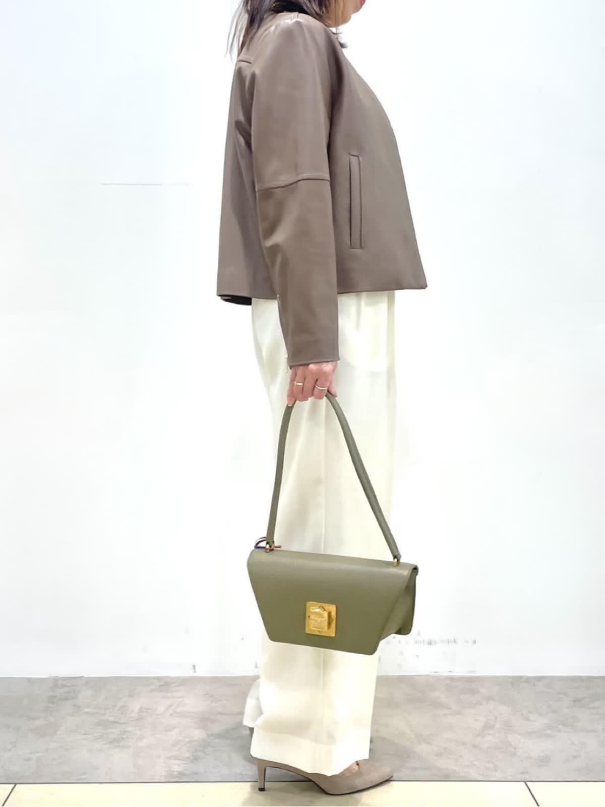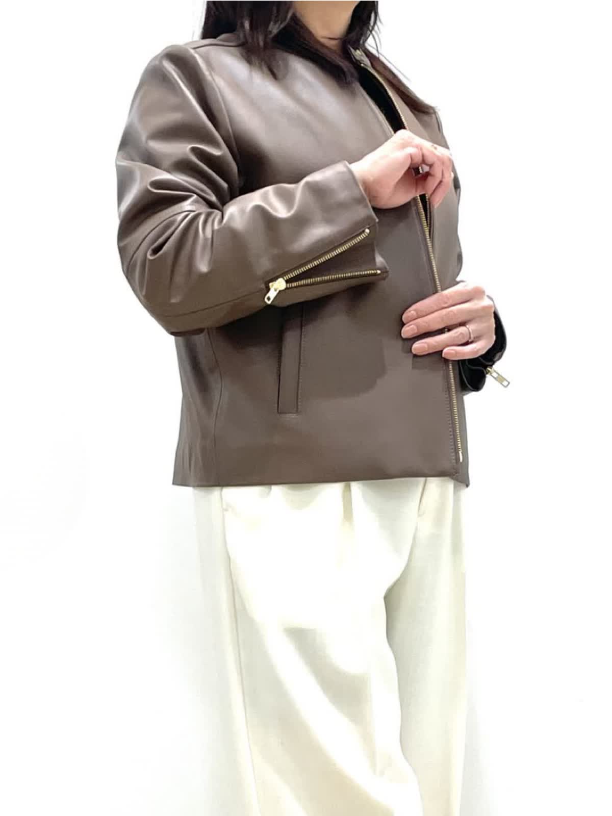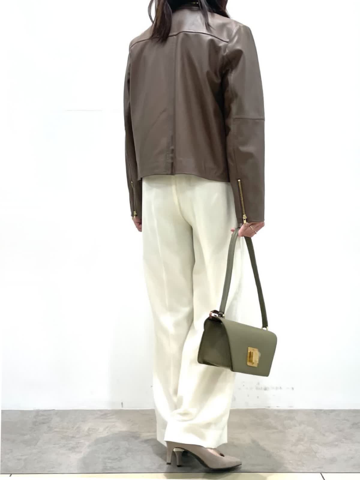 【着用サイズ】全て9号 【着用カラー】ブルゾン:ブラウン ニット:モカチャ パンツ:オフホワイト ハードになりすぎないレザーコーデ。上品な光沢感のラムレザーブルゾン。柔らかい着心地、アームホールがゆったり目なので厚手ニットにも楽に羽織れます。ベーシックなデザインでカジュアルにも綺麗目にも幅広く着用いただけます。オフホワイトのパンツはトップスを選ばず、着こなしを華やかに見せてくれる万能な一着です。