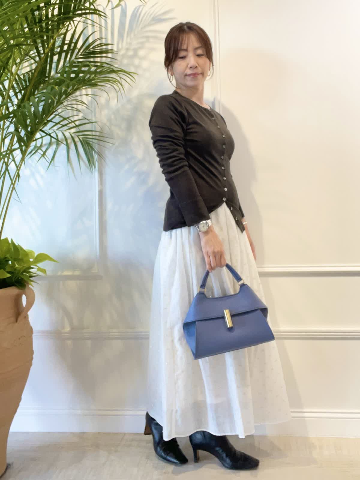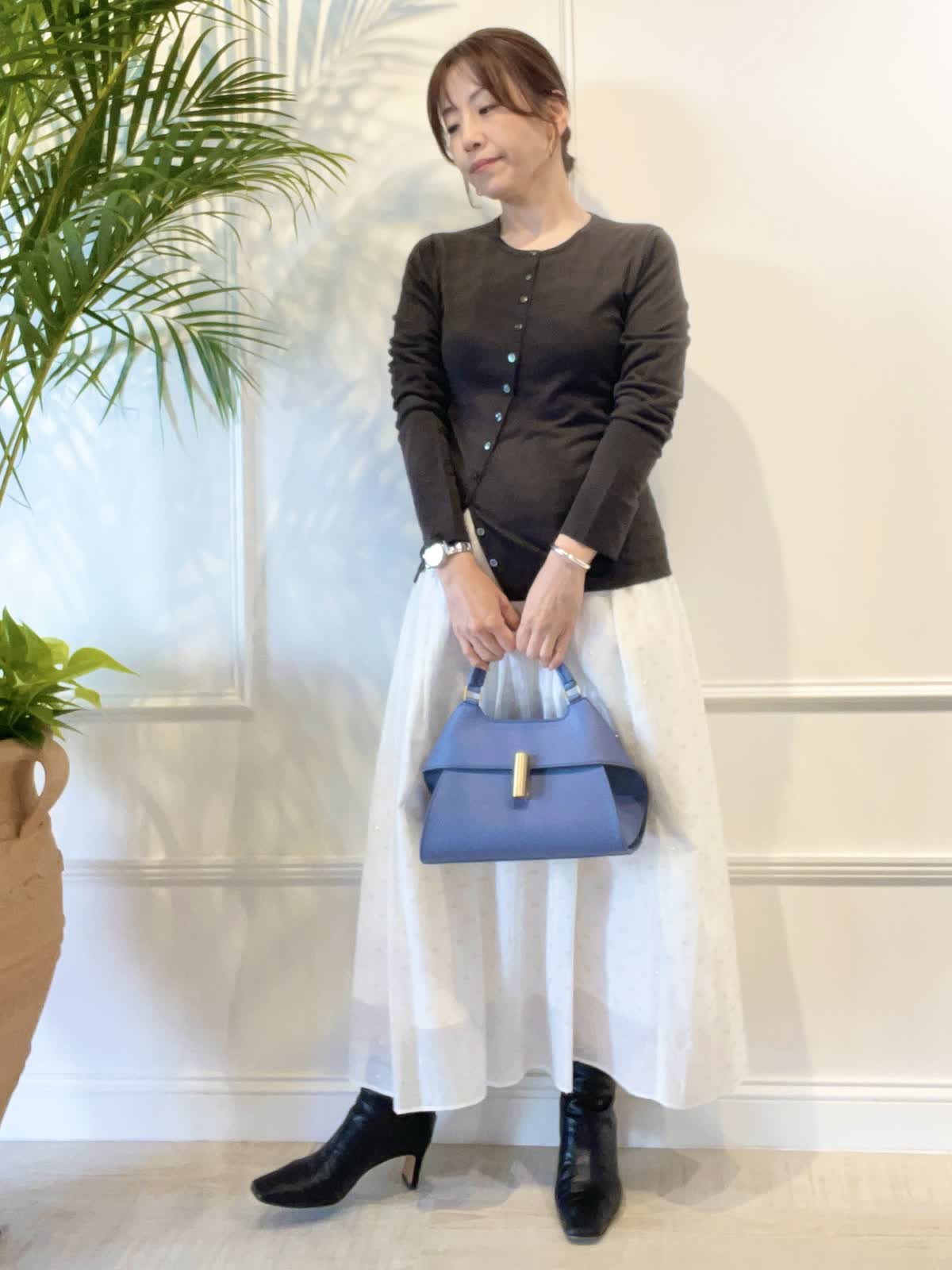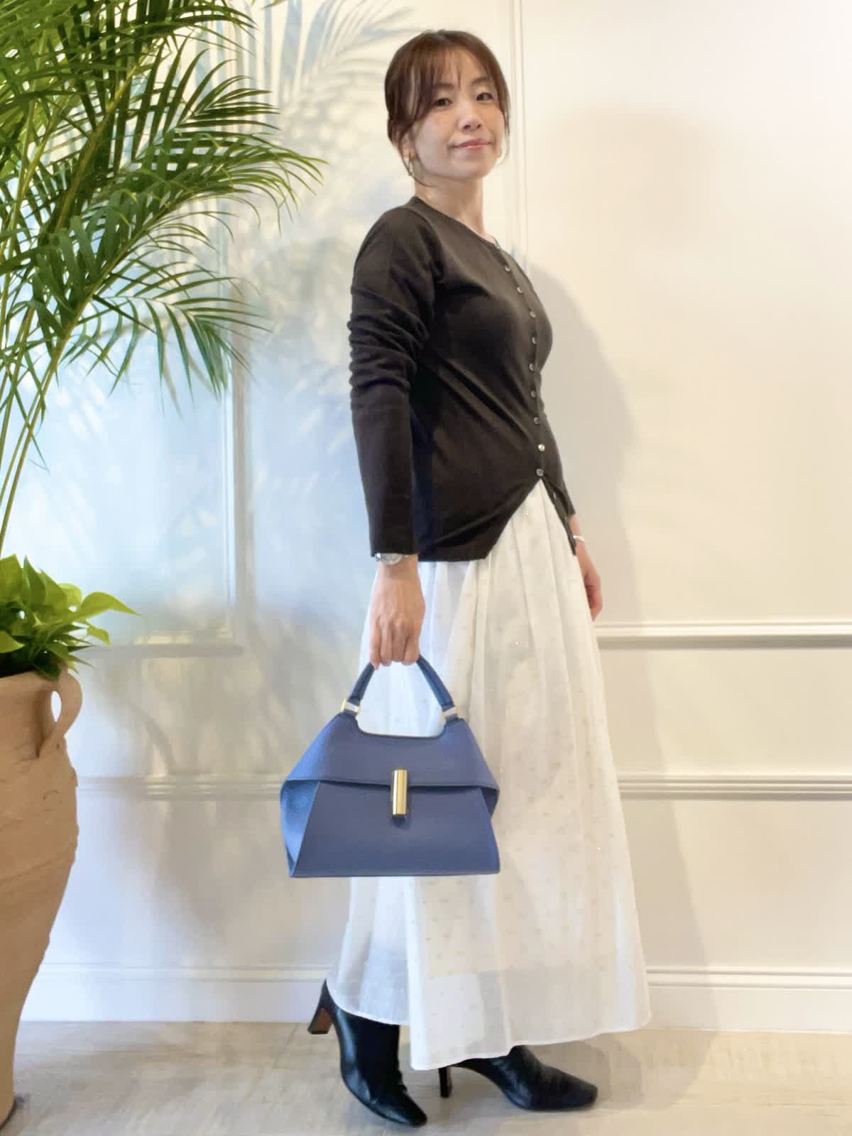 【着用アイテム:カラー/サイズ】 カーディガン:ブラウン/9号 スカート:オフホワイト/9号 バッグ:ブルー ボタン部分がアシンメトリーになったひとクセありのカーディガン。ラメドットのギャザースカートを合わせてフェミニンなスタイルにしました。コロンとしたARCADIAのバッグを合わせて上品さをプラス。