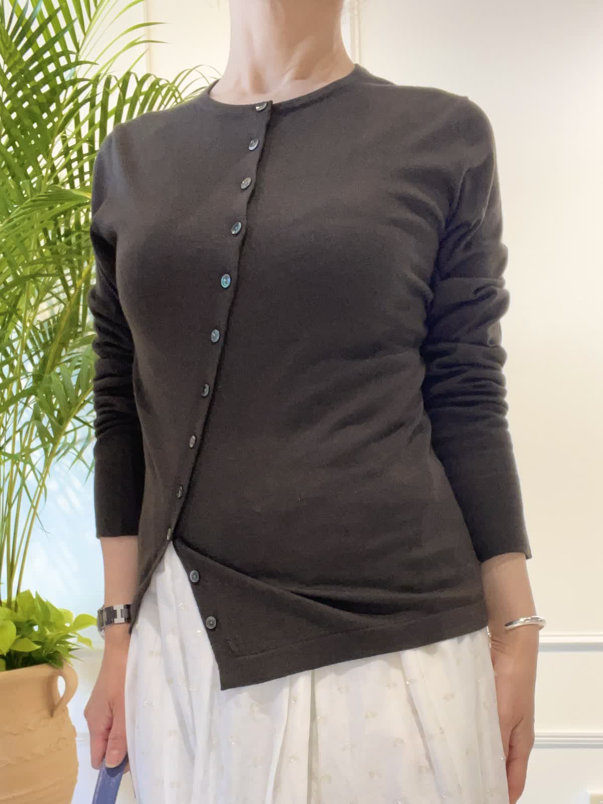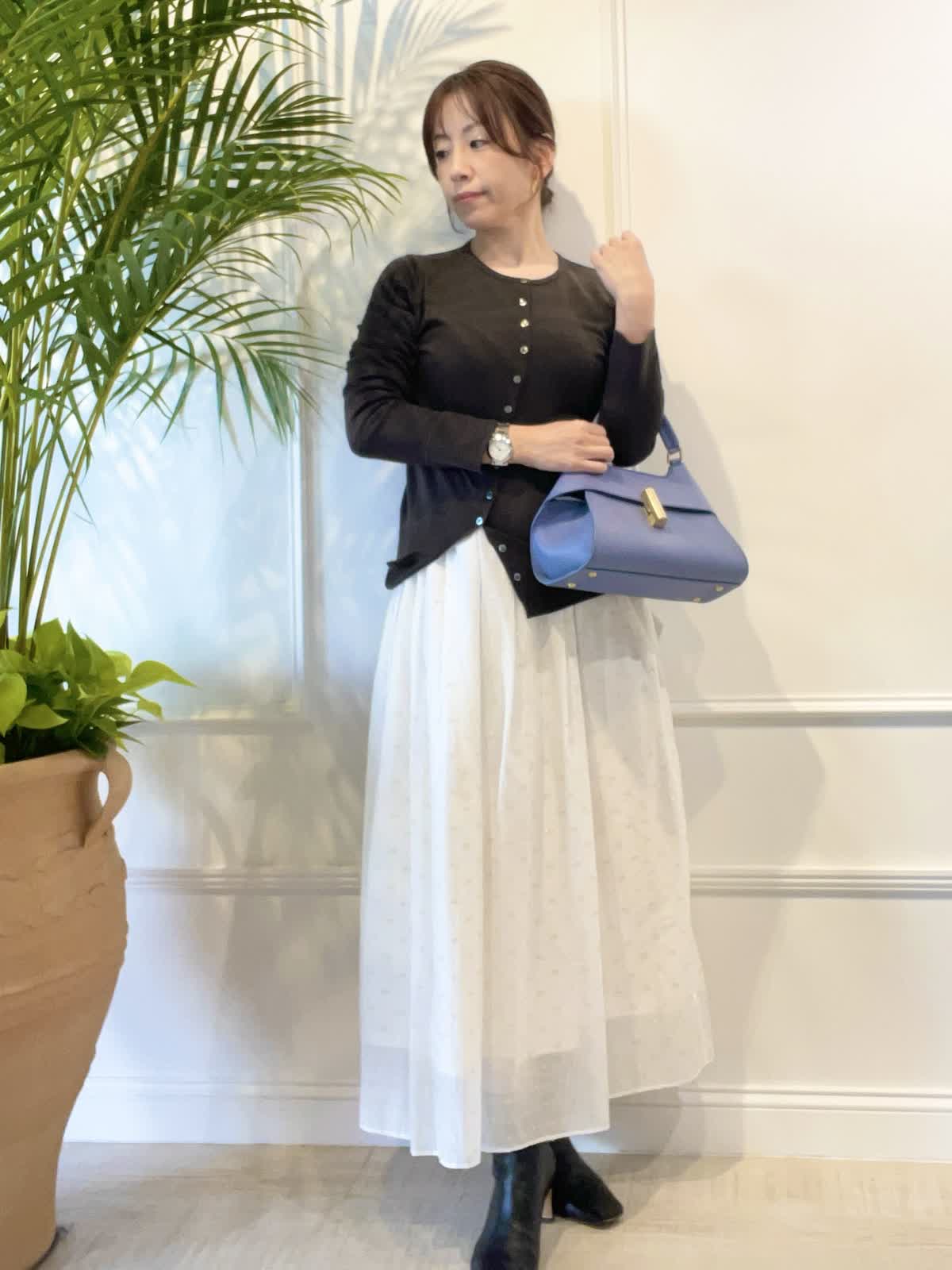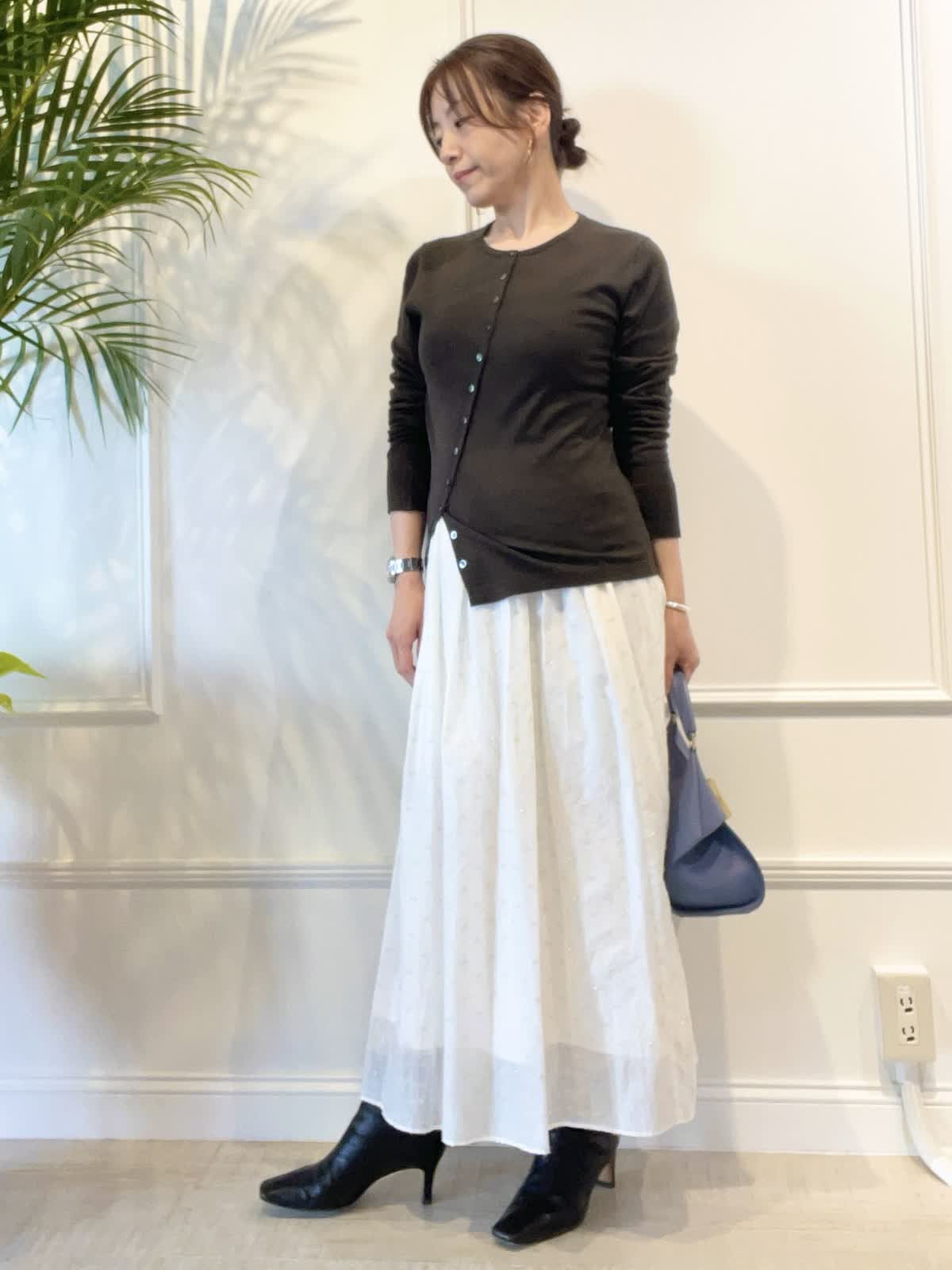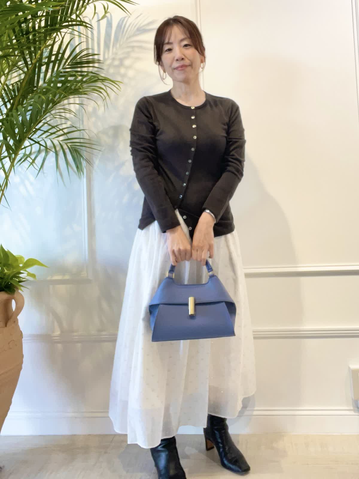 【着用アイテム:カラー/サイズ】 カーディガン:ブラウン/9号 スカート:オフホワイト/9号 バッグ:ブルー ボタン部分がアシンメトリーになったひとクセありのカーディガン。ラメドットのギャザースカートを合わせてフェミニンなスタイルにしました。コロンとしたARCADIAのバッグを合わせて上品さをプラス。