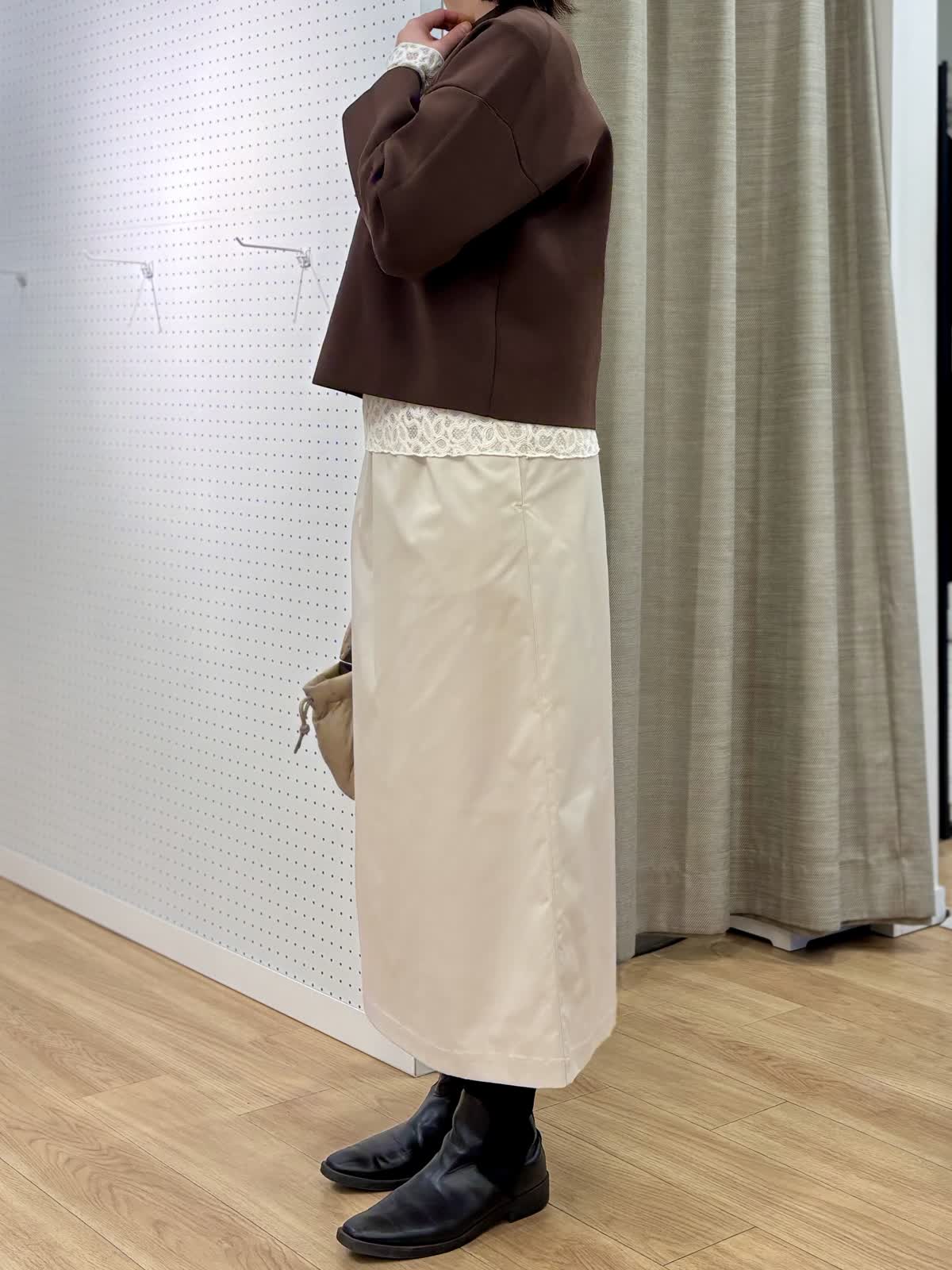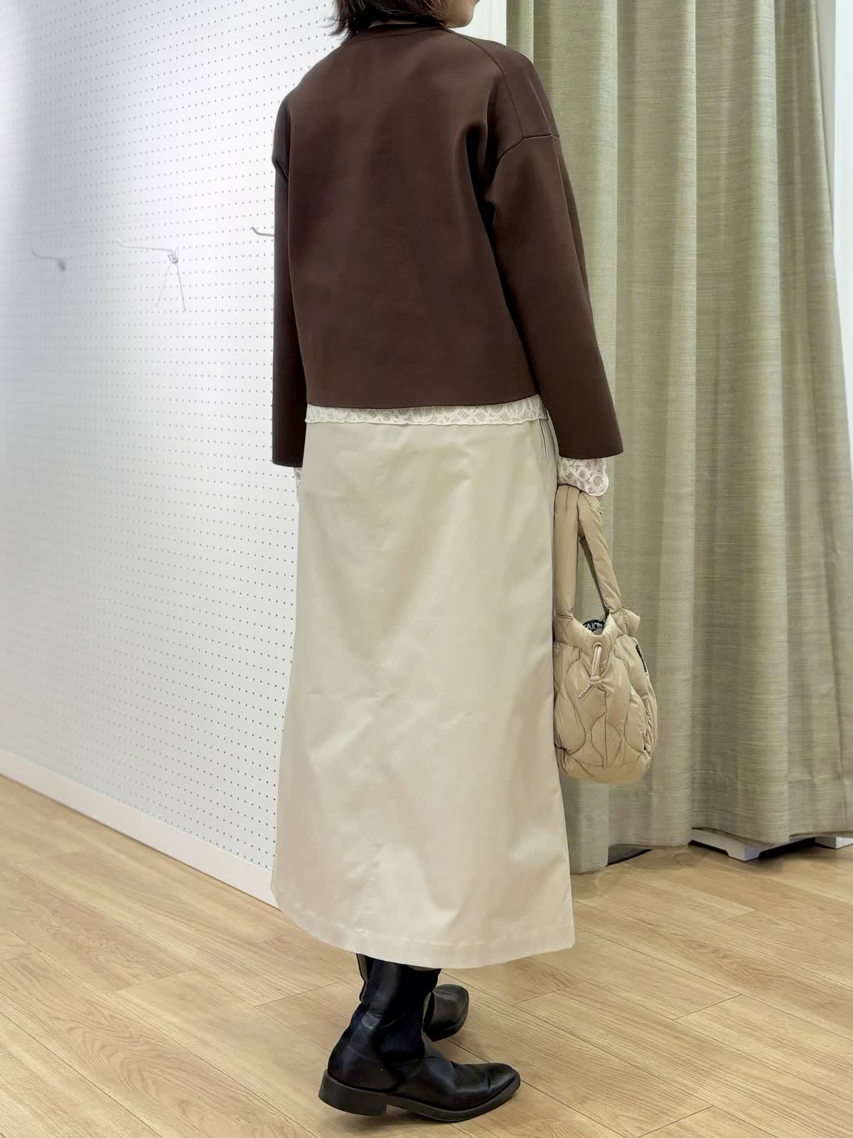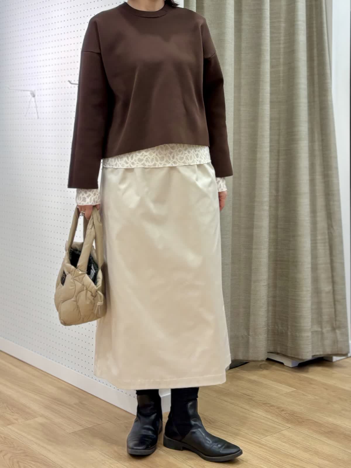 【着用カラー/サイズ】 ニット:ブラウン/フリー カットソー:アイボリー/9号 スカート:ベージュ/9号 春まで着られるレイヤードコーデ。スポンディッシュなスエット風ニットはとても軽い素材で大人カジュアルな着こなしにオススメです。レイヤードには欠かせないレースのカットソーは袖口と裾だけがレースなのでポイント使いに便利。ウエスト総ゴムのスカートは広がり過ぎないAラインのシルエットが全体のバランスを程良くまとめます。