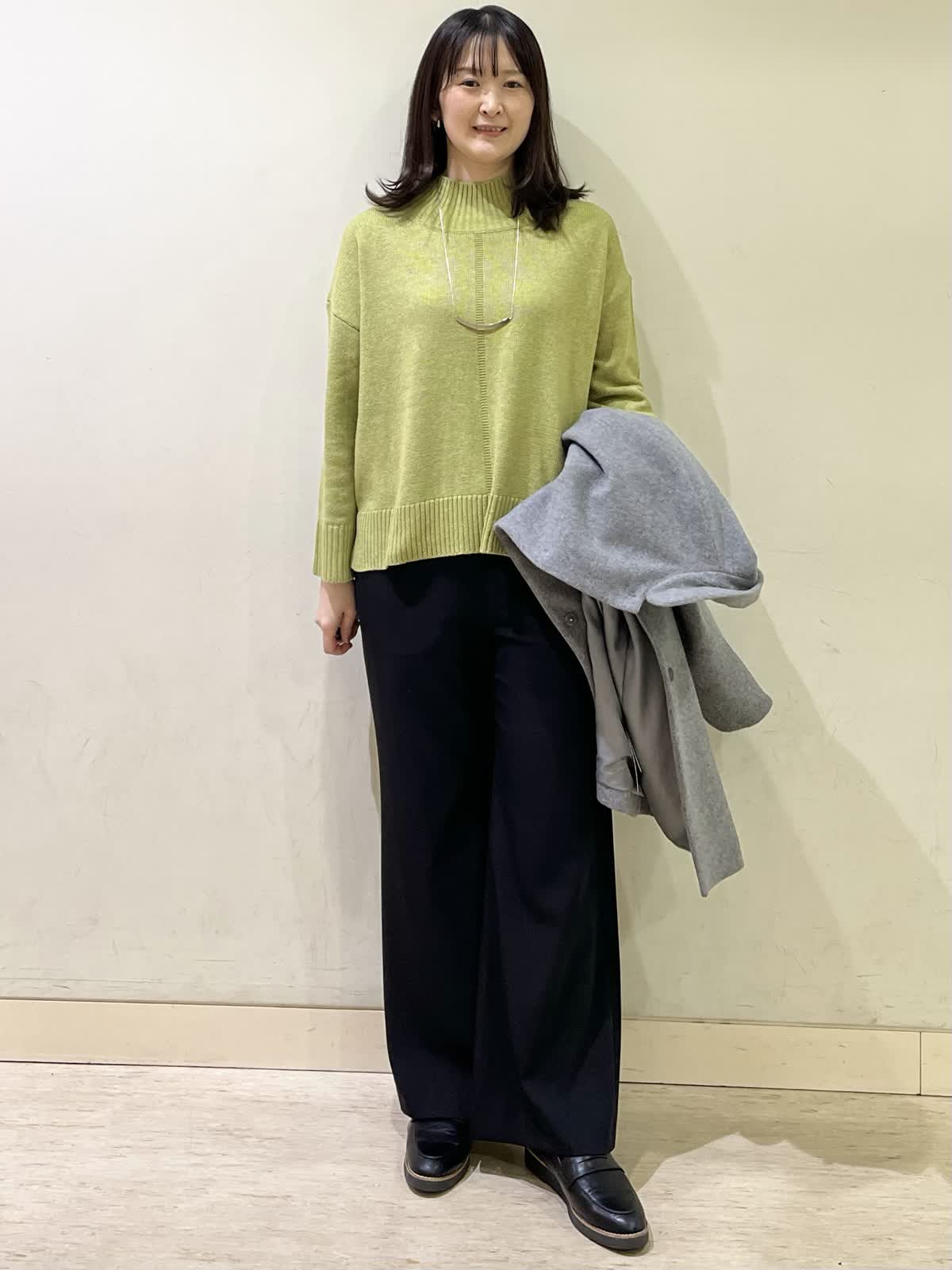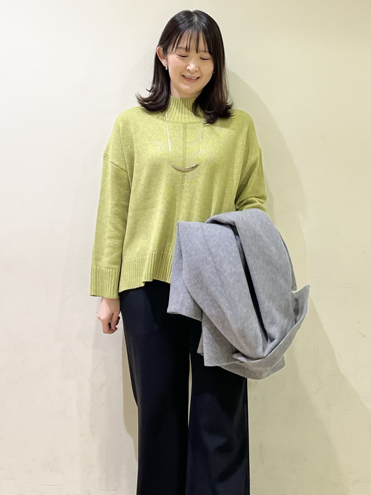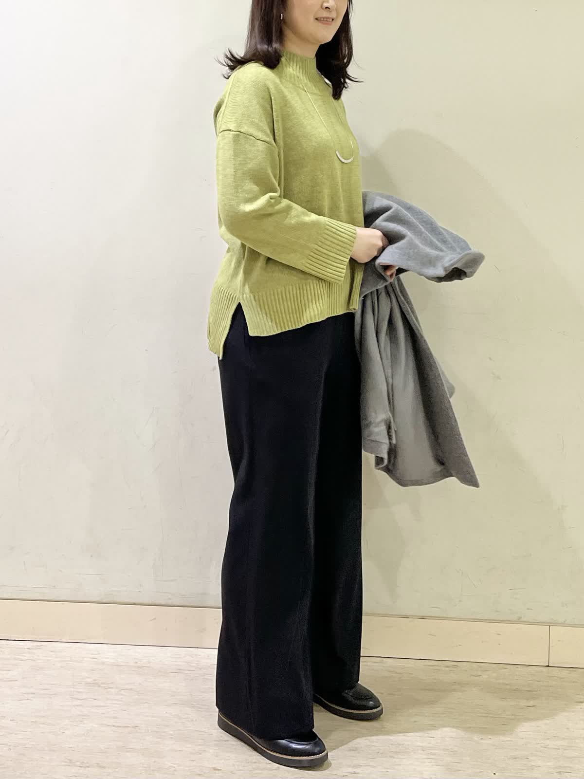 【着用カラー/サイズ】コート:グレー/フリー セーター:イエロー/ フリー パンツ:ブラック/11号 おすすめオフィスコーデ。イエローのセーターは、少しグリーンがかった色味です。モコモコしていないセーターなので、オフィスコーデにもおすすめです。合わせたパンツは、履き心地ストレスフリーのフレアパンツです。さらさらとした生地で合わせるだけで、全体的がキレイめにまとまります。 ステンカラーコートは、グレーをチョイス。春めいた時期にも合わせやすい1着です。