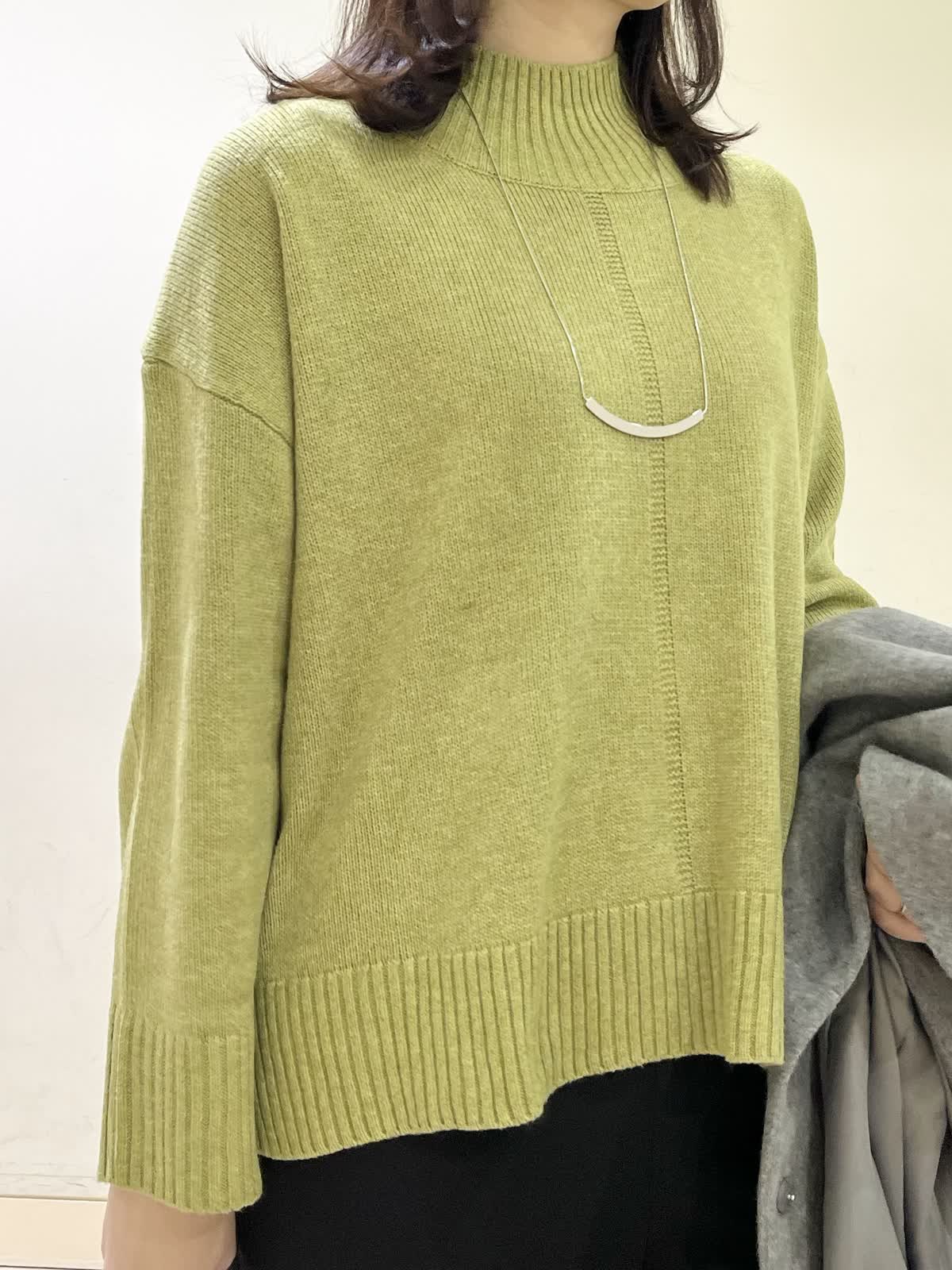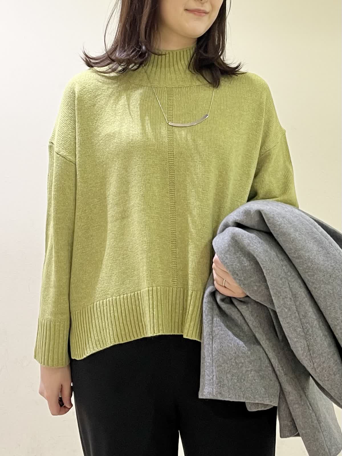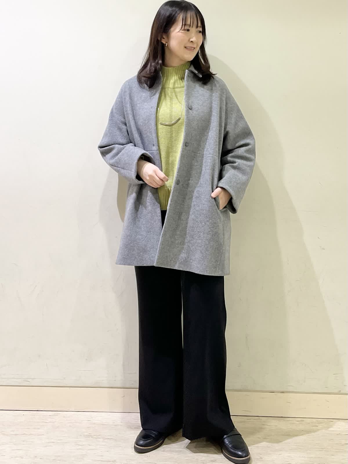 【着用カラー/サイズ】コート:グレー/フリー セーター:イエロー/ フリー パンツ:ブラック/11号 おすすめオフィスコーデ。イエローのセーターは、少しグリーンがかった色味です。モコモコしていないセーターなので、オフィスコーデにもおすすめです。合わせたパンツは、履き心地ストレスフリーのフレアパンツです。さらさらとした生地で合わせるだけで、全体的がキレイめにまとまります。 ステンカラーコートは、グレーをチョイス。春めいた時期にも合わせやすい1着です。