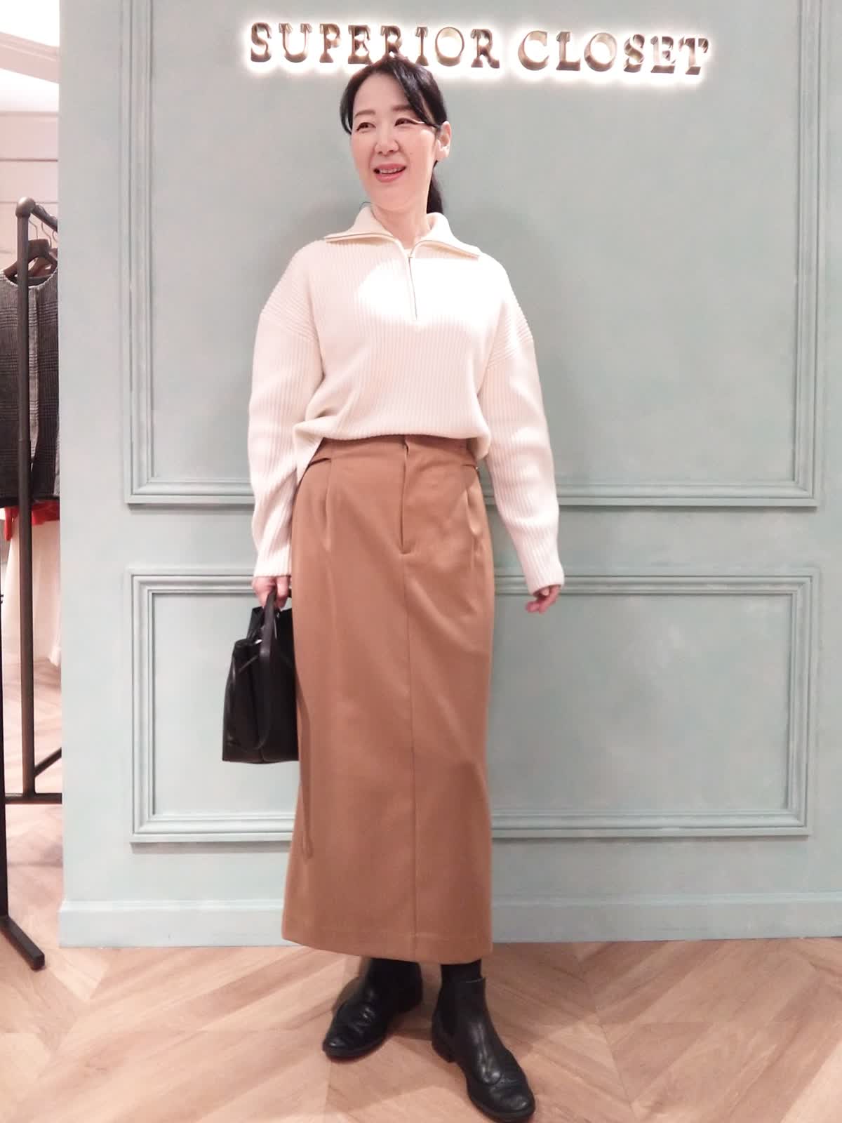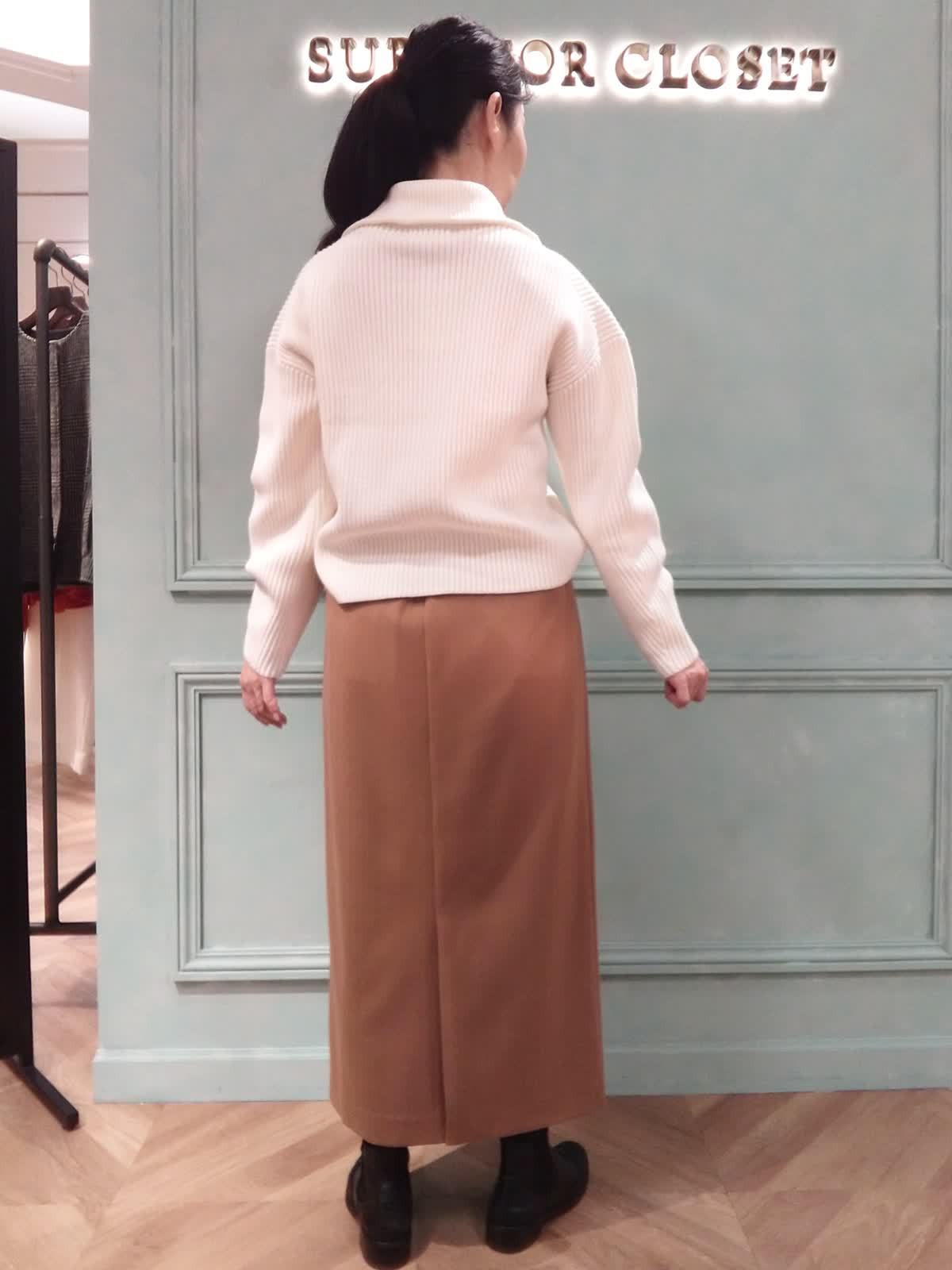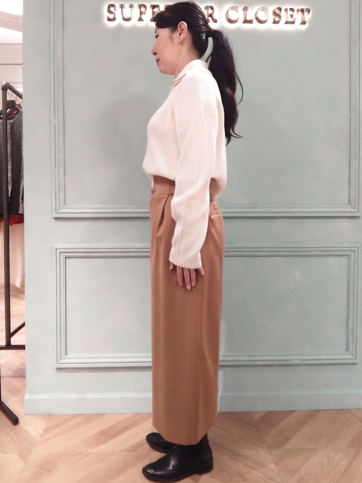 【着用サイズ】ニット:9号、スカート:9号 【着用カラー】ニット:オフホワイト、スカート:キャメル オフィスカジュアルスタイル。オフィスには清潔感のあるハーフジップの白のニットとキャメルのタイトスカートのコーディネート。ニットは袖が少しカーヴィーなシルエットがポイントで裾はスカートにウエストイン、アウトどちらも着こなせる着丈です。スカートはフロントタックがあり、ぴったりし過ぎないシルエット。ストレッチ性があり動きやすく、またウール混で暖かい履き心地です。