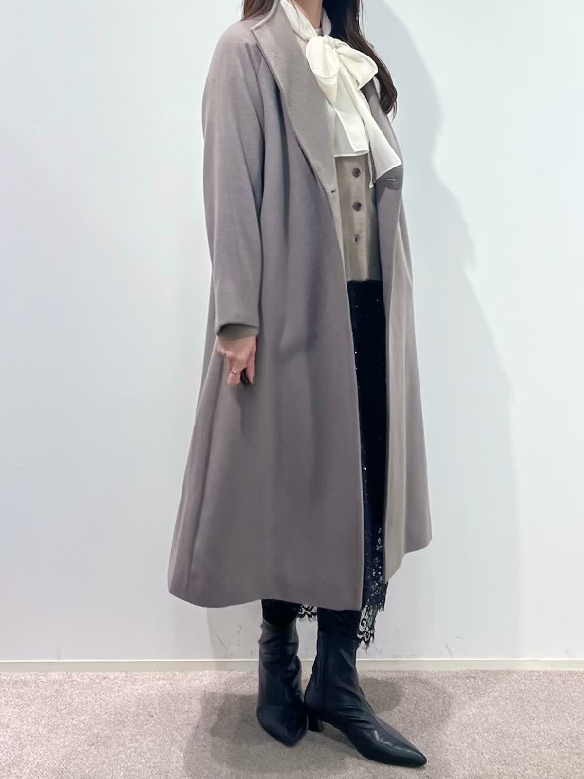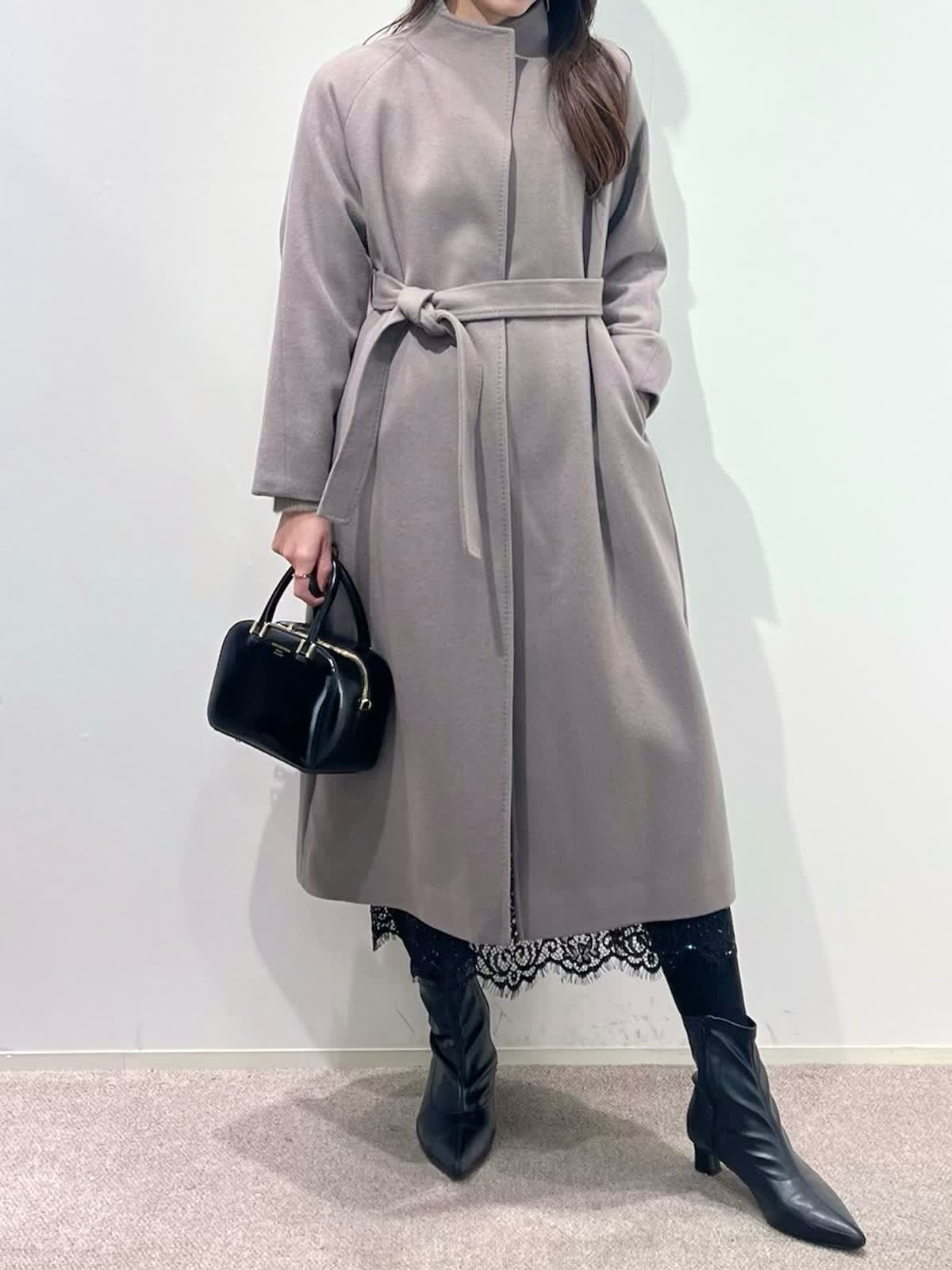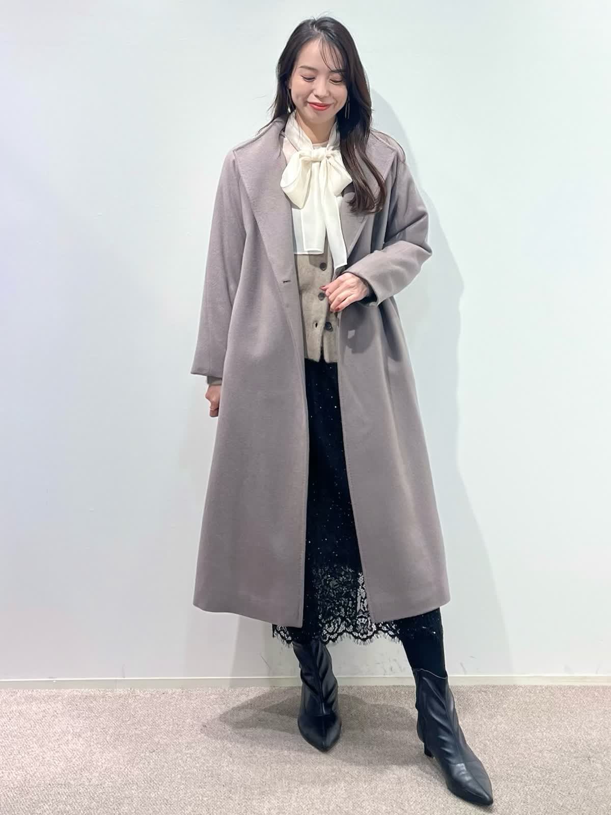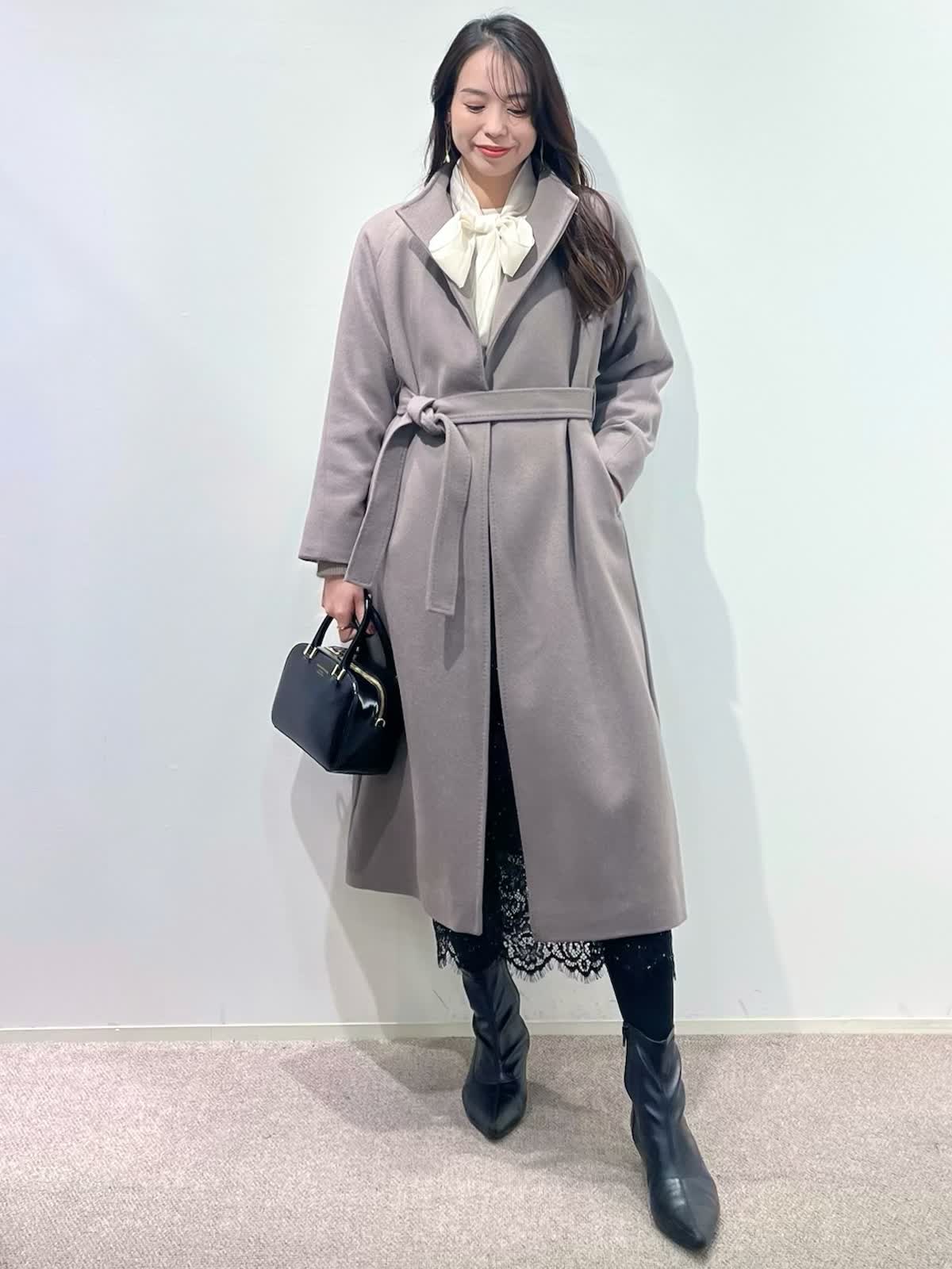 【着用サイズ】全て9号 【着用カラー】コート: グレーベージュ カーディガン:ベージュ ブラウス:アイボリー スカート:ブラック バッグ:ブラック 「休日も通勤も万能、きれいめ淡色コートスタイル」 羽織るだけできちんと決まるロングコート。襟元は高すぎないスタンドカラーで、シャープで上品な印象に。ウエストマークのベルトでスタイルアップや、前を開けてラフにも着こなせるデザイン。スタイリングは、ラクーンニットカーディガン×ボウタイスタイル。ボトムはスパンコールが華やかなレーススカートでお出かけスタイルに。きれいめ淡色カラーのコートに、大人ベーシックカラーで上品な印象に決まるおすすめコーデです。