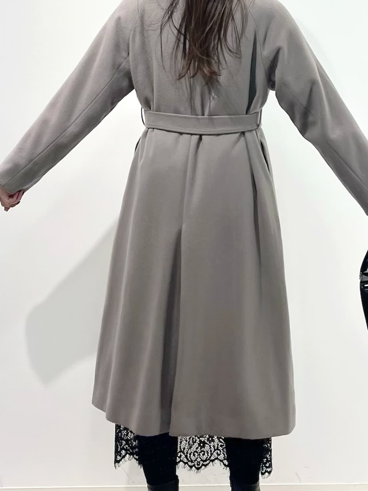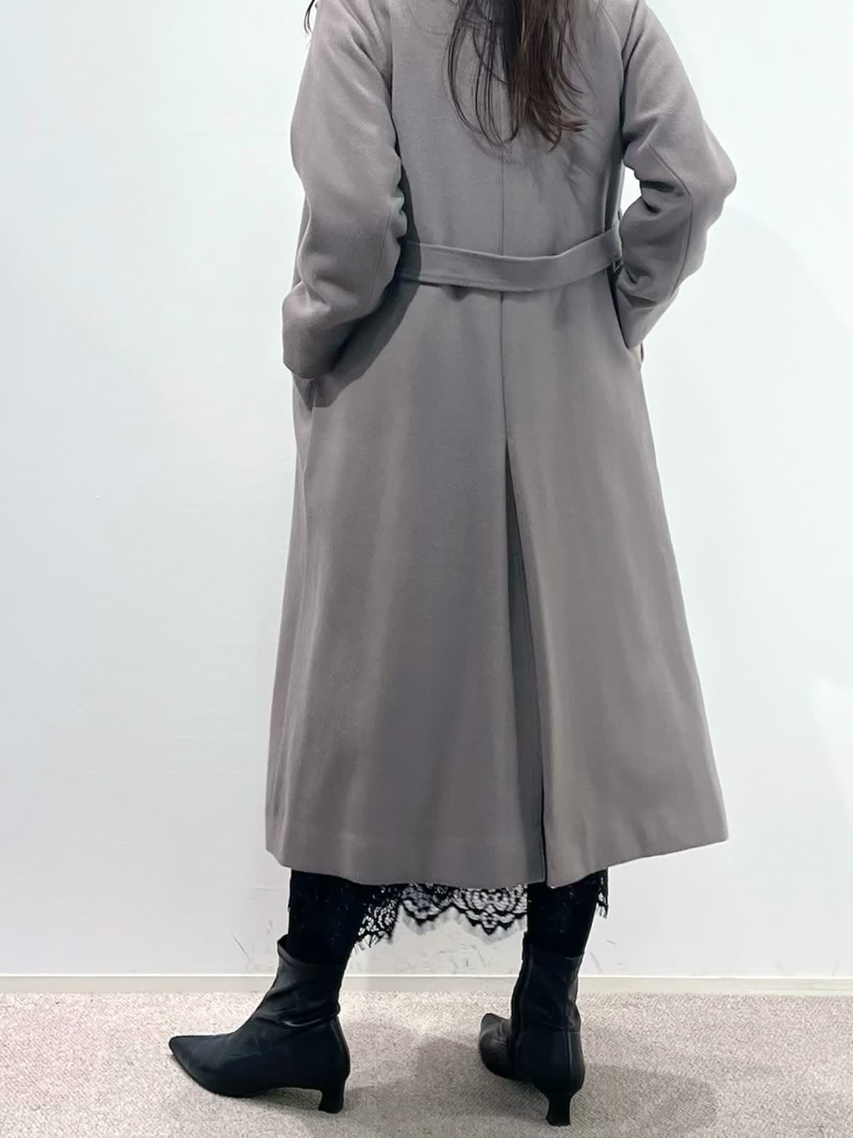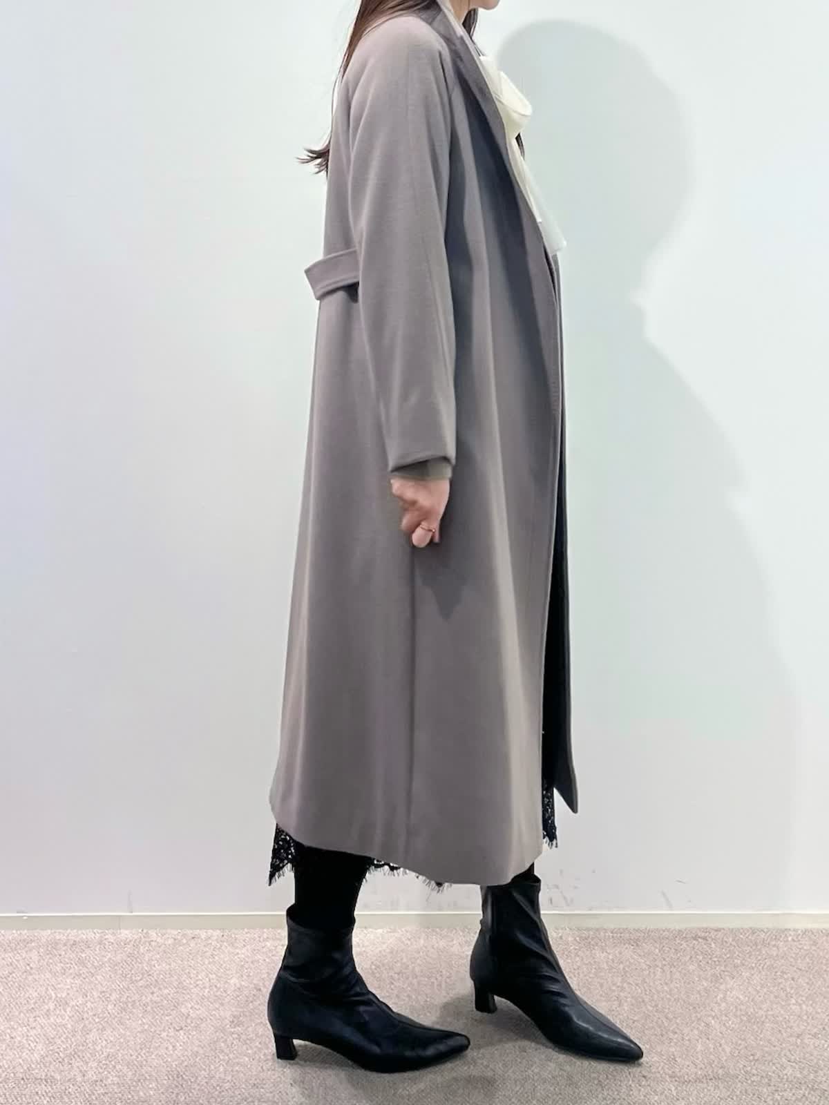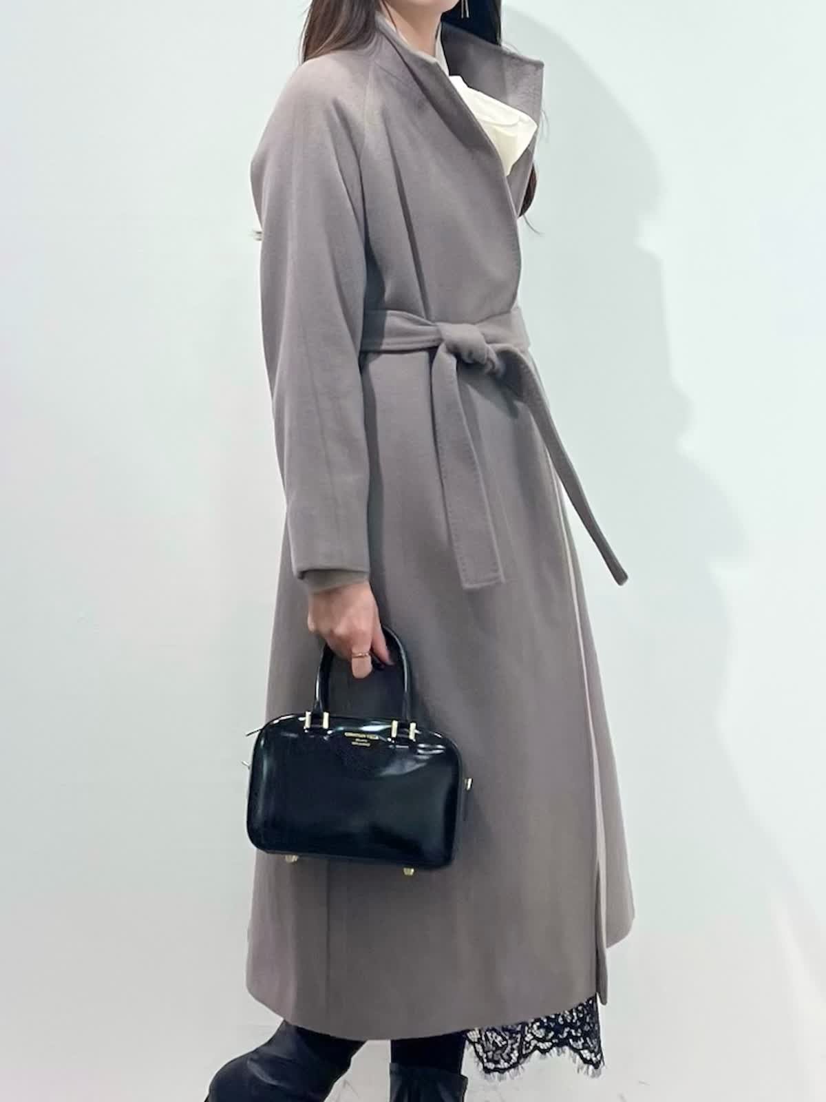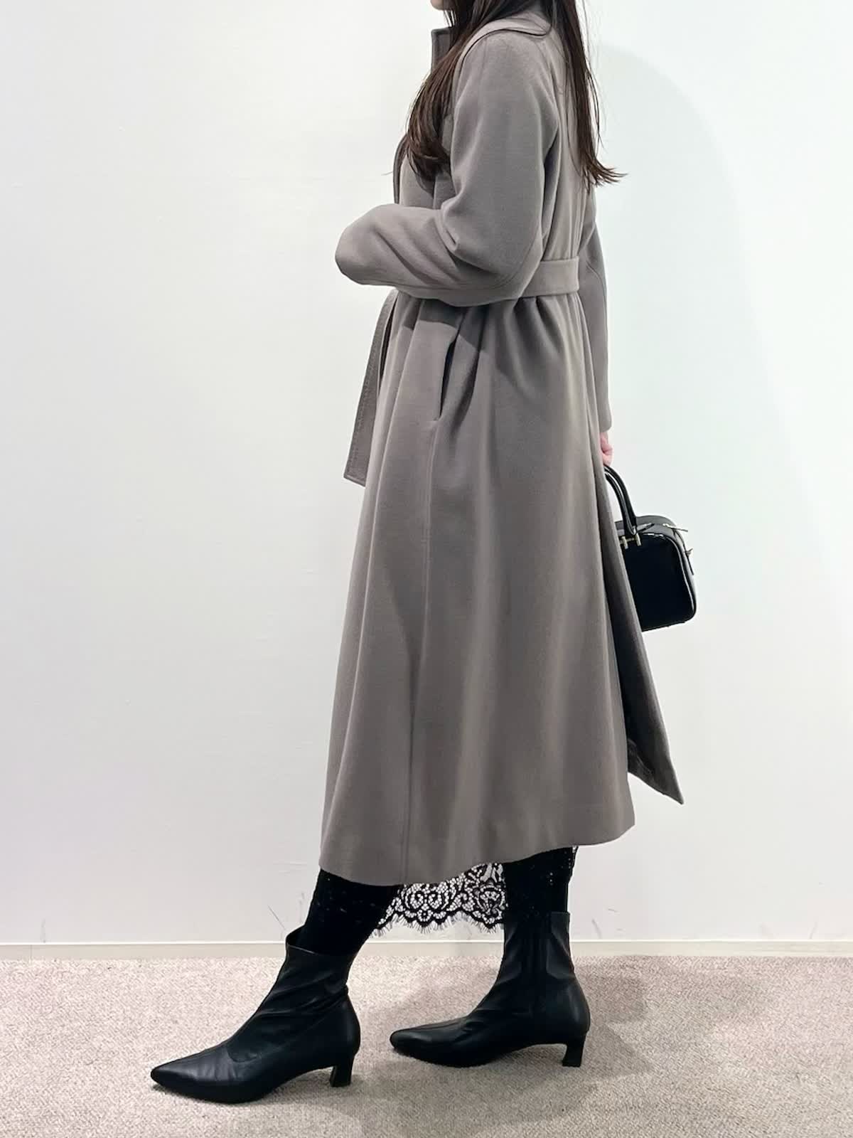 【着用サイズ】全て9号 【着用カラー】コート: グレーベージュ カーディガン:ベージュ ブラウス:アイボリー スカート:ブラック バッグ:ブラック 「休日も通勤も万能、きれいめ淡色コートスタイル」 羽織るだけできちんと決まるロングコート。襟元は高すぎないスタンドカラーで、シャープで上品な印象に。ウエストマークのベルトでスタイルアップや、前を開けてラフにも着こなせるデザイン。スタイリングは、ラクーンニットカーディガン×ボウタイスタイル。ボトムはスパンコールが華やかなレーススカートでお出かけスタイルに。きれいめ淡色カラーのコートに、大人ベーシックカラーで上品な印象に決まるおすすめコーデです。