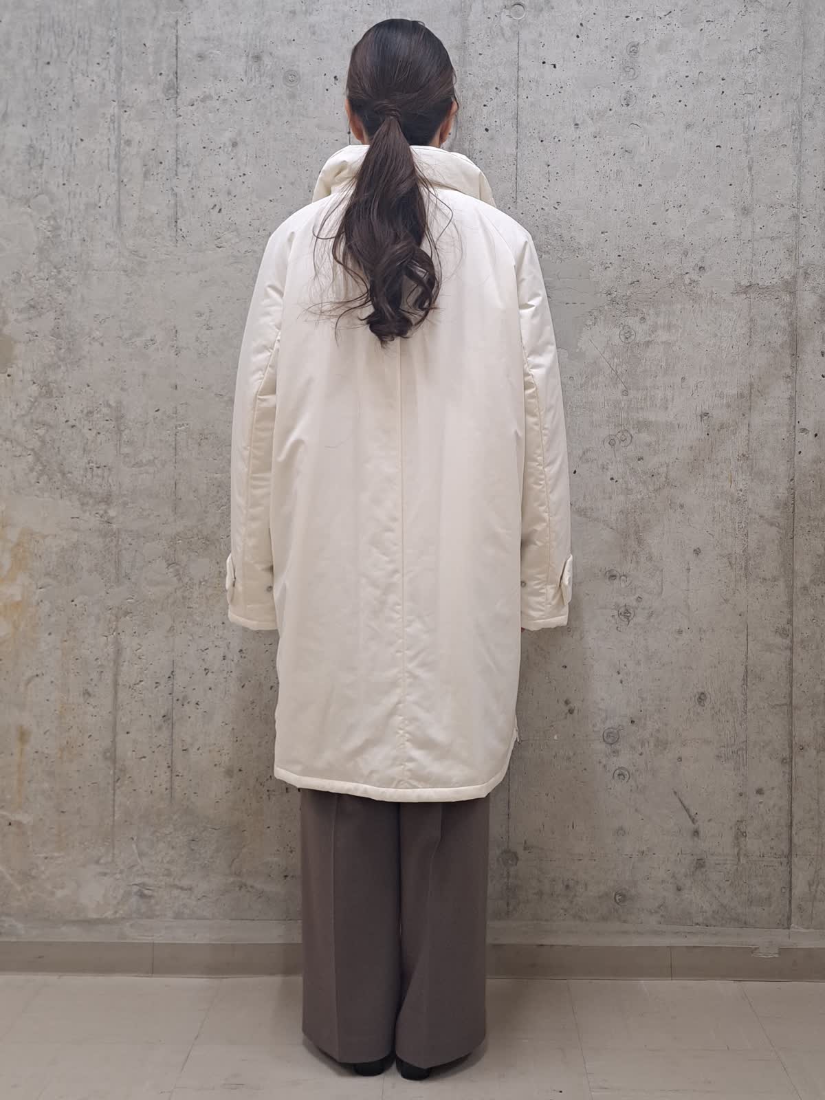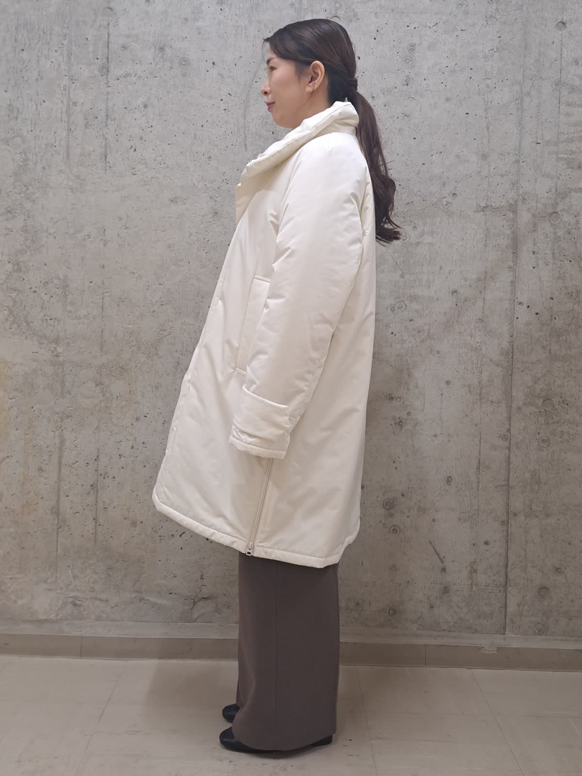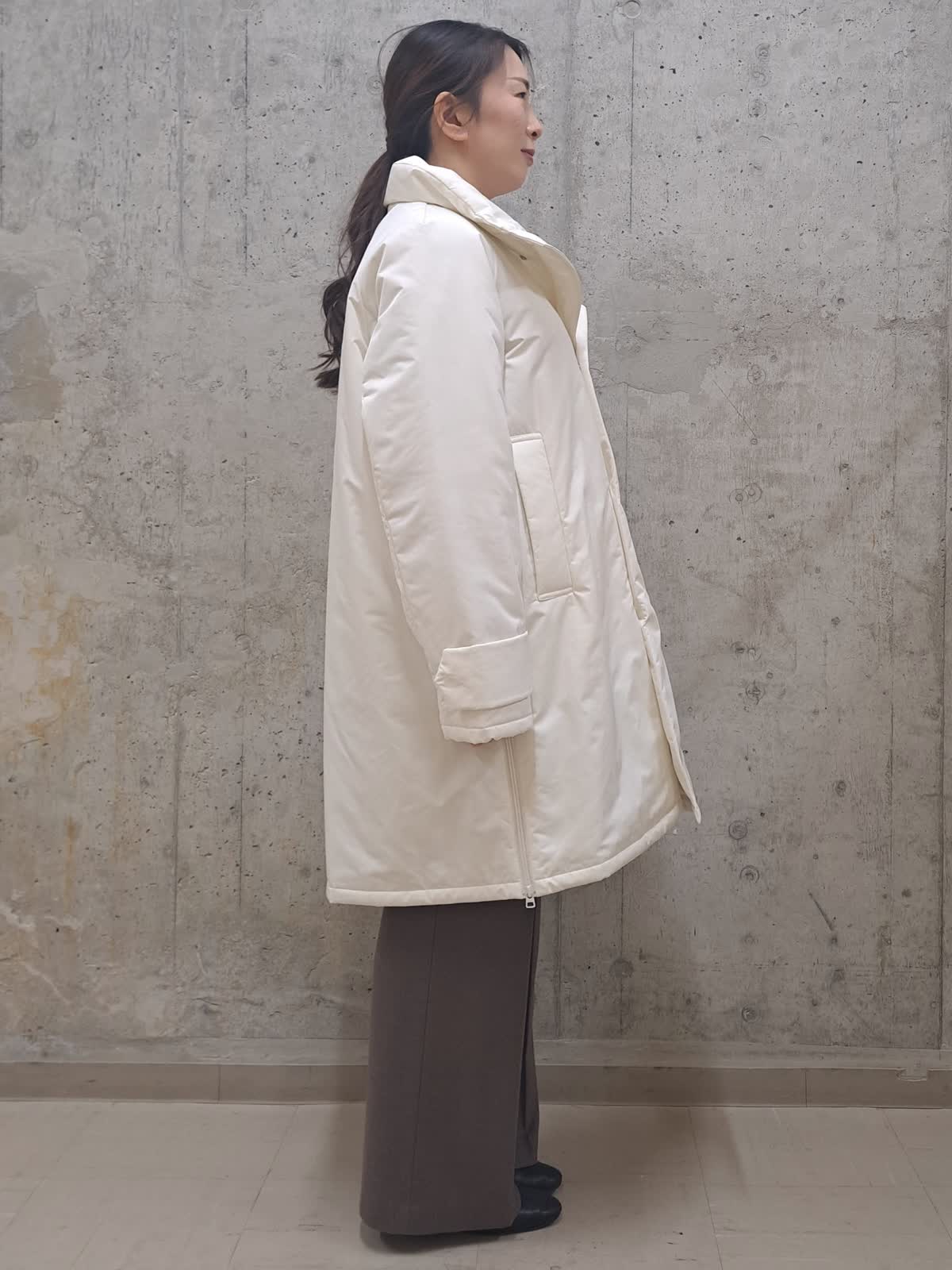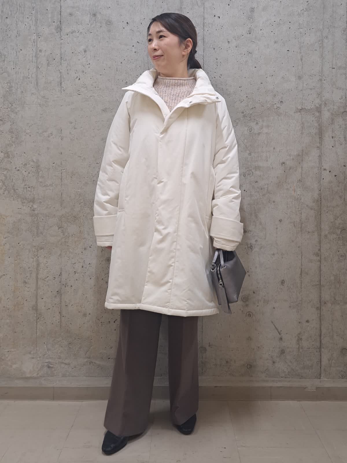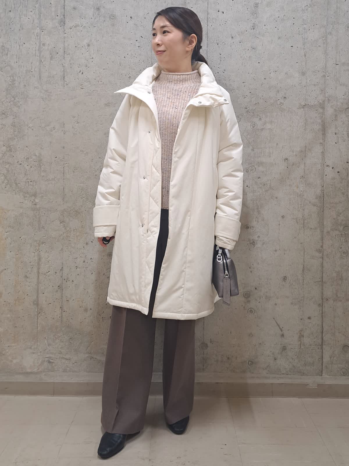 【着用サイズ】ブルゾン:フリー ニット:フリー パンツ:7号 バック:フリー 【着用カラー】ブルゾン:アイボリー ニット:オフホワイト パンツ:ブラウン バック:シルバー 冬のお出かけコーディネート 軽くて着やすい中綿ブルゾン。着丈が長過ぎないので、小柄な方でも羽織りやすいデザインです。 ゆったりサイズなのでインナーにはドルマンニットを合わせても、もたつかず、腕が動かしやすい様になっております。