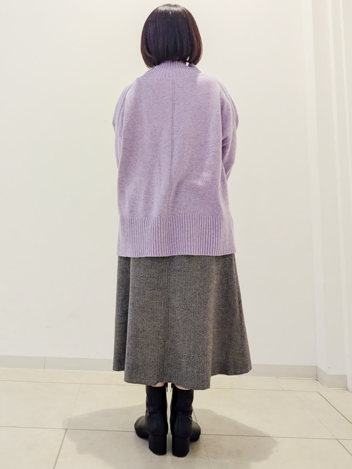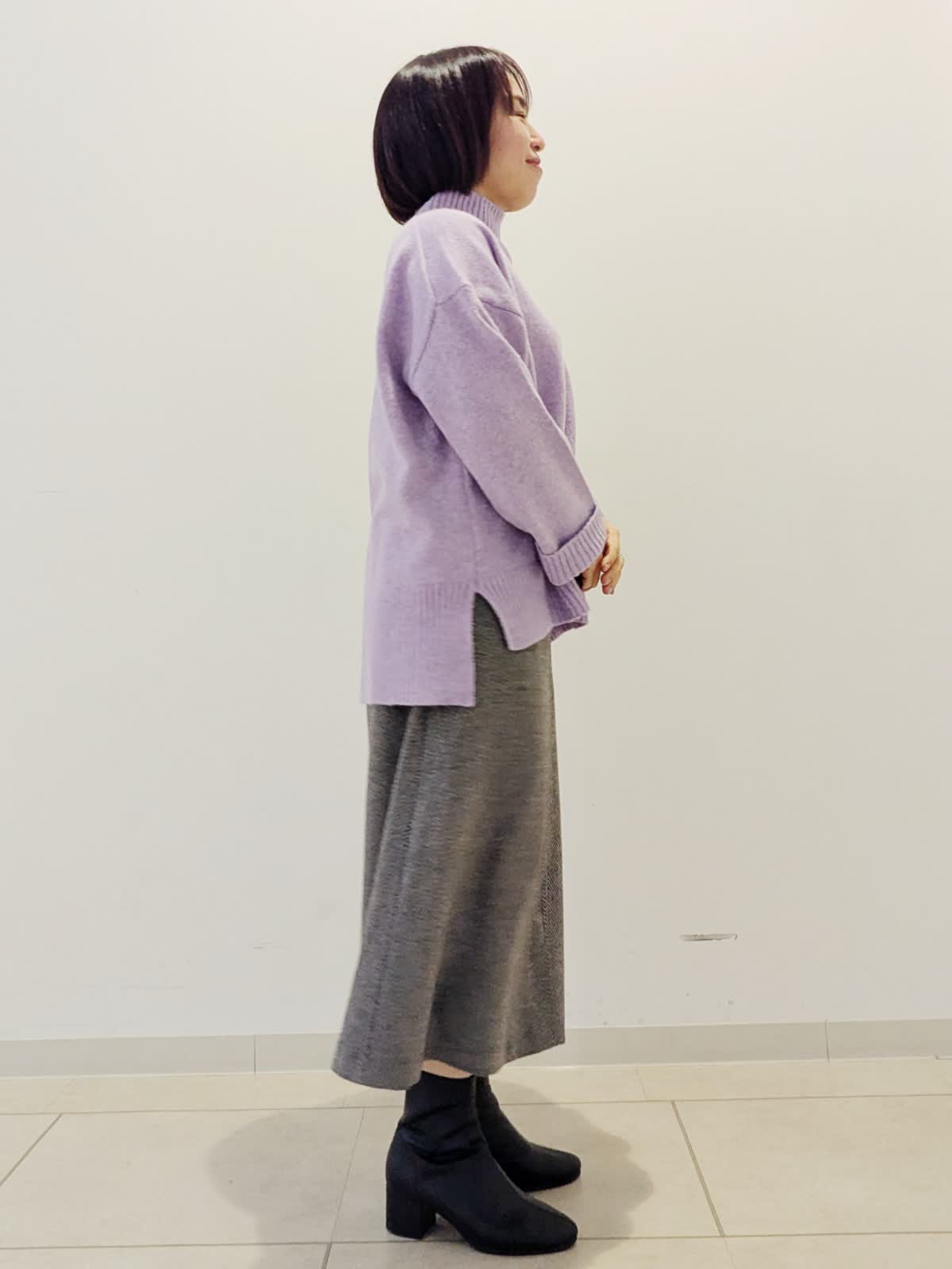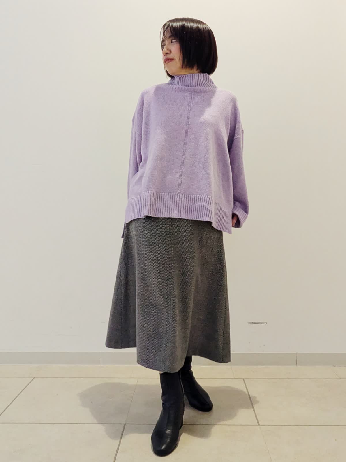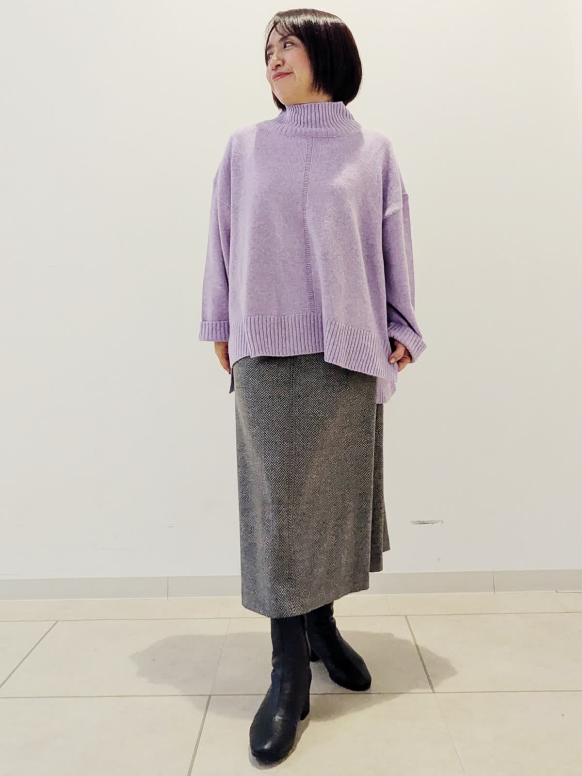 【着用サイズ】ニット:フリー スカート:9号【着用カラー】ニット:ラベンダー スカート:ブラック 春まで使えるお出かけコーデです。ニットはハイネックで身頃がゆったりめ。ウールを使っていないので春先までお使いいただけます。スカートを合わせてお出かけにいかがでしょうか♪
