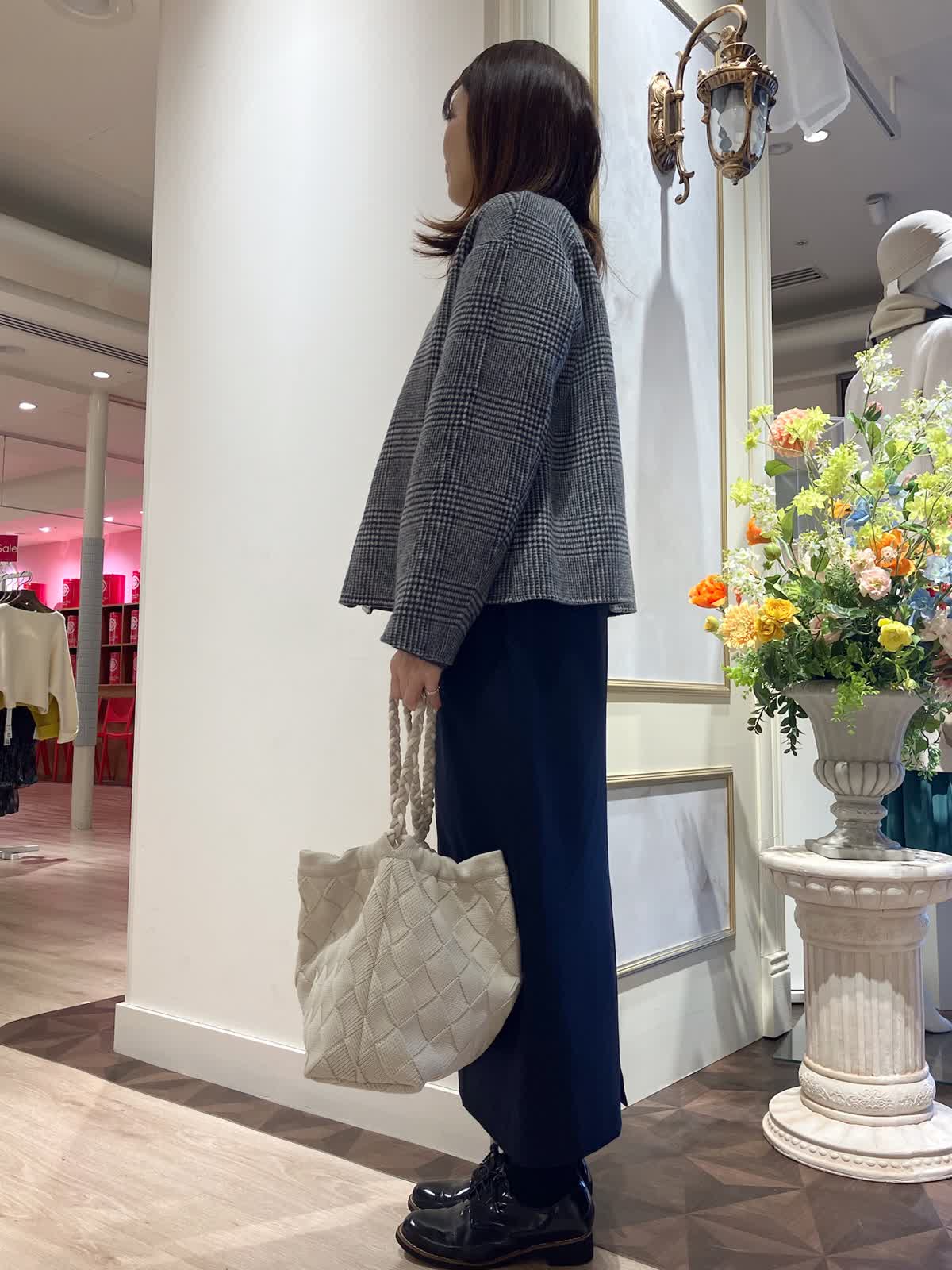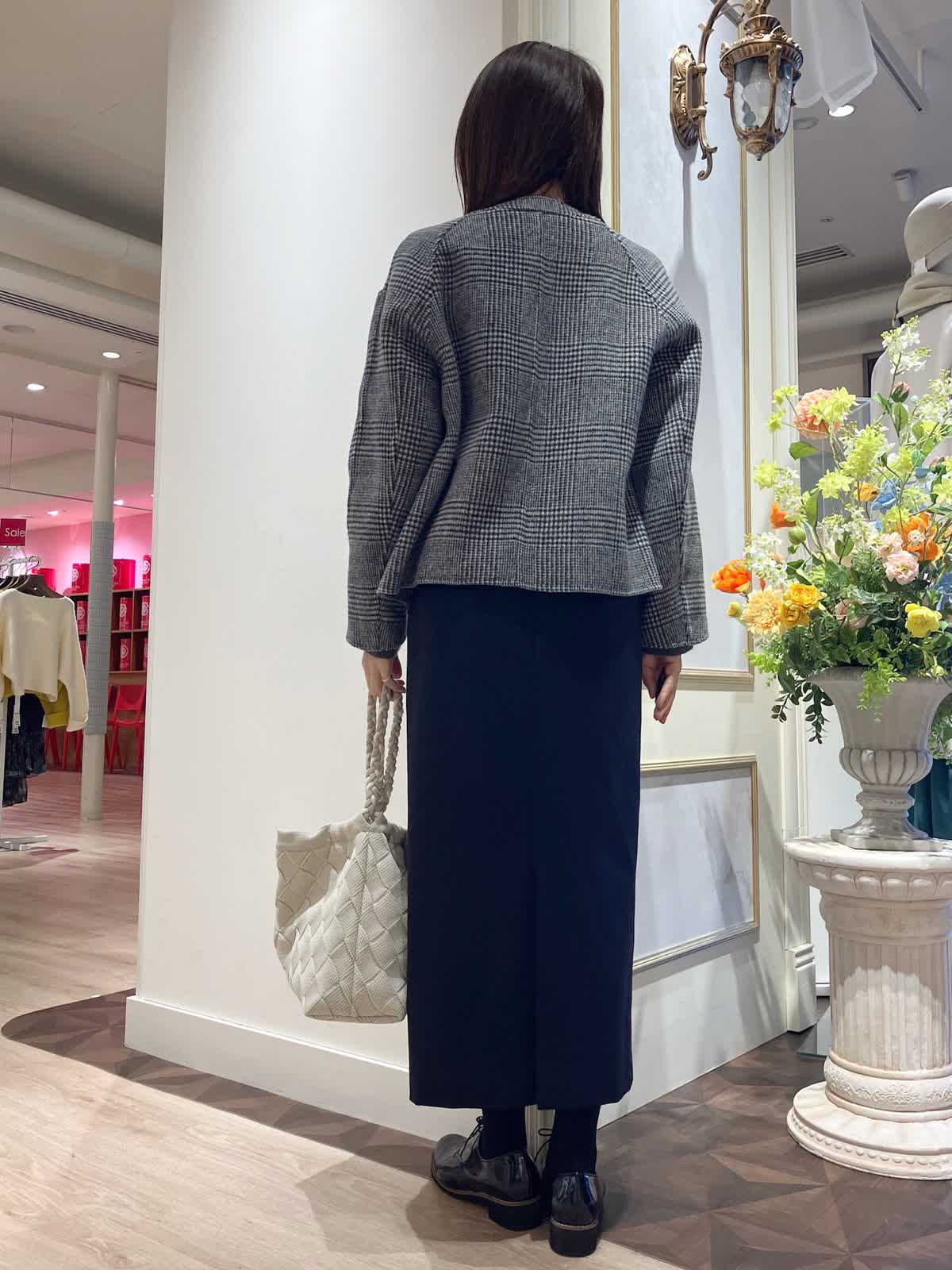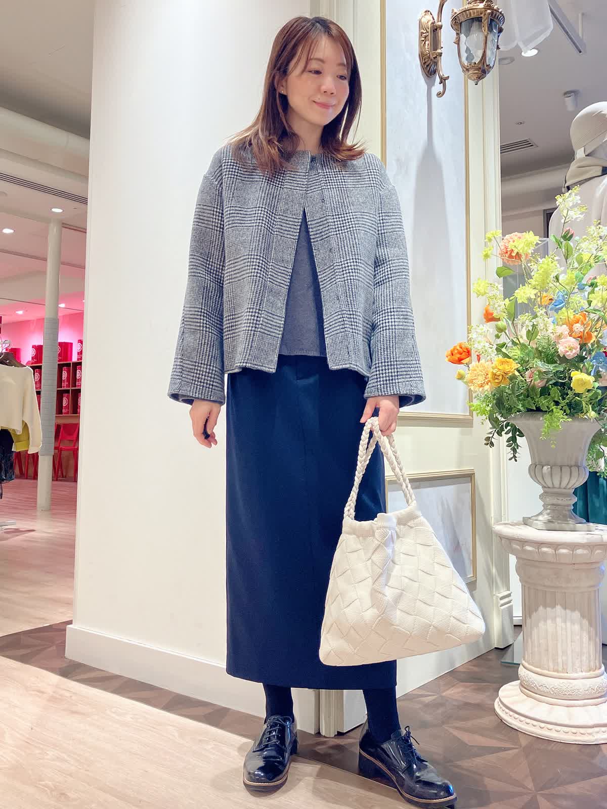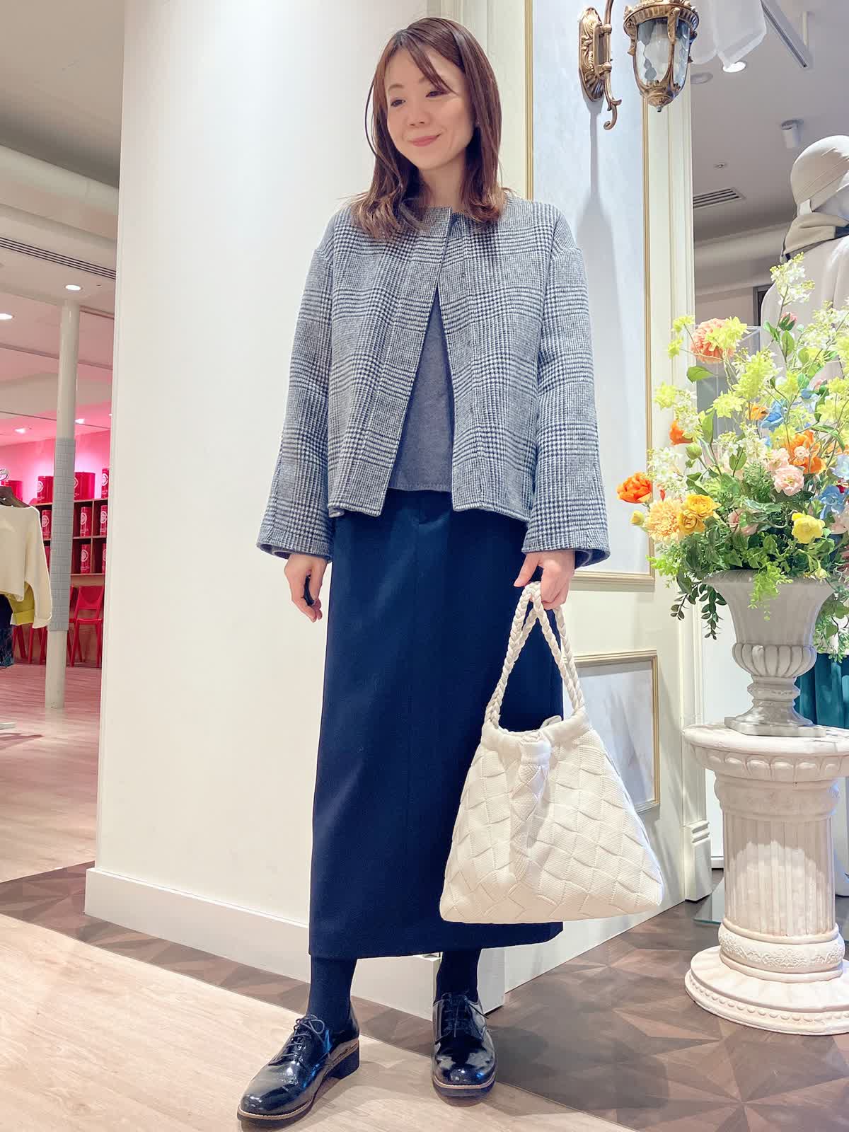 【着用サイズ】コート:9号 ニット:9号 スカート:7号 【着用カラー】コート:チャコールグレー ニット:チャコールグレー スカート:ネイビー コーディネートのテーマは冬のお出かけスタイリングです。 グレンチェックのショートコートは、リバー仕立てで、軽くて暖かくて、ジャケット感覚でも着られる優れもの。タイトスカートと合わせるときっちりした印象に。お仕事はもちろん、ちょっとした行事ごとにも大活躍のコーディネートです。