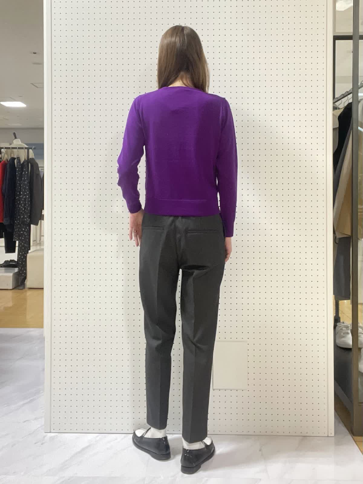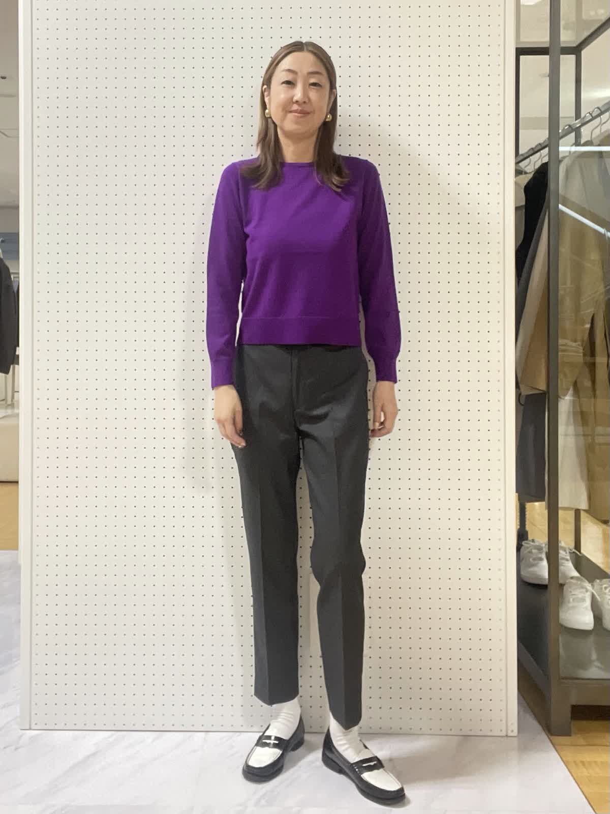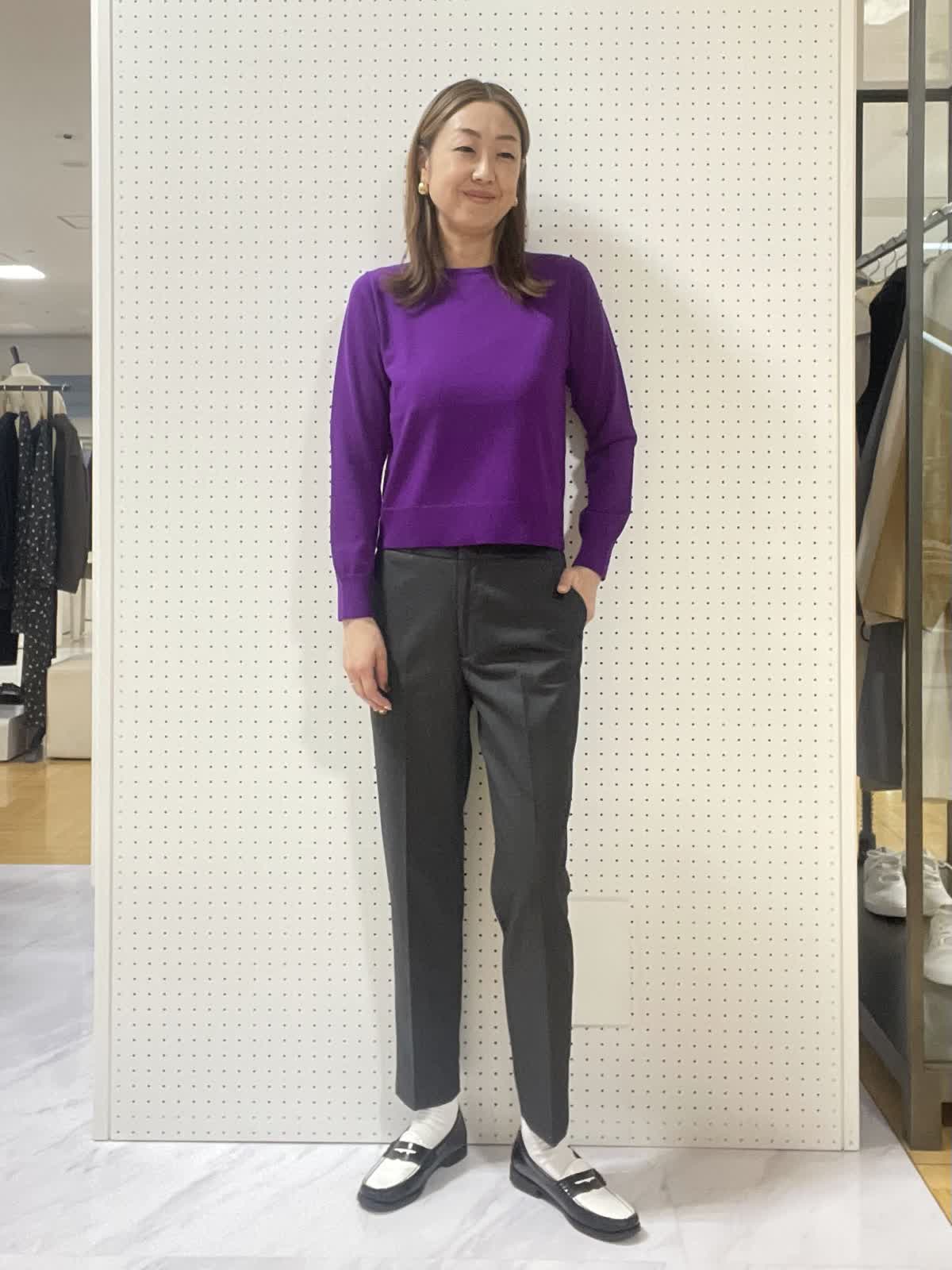 【着用サイズ】共に9号【着用カラー】ニット:パープル パンツ: チャコールグレーオフィススタイル 品やかなウール100%素材のプルオーバーニット。厚すぎないので春まで利用可能で何枚も欲しいアイテムでおすすめ!