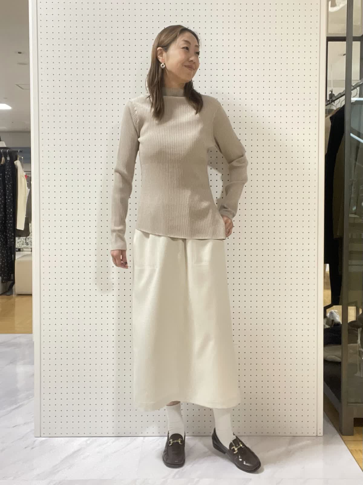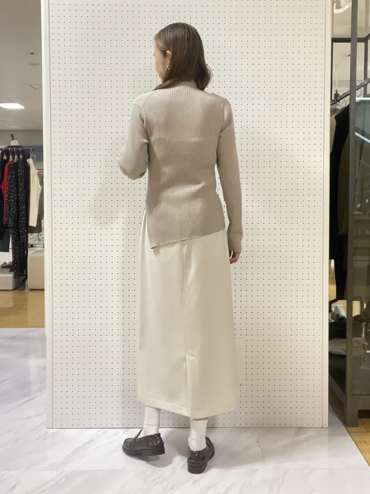 【着用サイズ】ニット:フリー スカート:9号【着用カラー】ニット:ベージュ スカート:オフホワイト 程よいラメ入りのハイネックニット。スリットが片側だけに入ってるのがPOINT。ベージュ×オフホワイトでグラデーション綺麗めスタイルに。