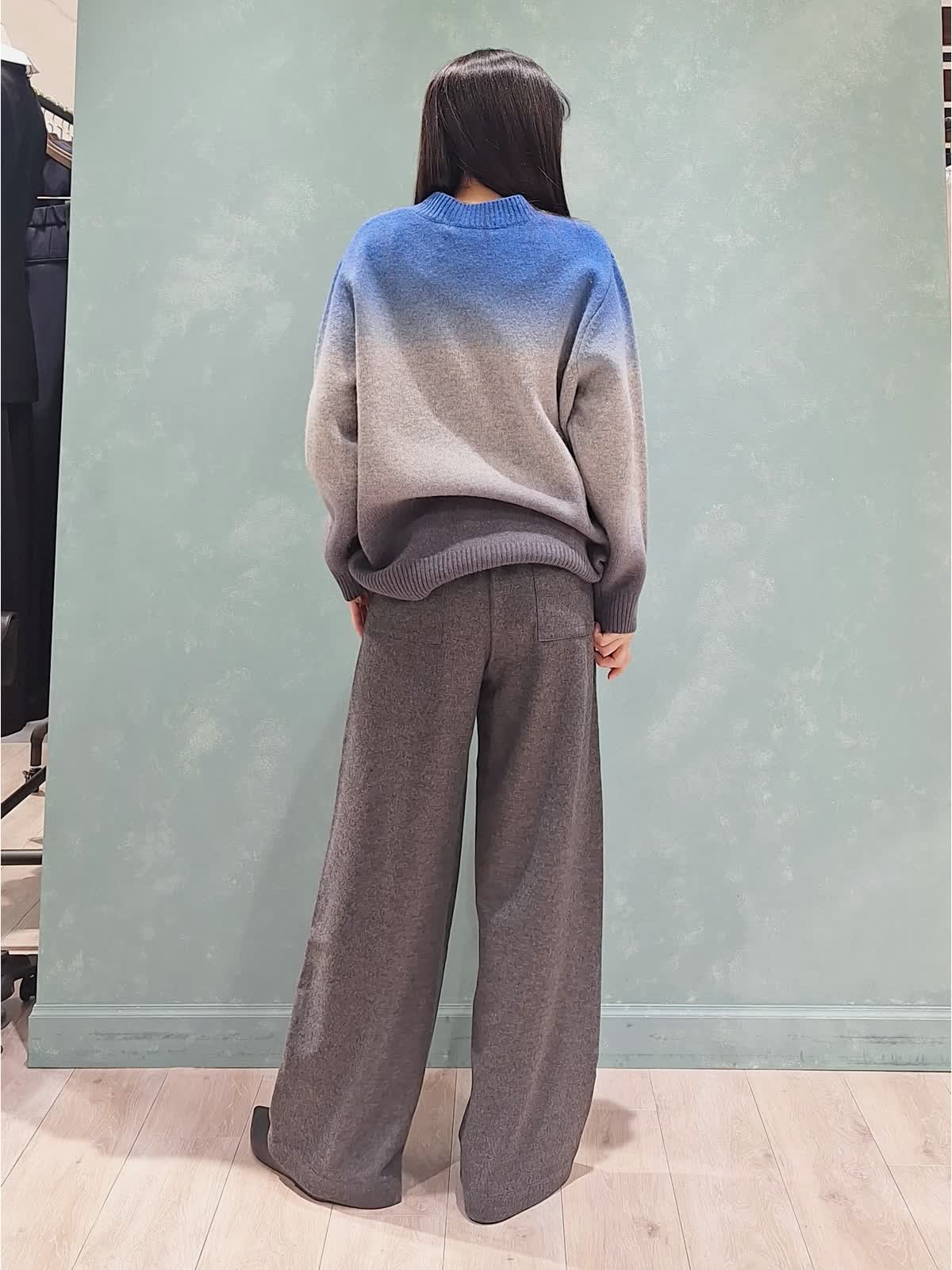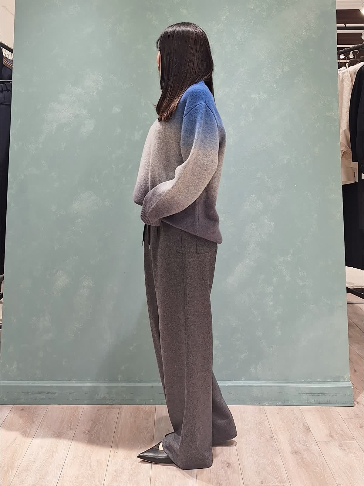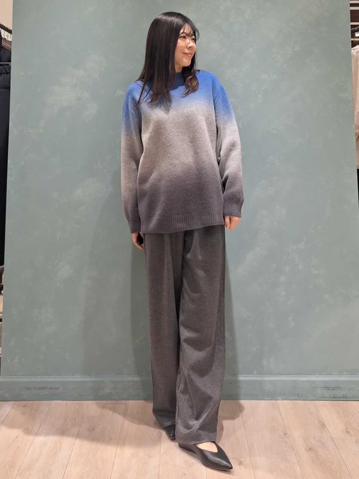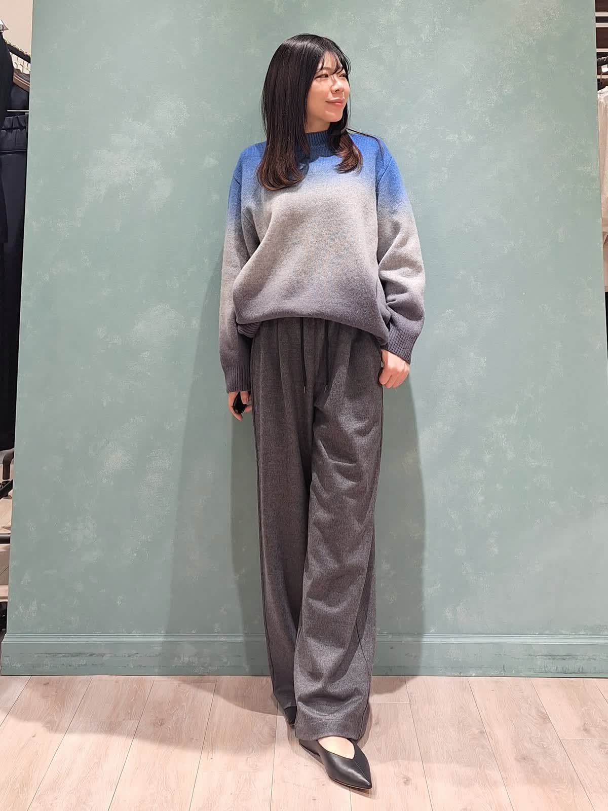 【着用サイズ、カラー】ニット:9号、ブルー パンツ:7号、チャコールグレー 《休日》リラックスカジュアルスタイル。トレンドのグラデーションニット、ウール100%で厚みがあり、凄く暖かく着ていただけます。ゆったりサイズで長めの着丈、アレンジ次第でこなれた印象に。ボトムもゆったりラフに着こなせる圧縮ウール素材のパンツを着用。ウエスト調節可能な紐付きです。足元はフラットシューズでリラックス感を演出しました。