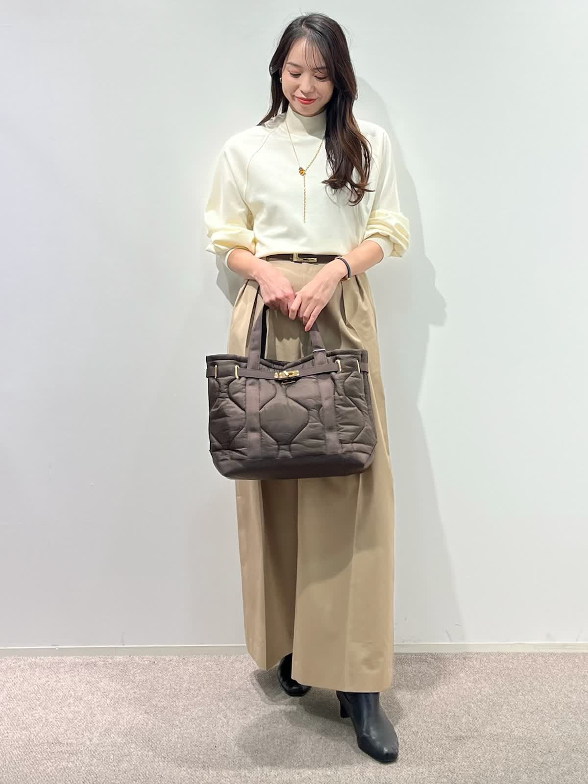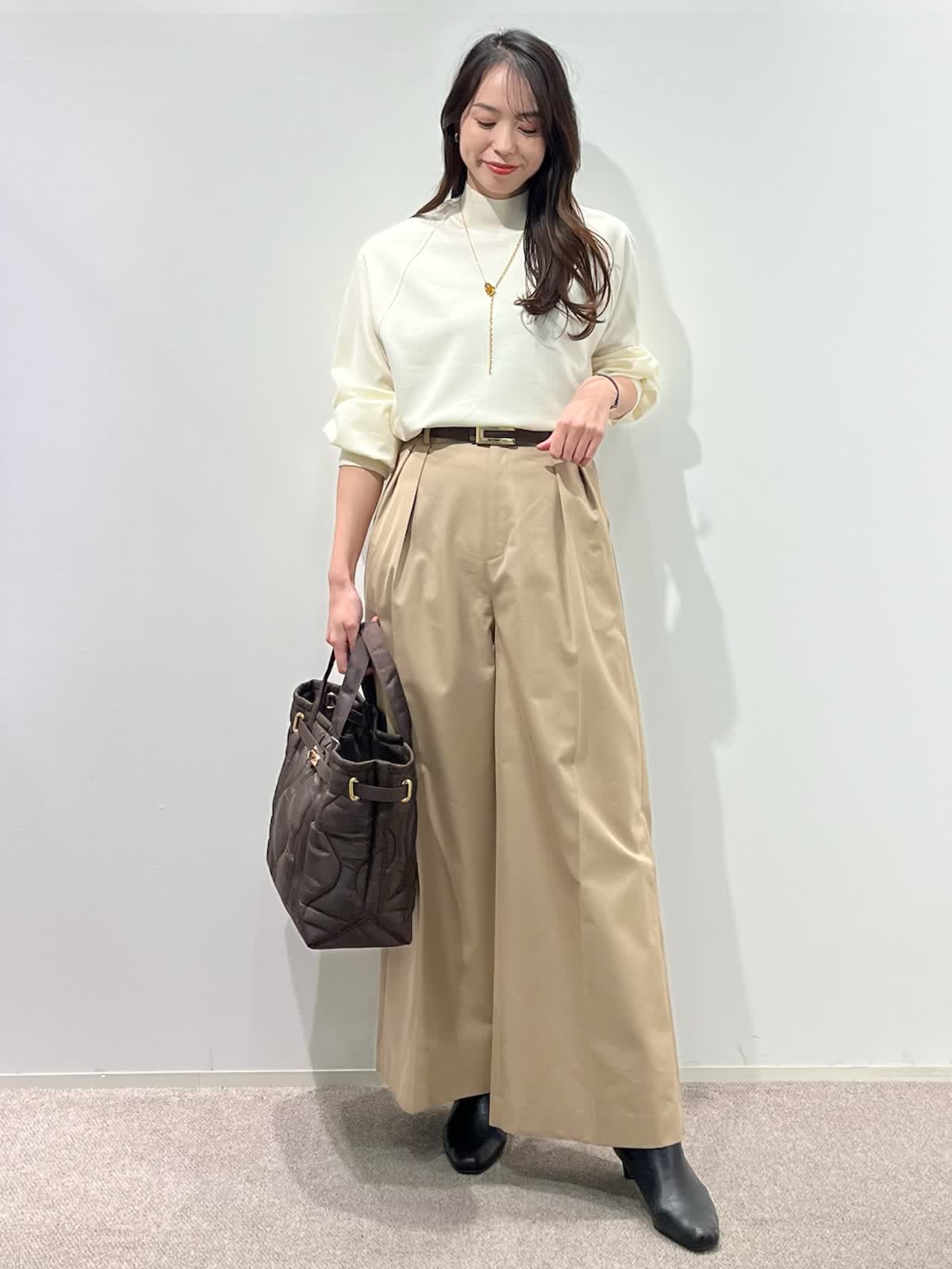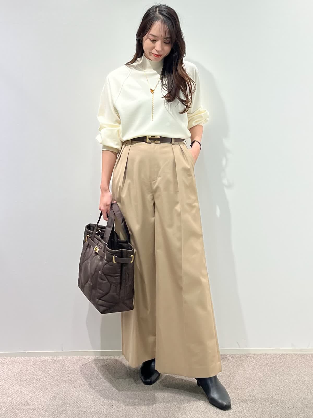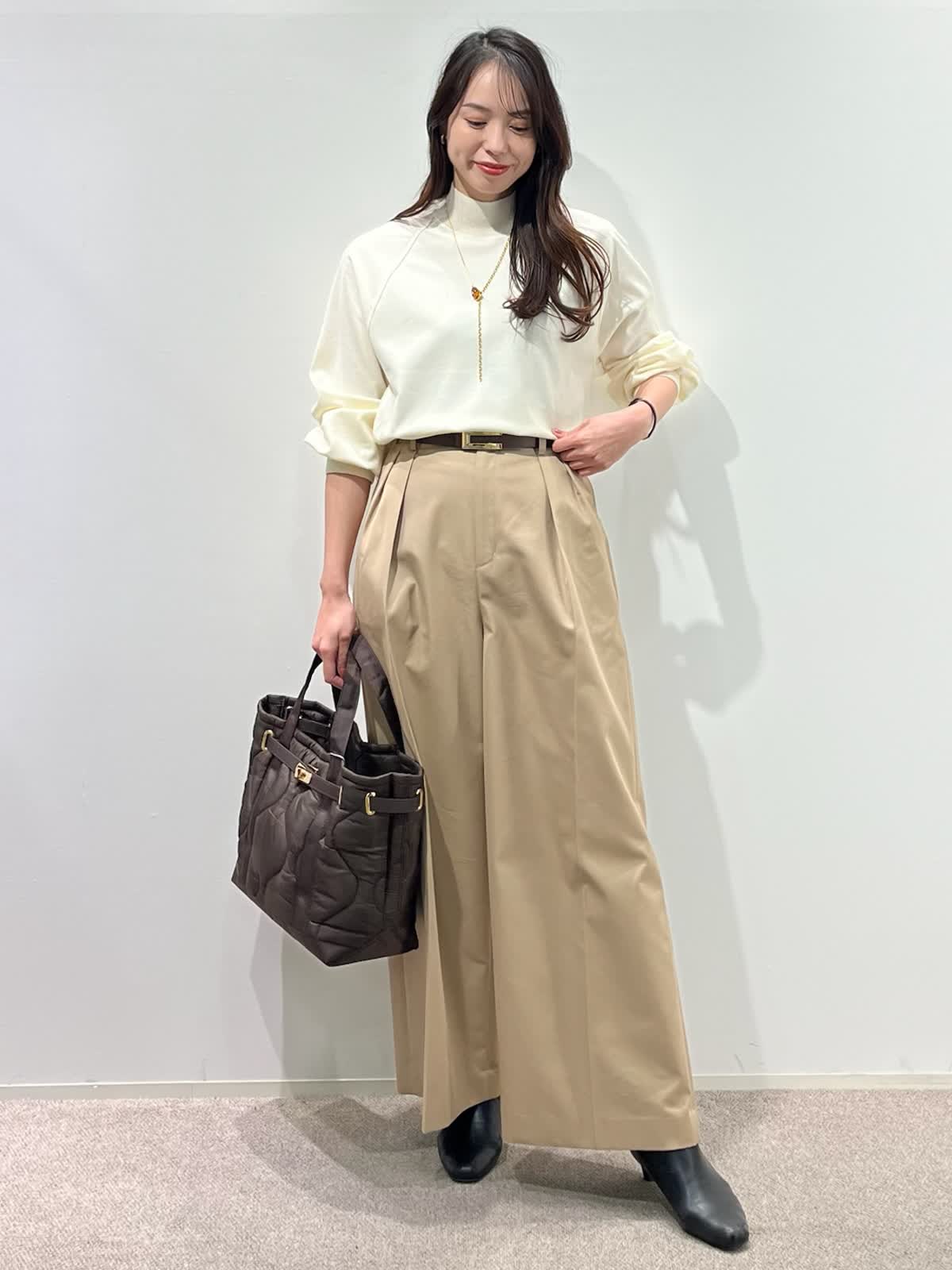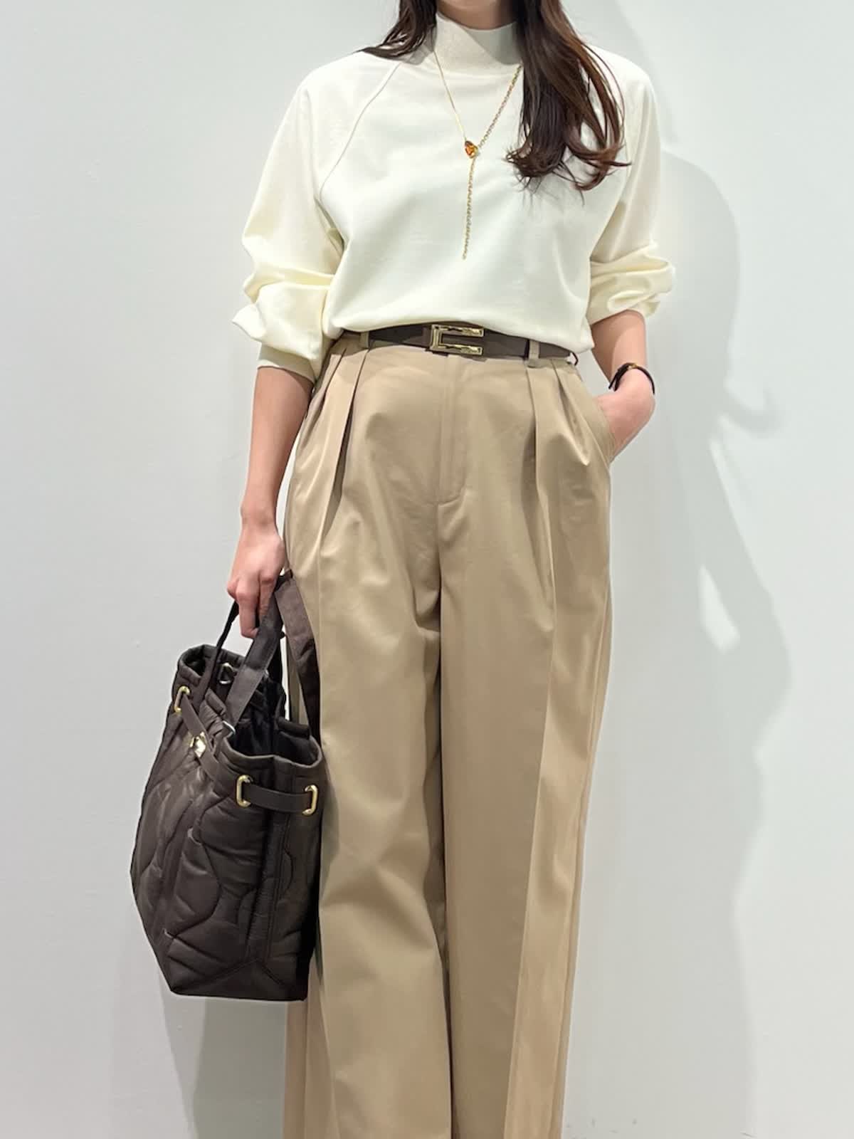 着用サイズ】ニット:9号 パンツ:9号 【着用カラー】 ニット:アイボリー パンツ:ベージュ バッグ:ブラウン 「大人の王道、好印象ベーシックコーデ」 ハイネックの圧縮スムースウールニット。さらりとした素材感で着心地良く、シルエットもゆとりがあるのでストレスフリーで着こなせます。滑らかなスムース生地で光沢感のある上品な素材感。 脚長効果抜群のワイドシルエットパンツと合わせて、ホワイト?ベージュの大人の淡色コーデ。柔らかく上品に着こなせて、春まで活躍出来るおすすめスタイルです。