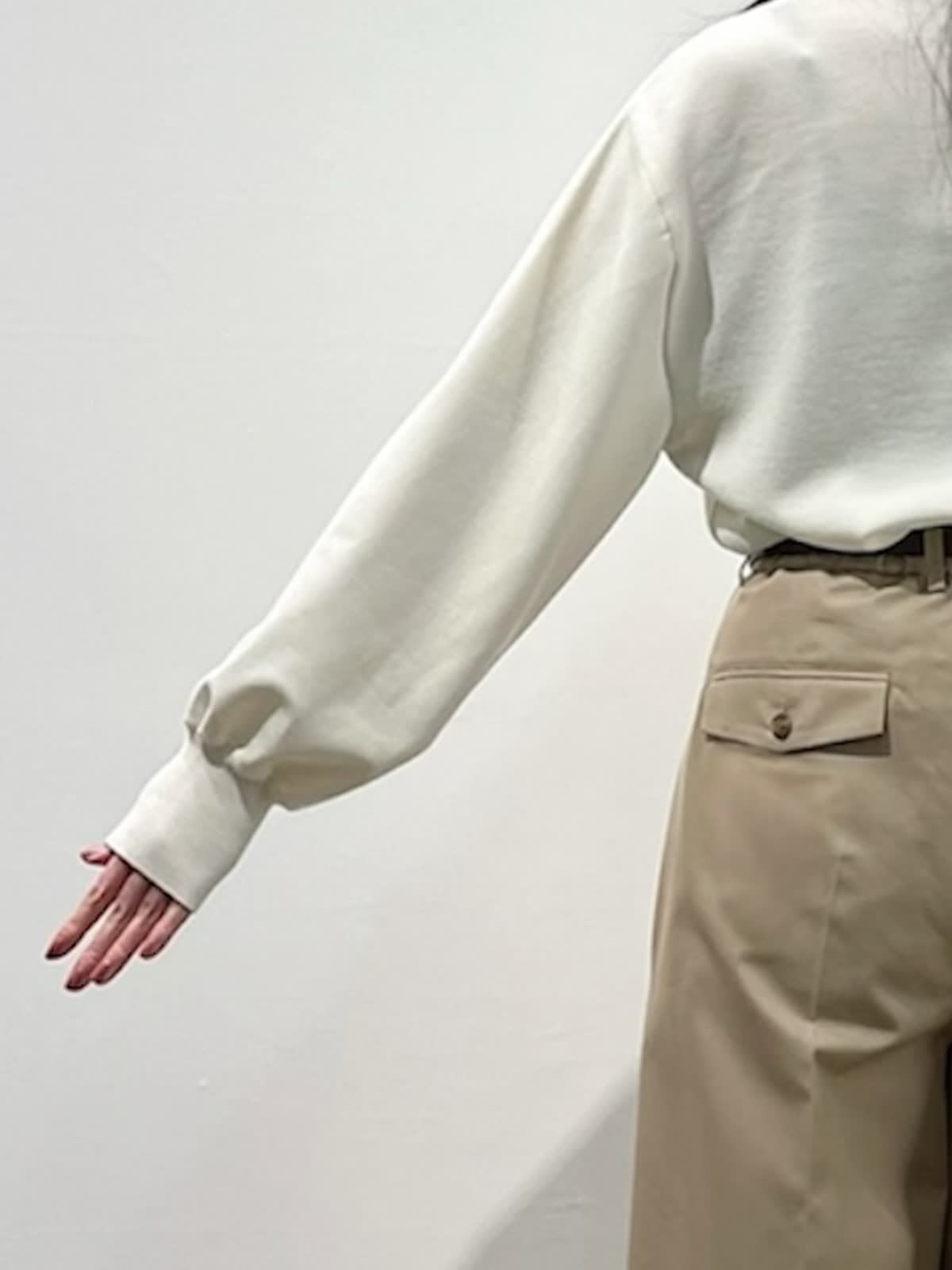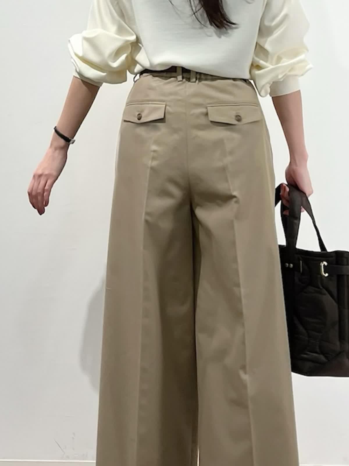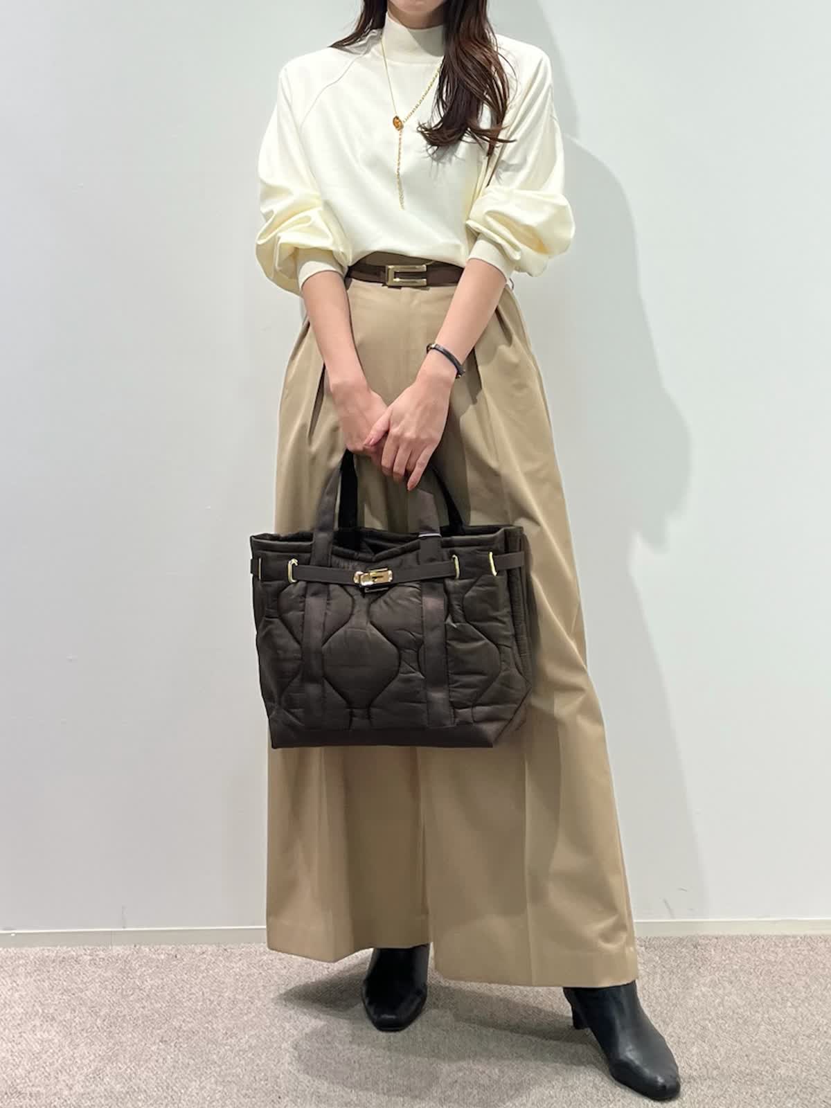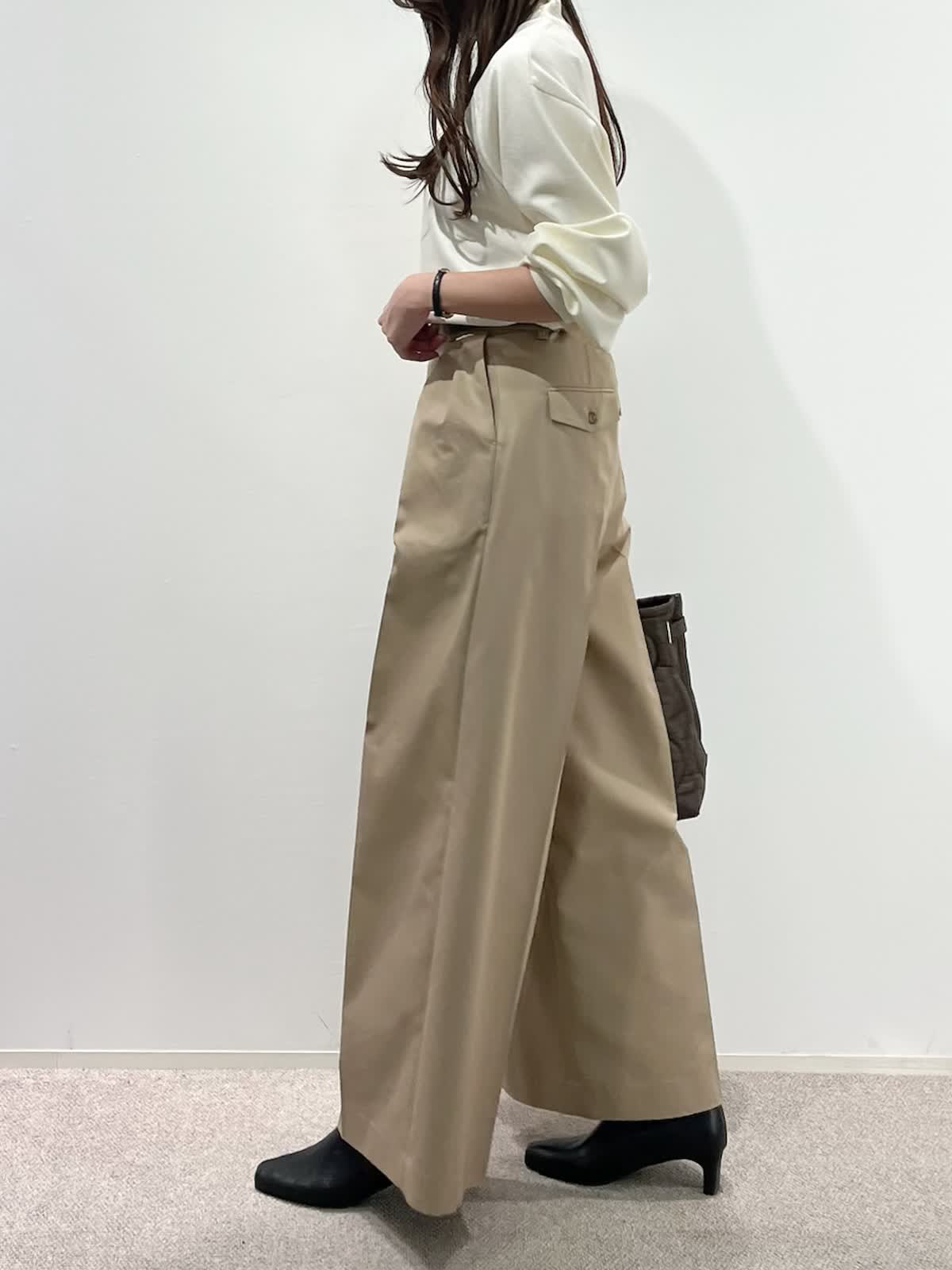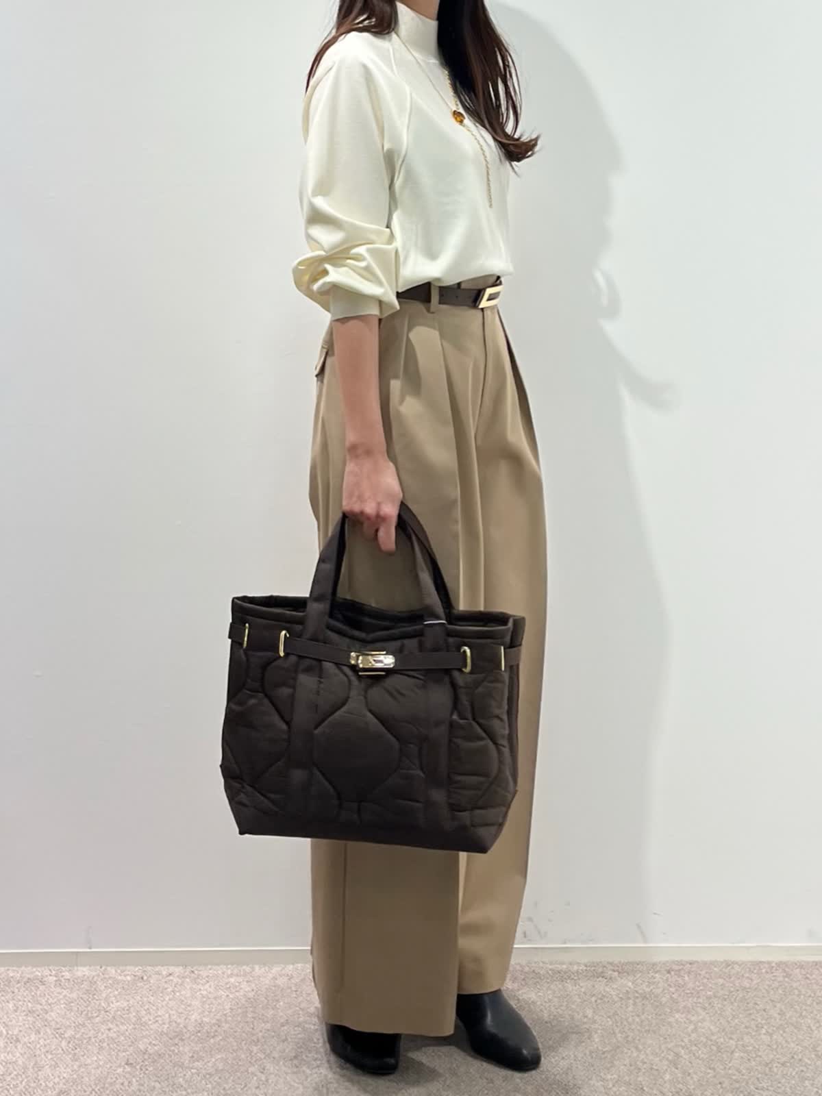 着用サイズ】ニット:9号 パンツ:9号 【着用カラー】 ニット:アイボリー パンツ:ベージュ バッグ:ブラウン 「大人の王道、好印象ベーシックコーデ」 ハイネックの圧縮スムースウールニット。さらりとした素材感で着心地良く、シルエットもゆとりがあるのでストレスフリーで着こなせます。滑らかなスムース生地で光沢感のある上品な素材感。 脚長効果抜群のワイドシルエットパンツと合わせて、ホワイト?ベージュの大人の淡色コーデ。柔らかく上品に着こなせて、春まで活躍出来るおすすめスタイルです。