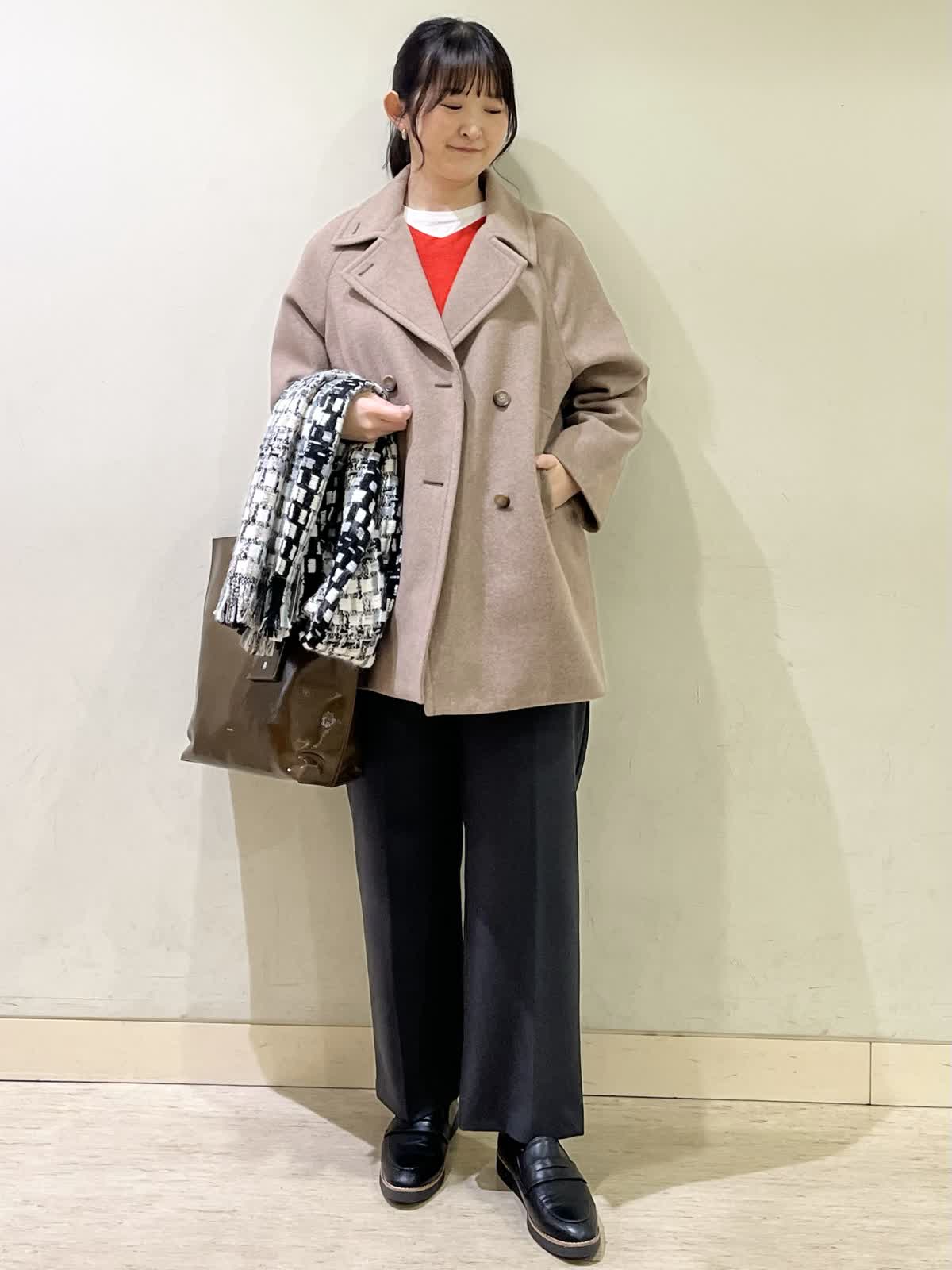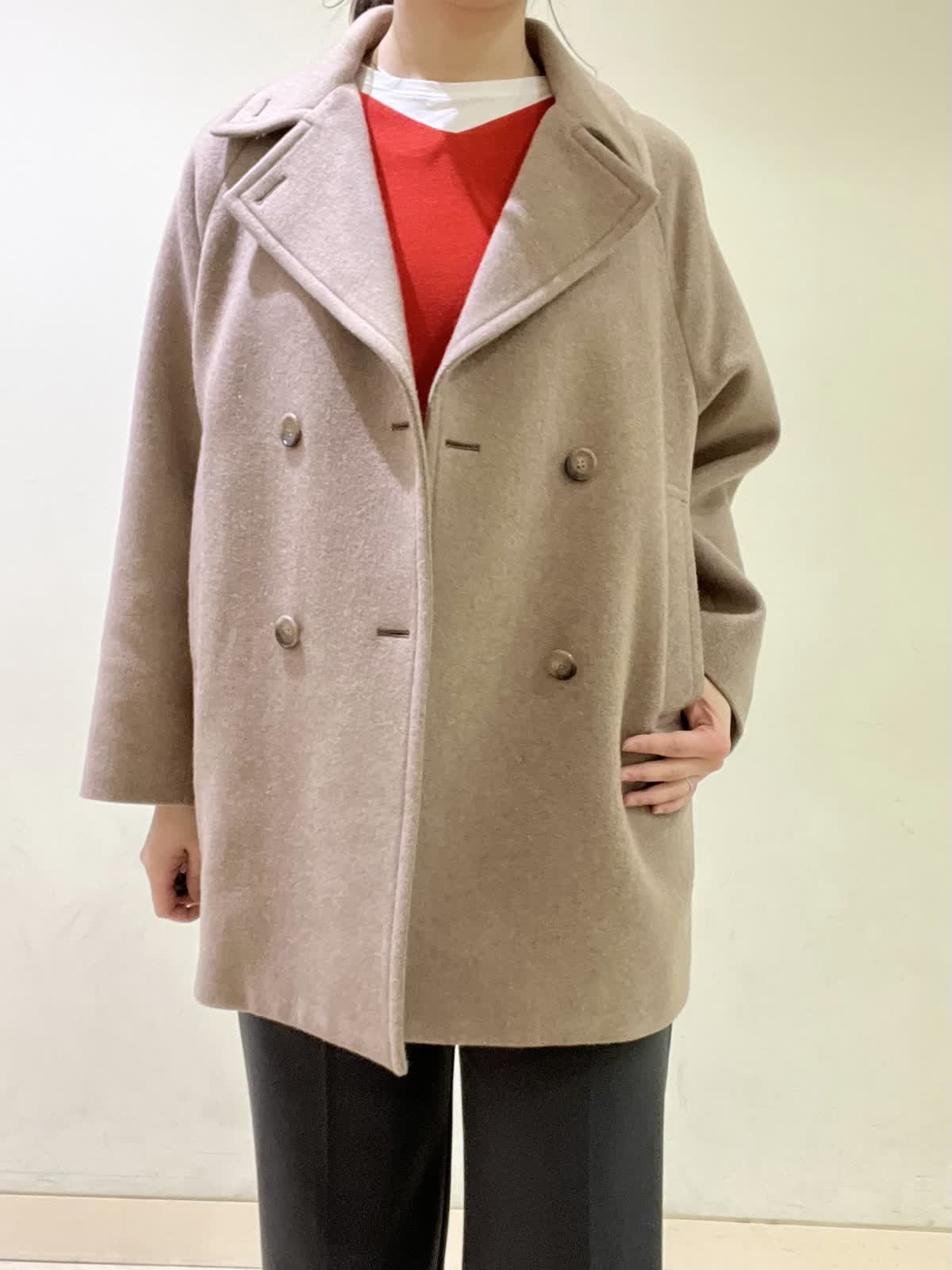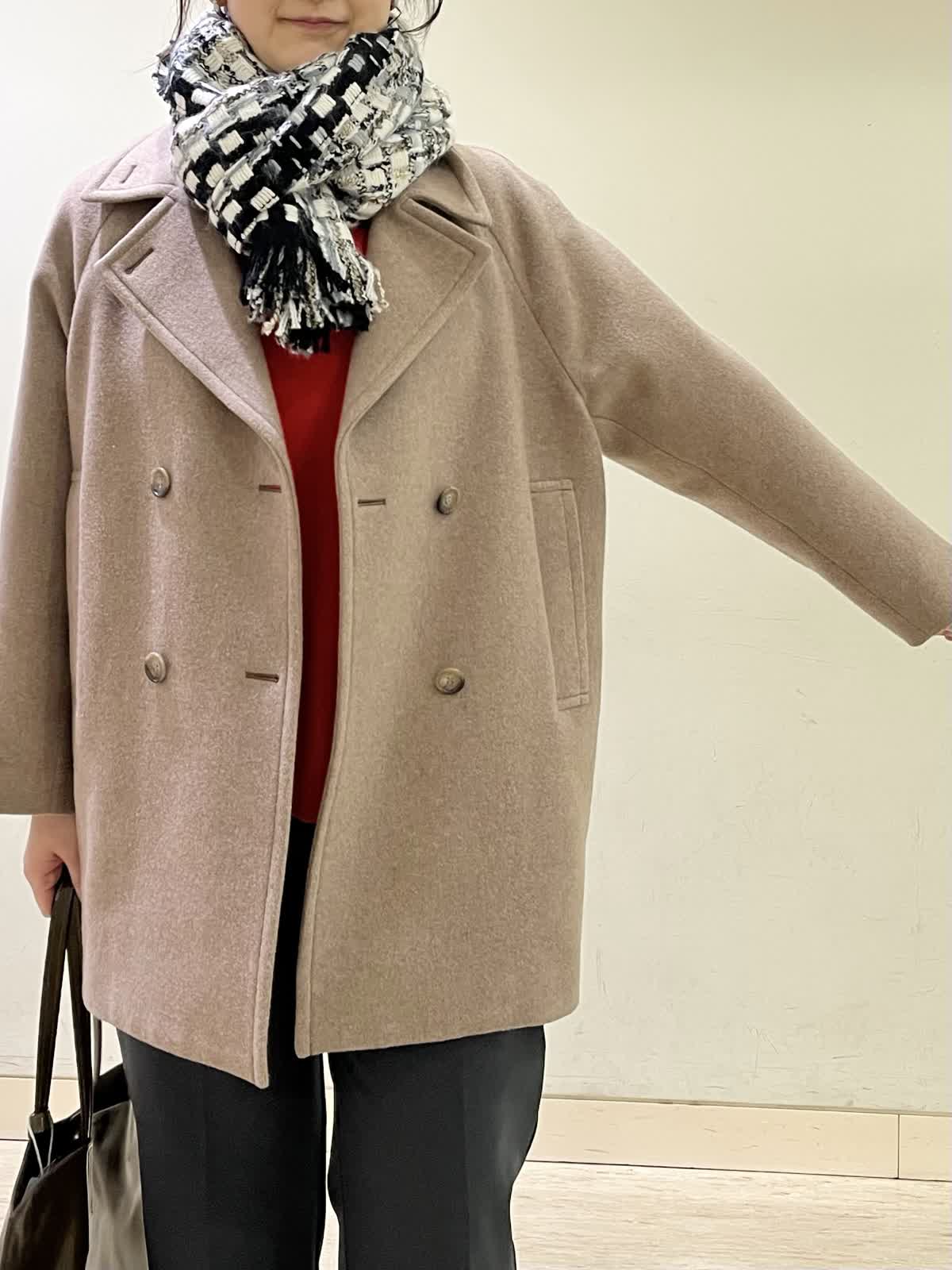 【着用カラー/サイズ】コート:モカチャ/フリー セーター:オレンジ/フリー カットソー :ホワイト/11号 パンツ:ミディアムグレー/11号 通勤コーデ。 ピーコートは、ラグランスリーブで重ね着をしても、とても楽な着心地です。程よく厚みのあるコートで、着膨れせず軽いです。オレンジのセーターは、裾が広がっていて、パンツ合わせがおすすめ。 グレーのパンツは、ストレッチが効いていて普段着?お仕事着にも着用できます。