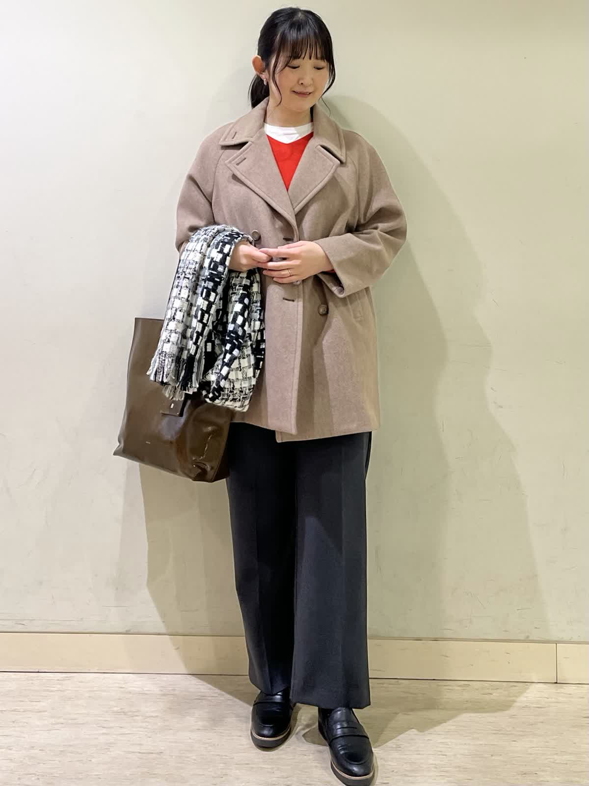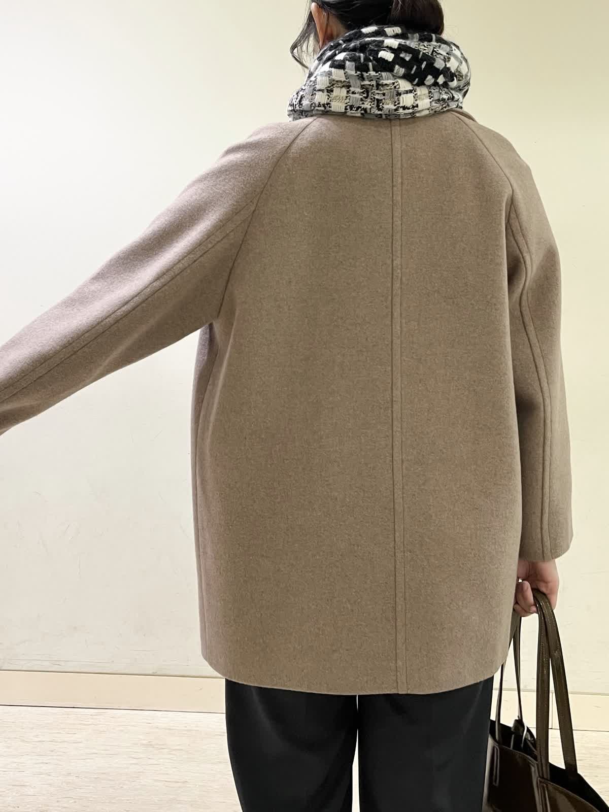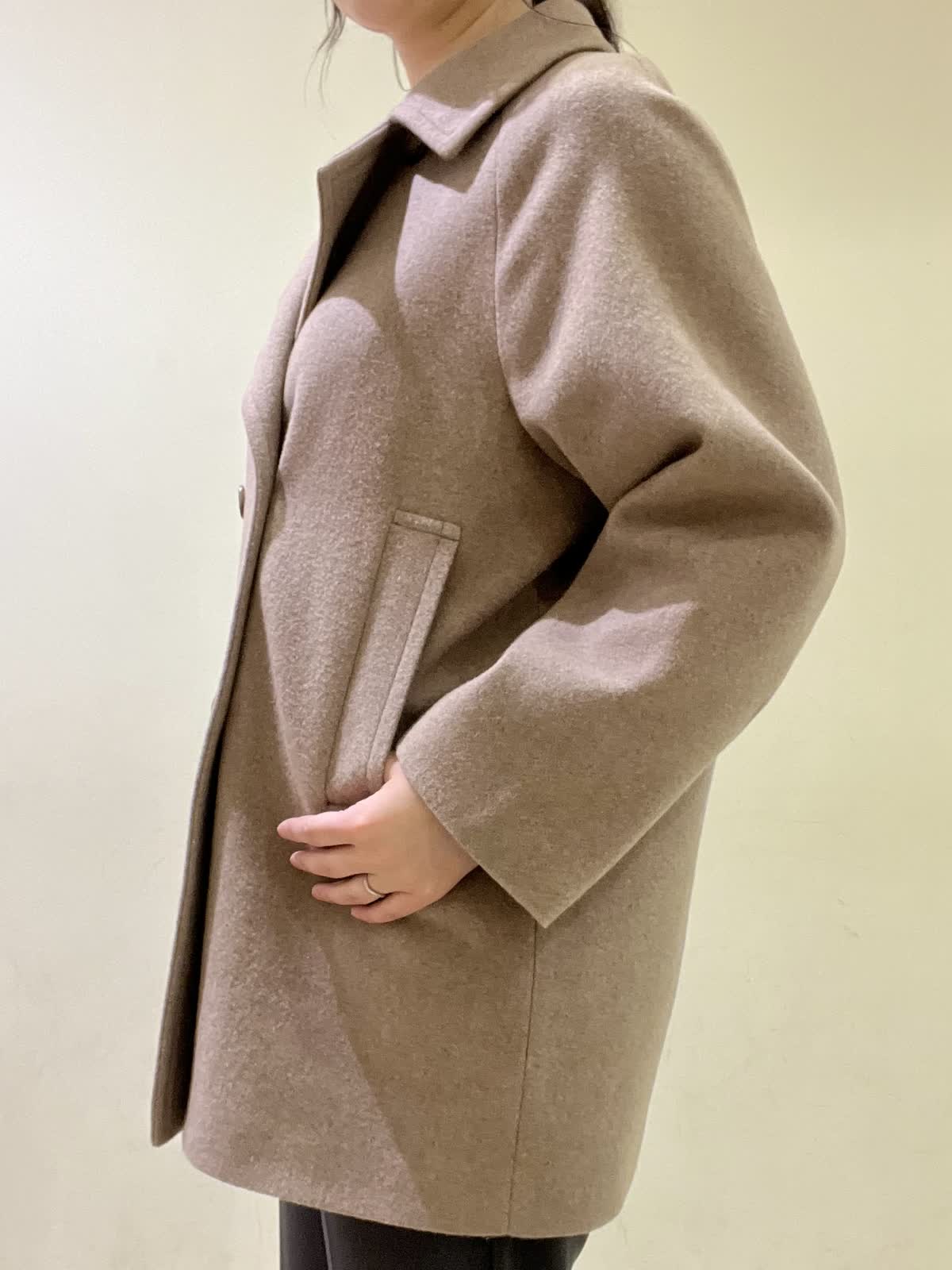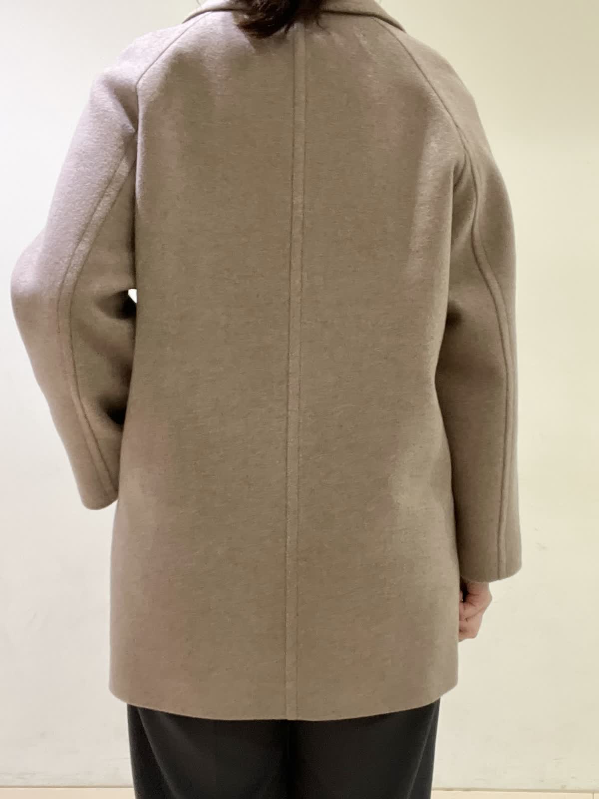 【着用カラー/サイズ】コート:モカチャ/フリー セーター:オレンジ/フリー カットソー :ホワイト/11号 パンツ:ミディアムグレー/11号 通勤コーデ。 ピーコートは、ラグランスリーブで重ね着をしても、とても楽な着心地です。程よく厚みのあるコートで、着膨れせず軽いです。オレンジのセーターは、裾が広がっていて、パンツ合わせがおすすめ。 グレーのパンツは、ストレッチが効いていて普段着?お仕事着にも着用できます。