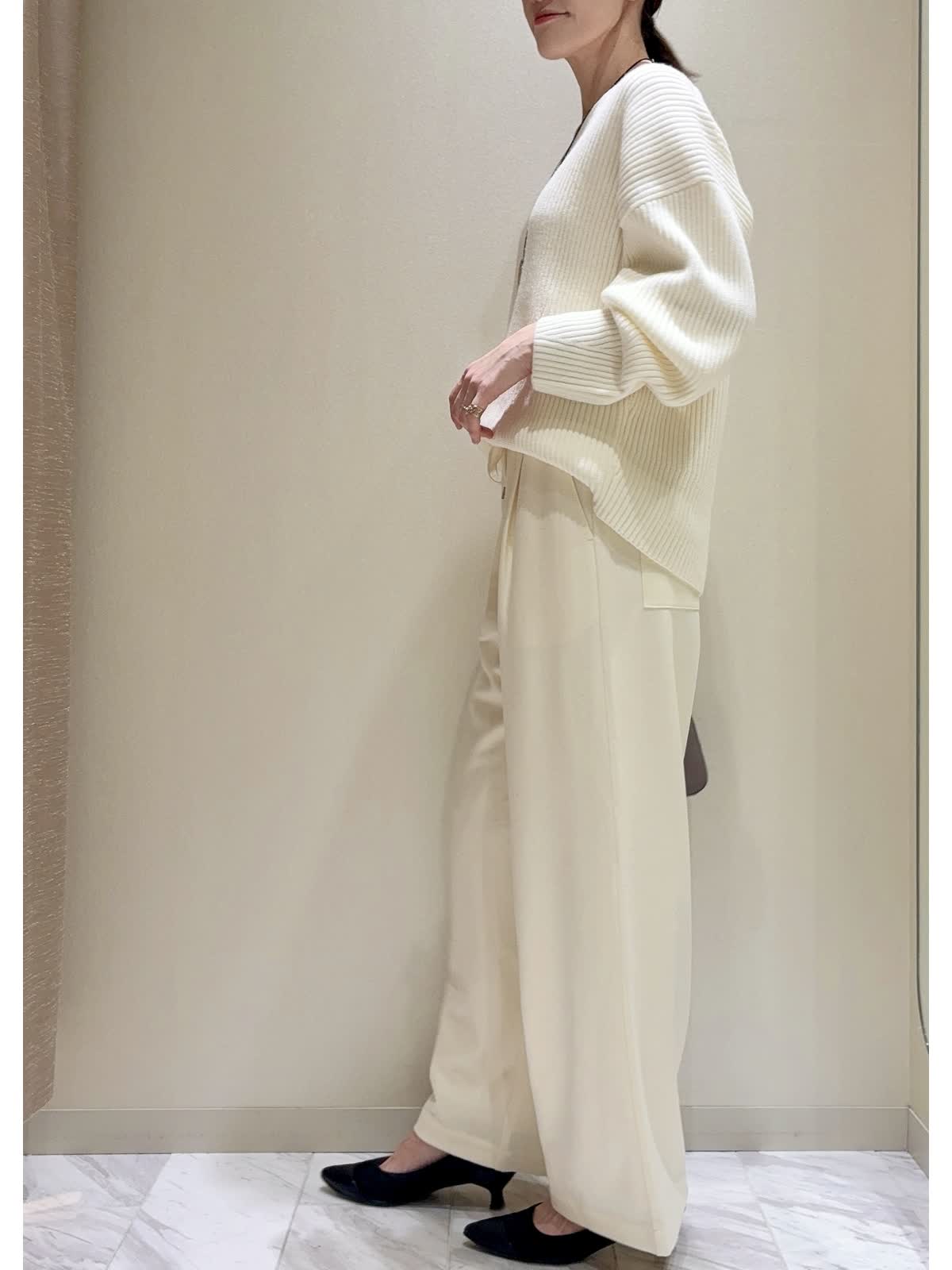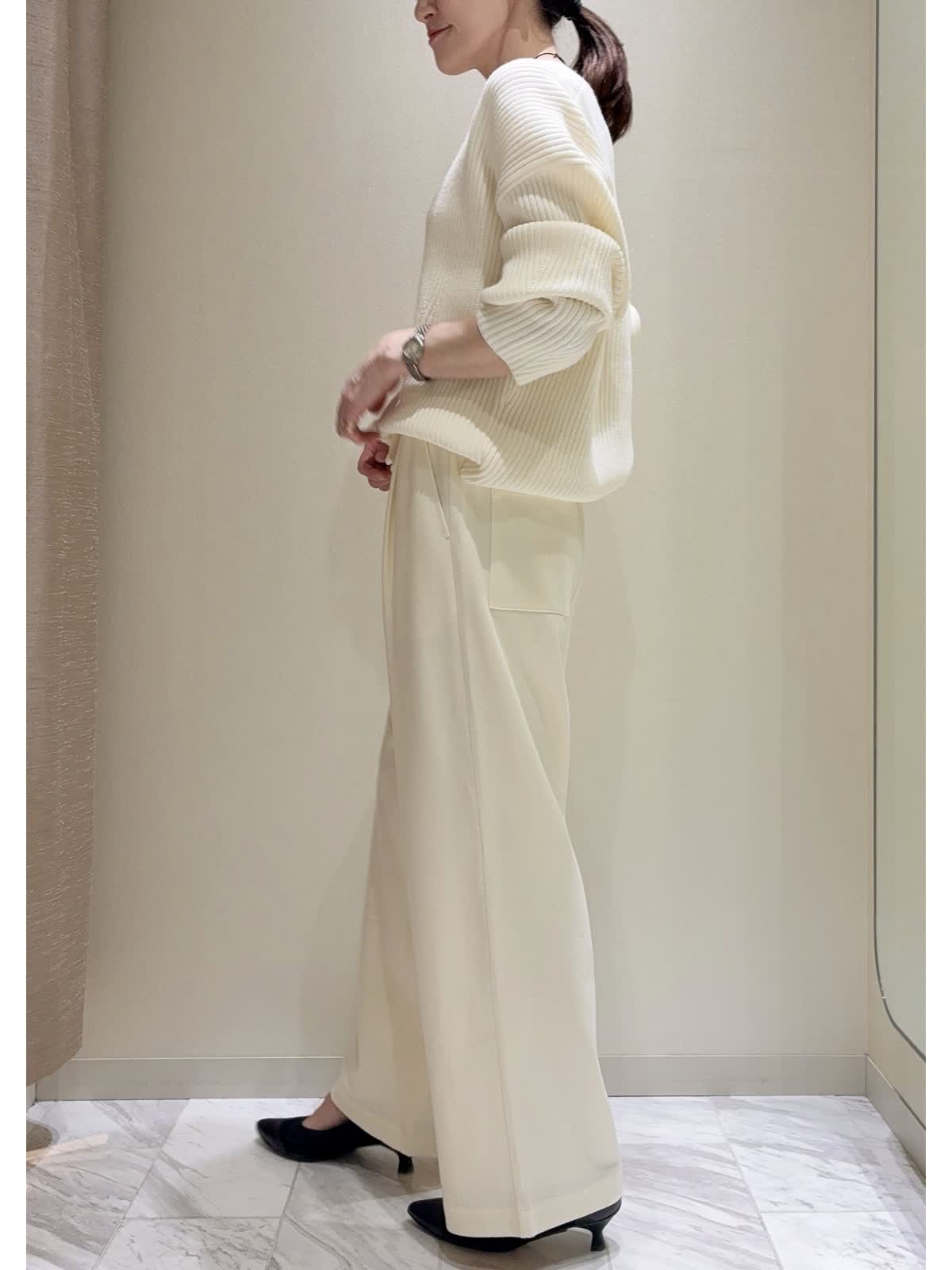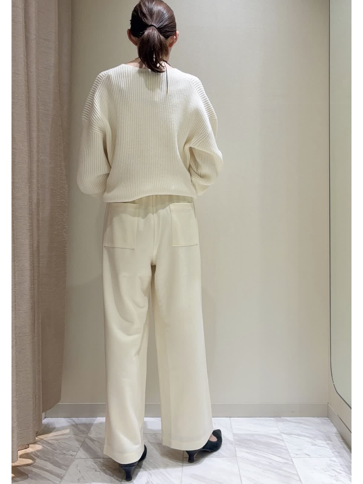 【着用サイズ】ニット:13号 パンツ:9号 【着用カラー】ニット:オフホワイト パンツ:アイボリー ゆったりニット&パンツのリラックススタイルです。 トップスのリブニットは、着丈が後ろ長めでパンツ合わせしやすいです。お好みのバランスで裾を折り返してもきれいです。私は身長167cmで普段9?11号を着用していますが、こちらではサイズアップし、ゆったり感を出して着用しました。 ボトムはドロストパンツで、ウエストゴム、ワイドシルエットのストレスフリーな履き心地です。 カジュアル過ぎないホワイトカラーコーデです。休日のリラックススタイルにぜひ。