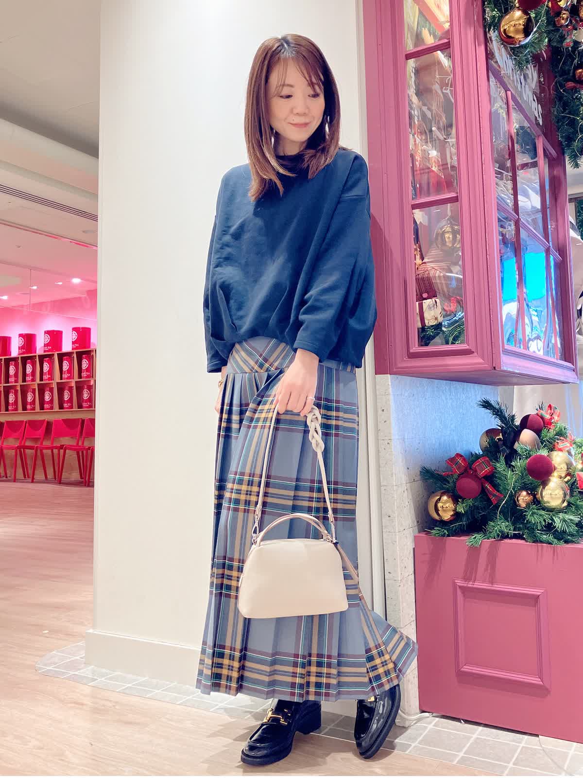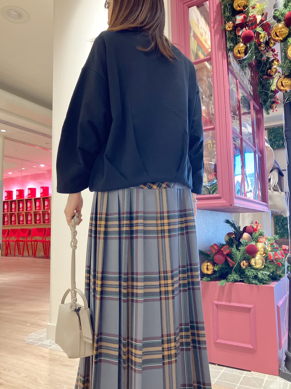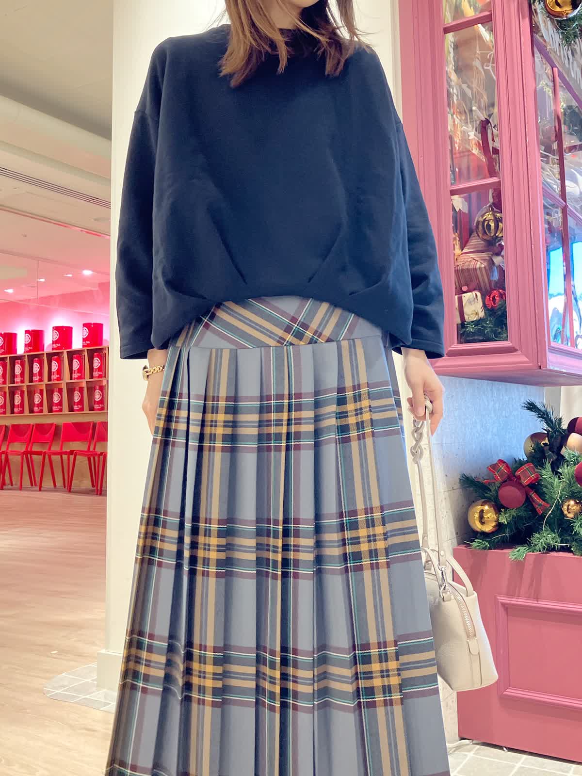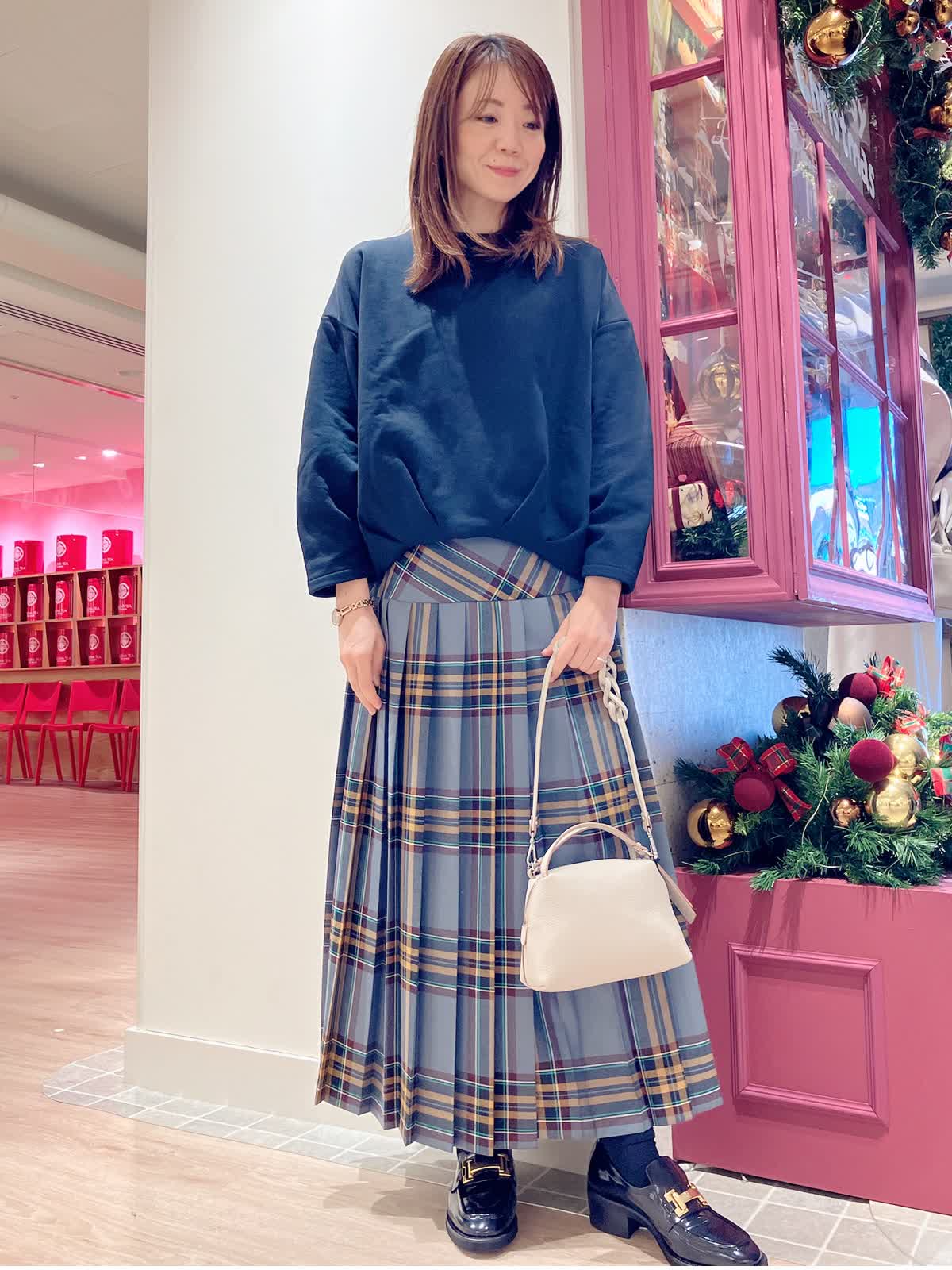 【着用サイズ】カットソー:9号 スカート:7号 【着用カラー】カットソー:ネイビー スカート:ブルーグレー コーディネートのテーマはトラッドなおしゃれスタイリングです。 裾にタックの入ったカットソーは、着丈短めで、ロングスカートとの相性バッチリ。オニールオブダブリンのチェックのスカートと合わせて、トラッドなコーディネートに。おしゃれなお出かけコーデにおすすめのスタイリングです。