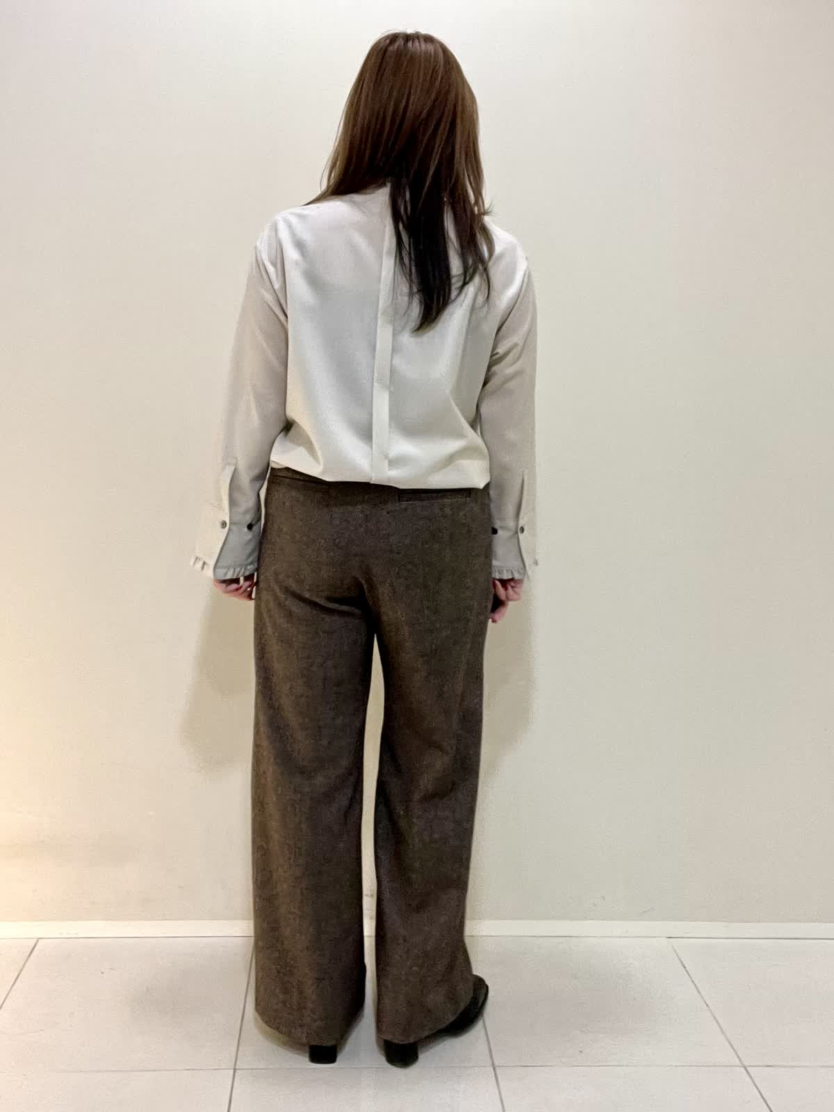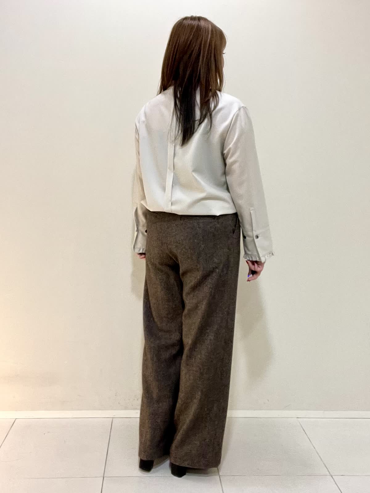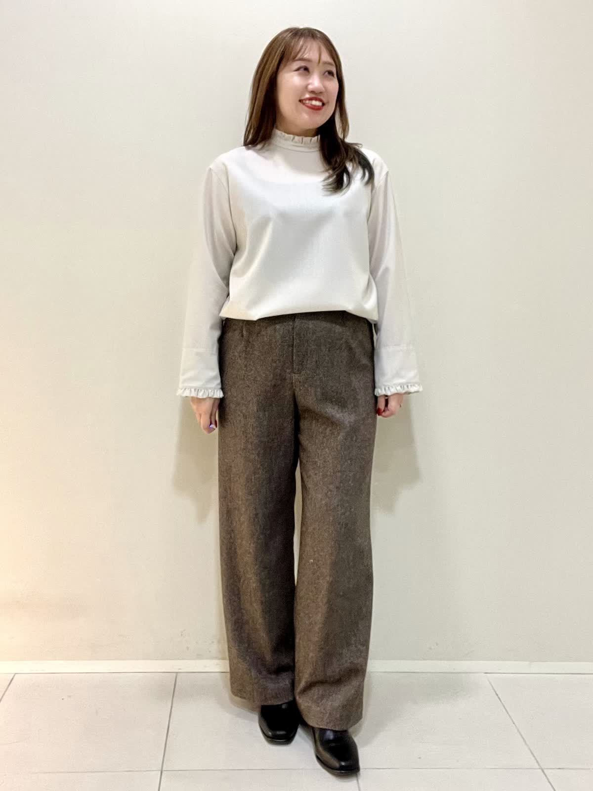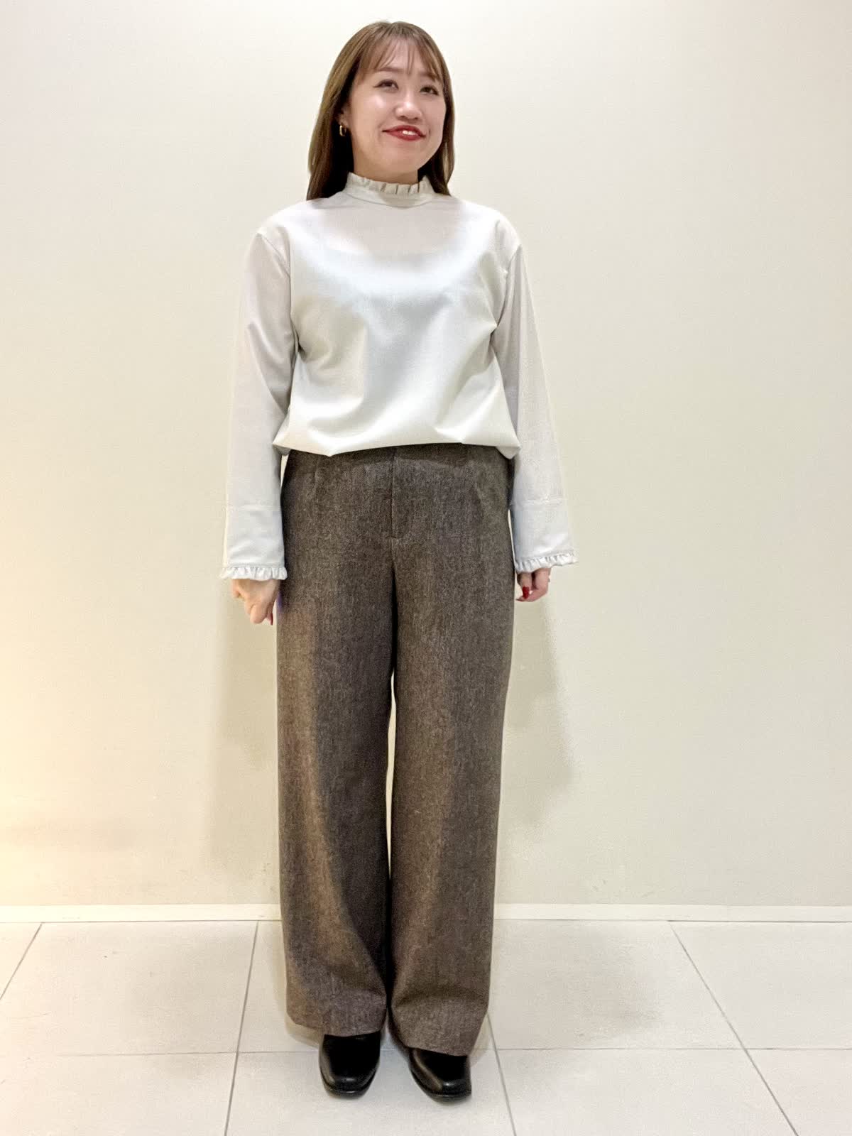【着用サイズ】ブラウス:フリー パンツ:M 【着用カラー】ブラウス:ベージュ パンツ:ブラウン オフィスカジュアルコーデ。襟と袖口がフリルのお洒落なブラウスは、ウール100%で薄手ですが暖かいです。1枚で着ても良いですが、重ね着する時にもおすすめです。さりげないフリルなので、甘くなりすぎず上品に着ていただけます。パンツは裏地がついており、とても暖かいです。ウォーム感のある生地感です。