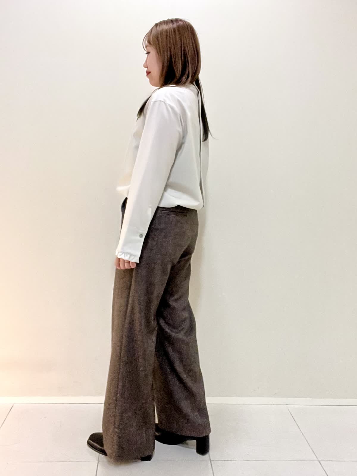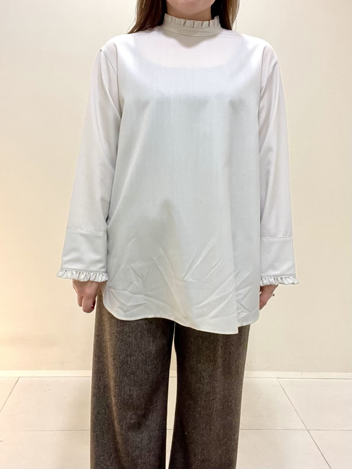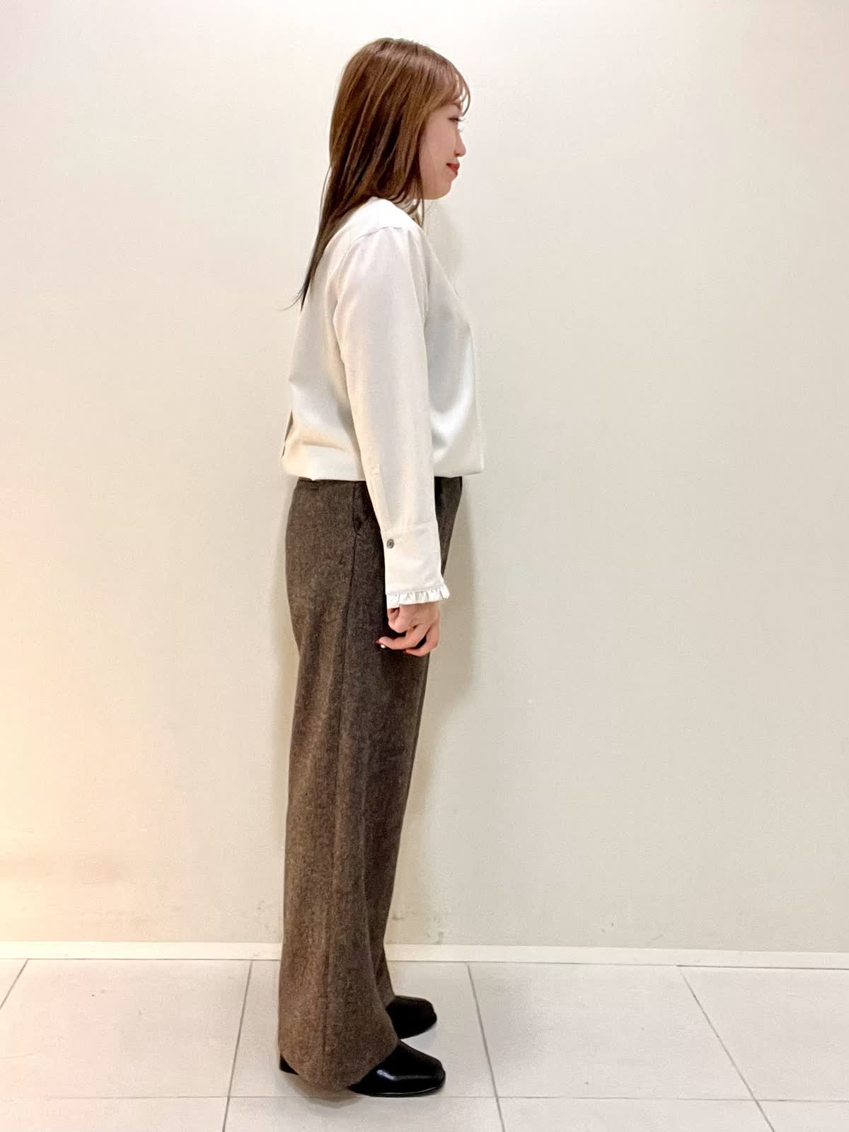 【着用サイズ】ブラウス:フリー パンツ:M 【着用カラー】ブラウス:ベージュ パンツ:ブラウン オフィスカジュアルコーデ。襟と袖口がフリルのお洒落なブラウスは、ウール100%で薄手ですが暖かいです。1枚で着ても良いですが、重ね着する時にもおすすめです。さりげないフリルなので、甘くなりすぎず上品に着ていただけます。パンツは裏地がついており、とても暖かいです。ウォーム感のある生地感です。