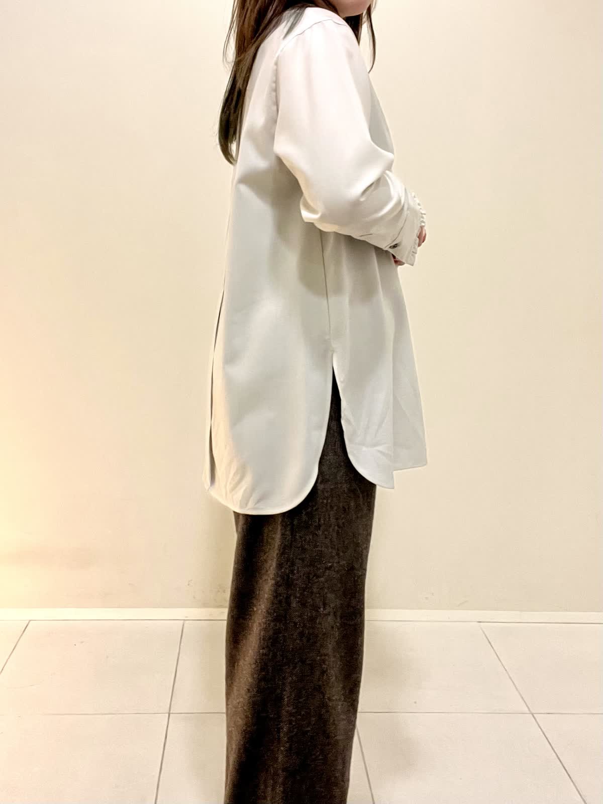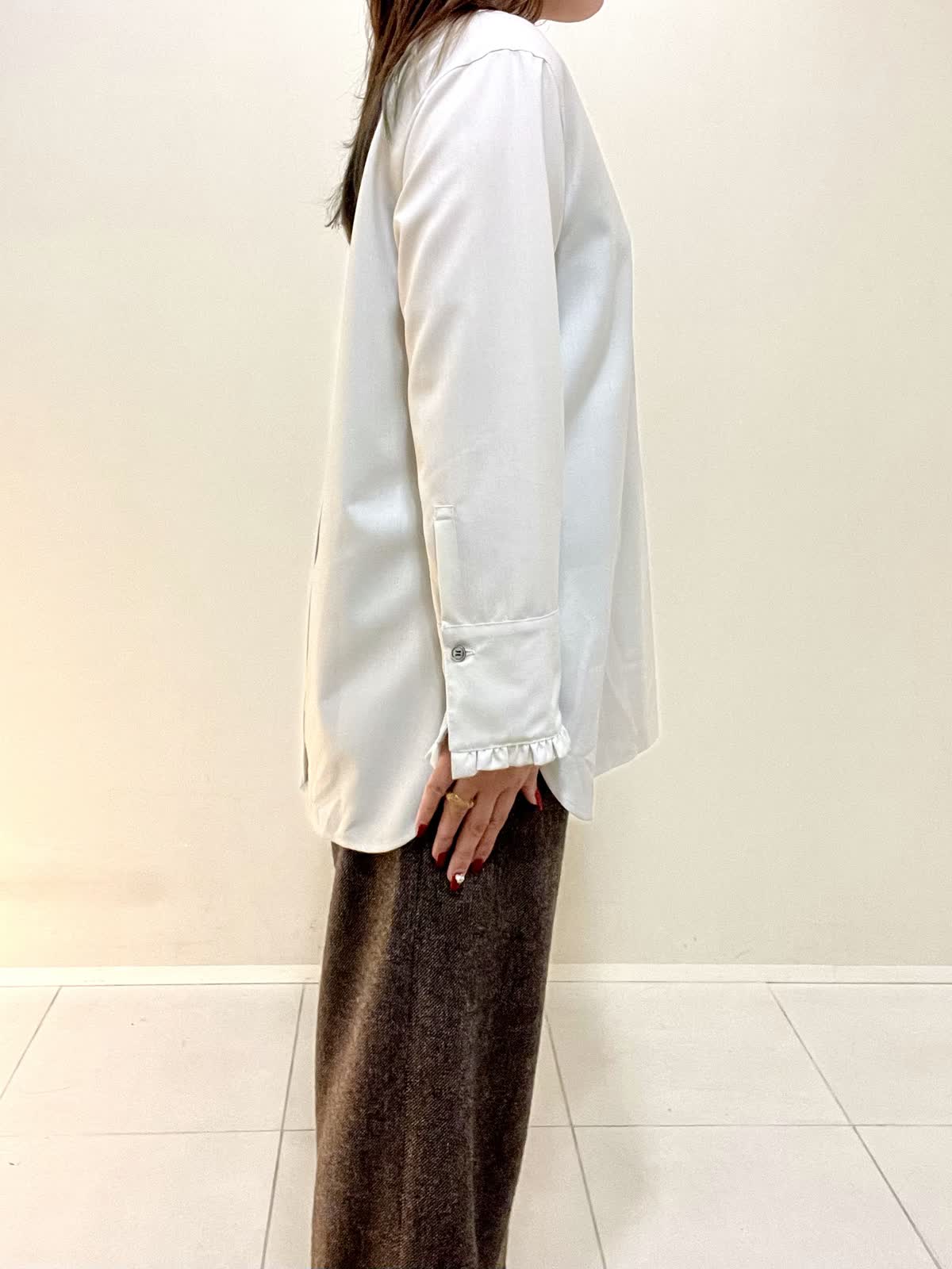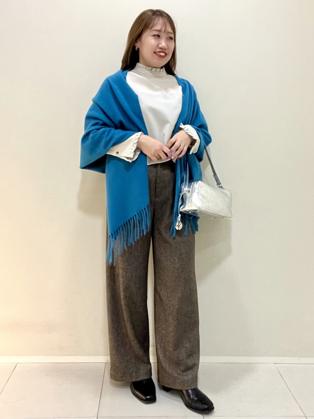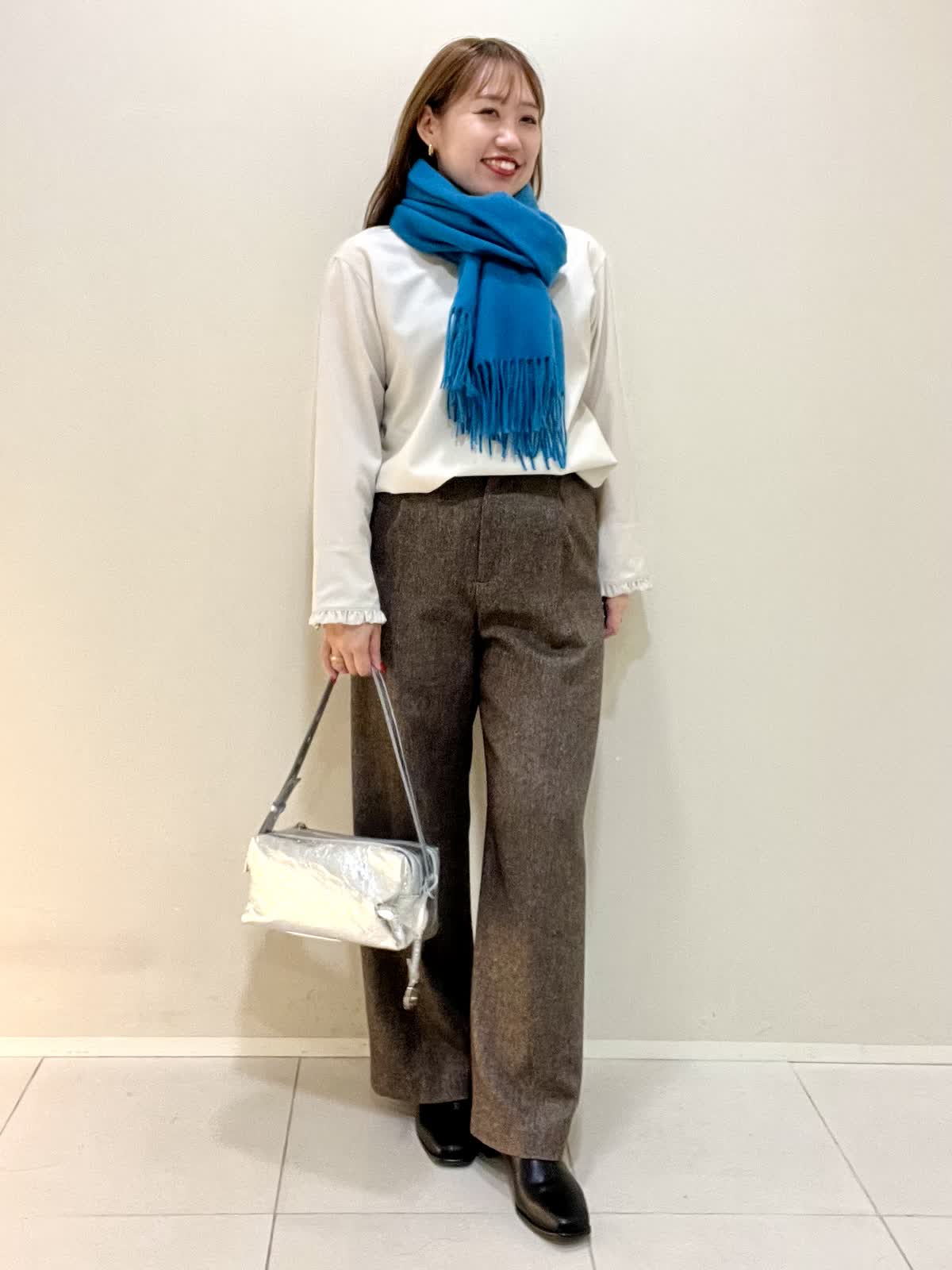 【着用サイズ】ブラウス:フリー パンツ:M 【着用カラー】ブラウス:ベージュ パンツ:ブラウン オフィスカジュアルコーデ。襟と袖口がフリルのお洒落なブラウスは、ウール100%で薄手ですが暖かいです。1枚で着ても良いですが、重ね着する時にもおすすめです。さりげないフリルなので、甘くなりすぎず上品に着ていただけます。パンツは裏地がついており、とても暖かいです。ウォーム感のある生地感です。