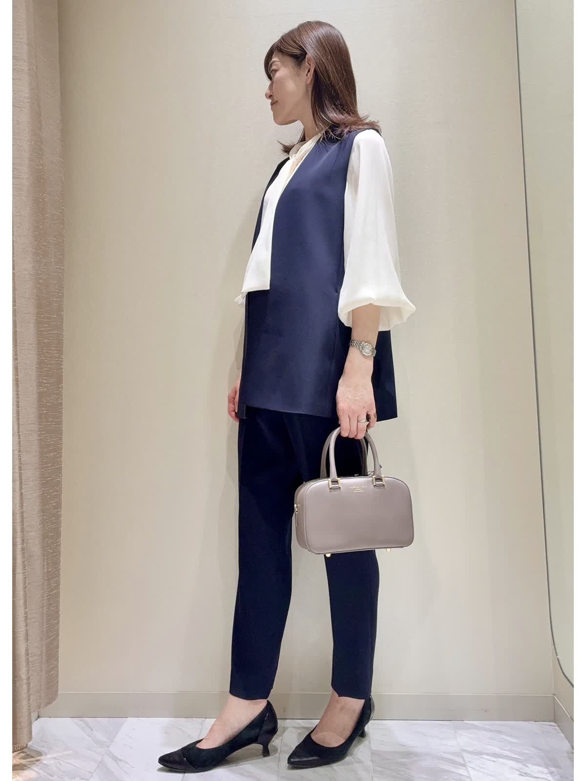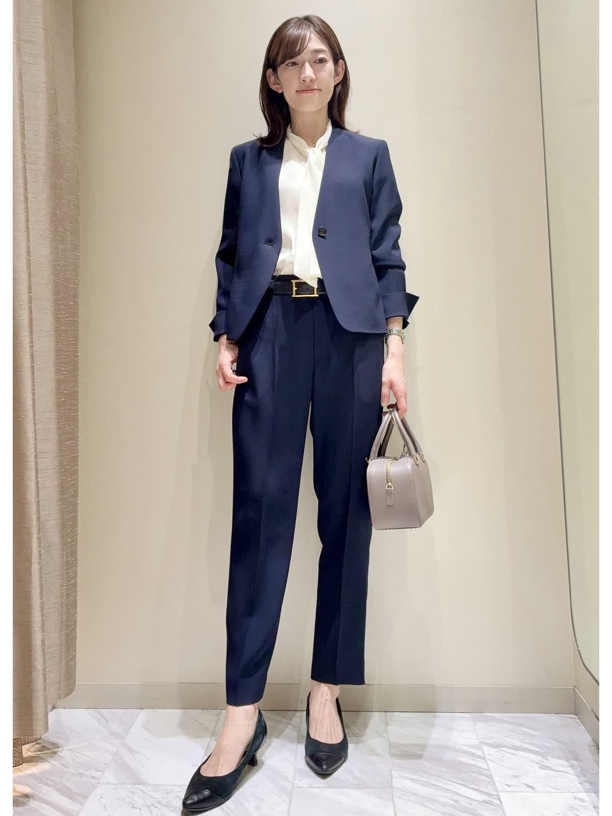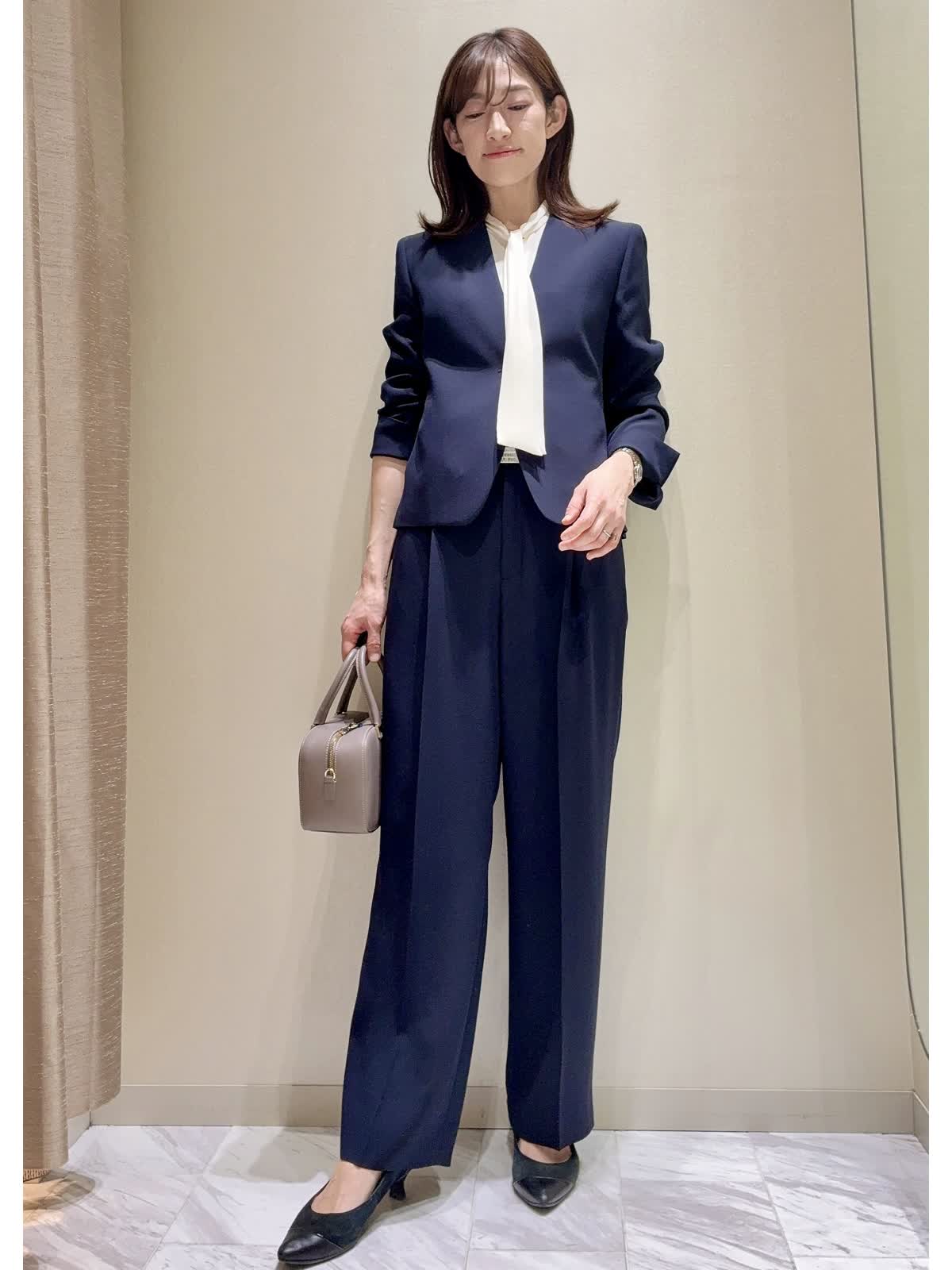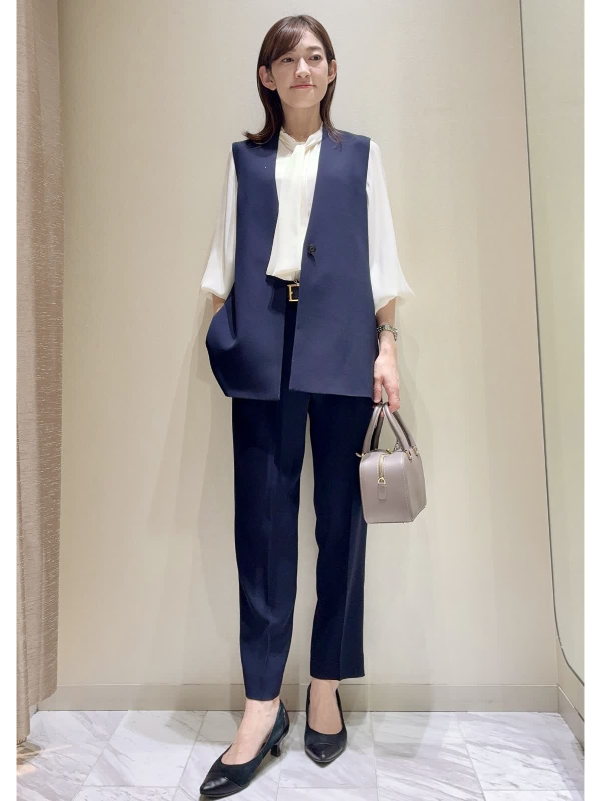 【着用サイズ】全て:9号 【着用カラー】ジャケット/ジレ/パンツ:全てネイビー ブラウス:オフホワイト バッグ:グレベージュ INEDの定番セットアップのご紹介です。 シンプルな無地のデザインで、様々なシーンで着回しできる万能セットアップです。 素材は少しシャリ感があり、きれいな落ち感が出ます。体のラインを拾いすぎないデザインです。 シワになりにくく、お洗濯可能なイージーケアもポイントです。シーズン問わずお使いいただけます。 パンツはテーパード型とセミワイド型で印象が変わります。お好きな組み合わせで、通勤や学校行事、セレモニーなど、幅広く着回ししていただけます。