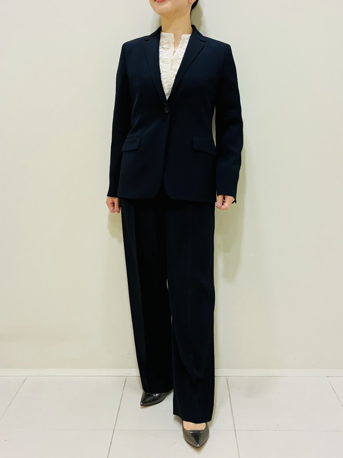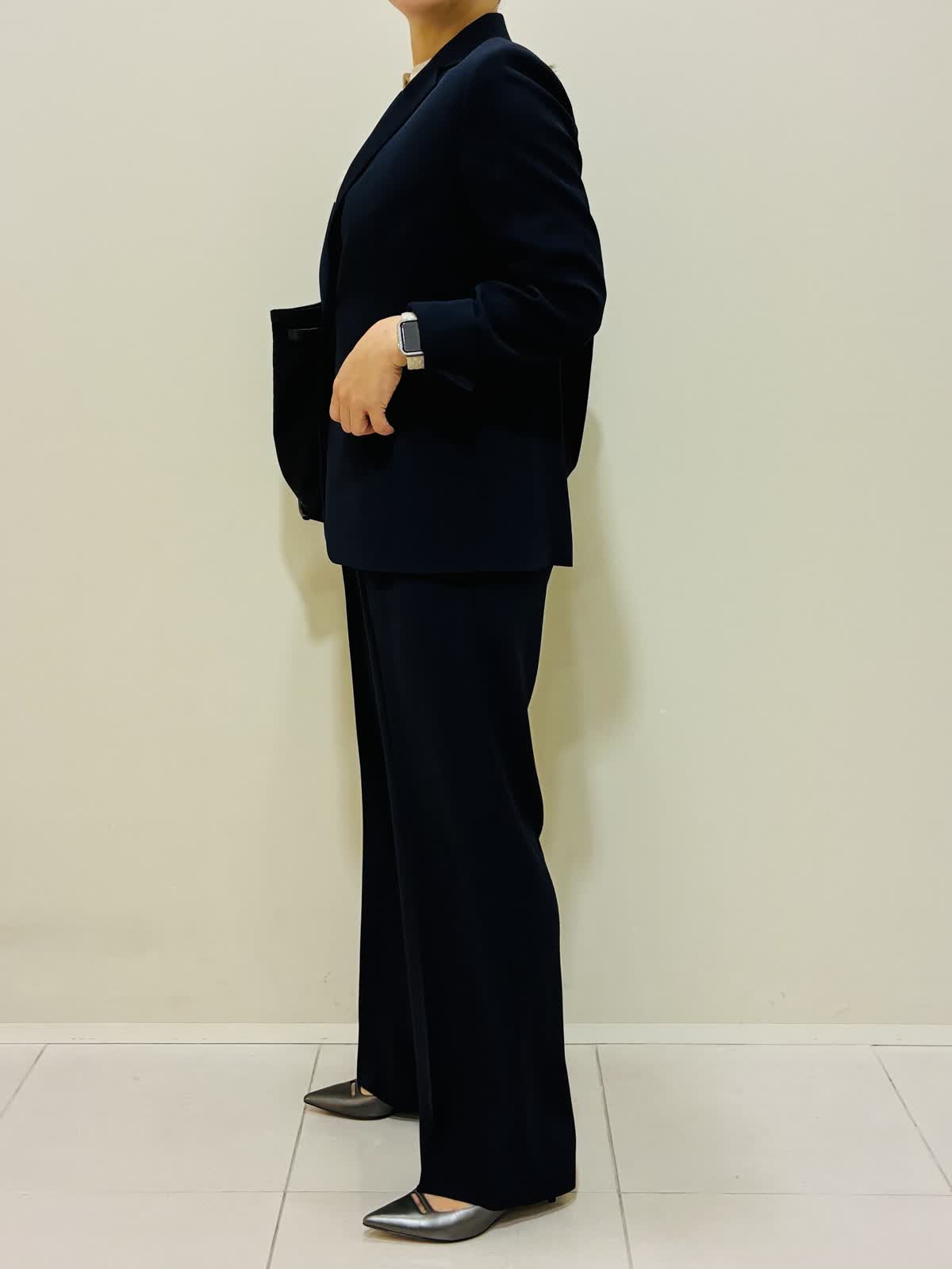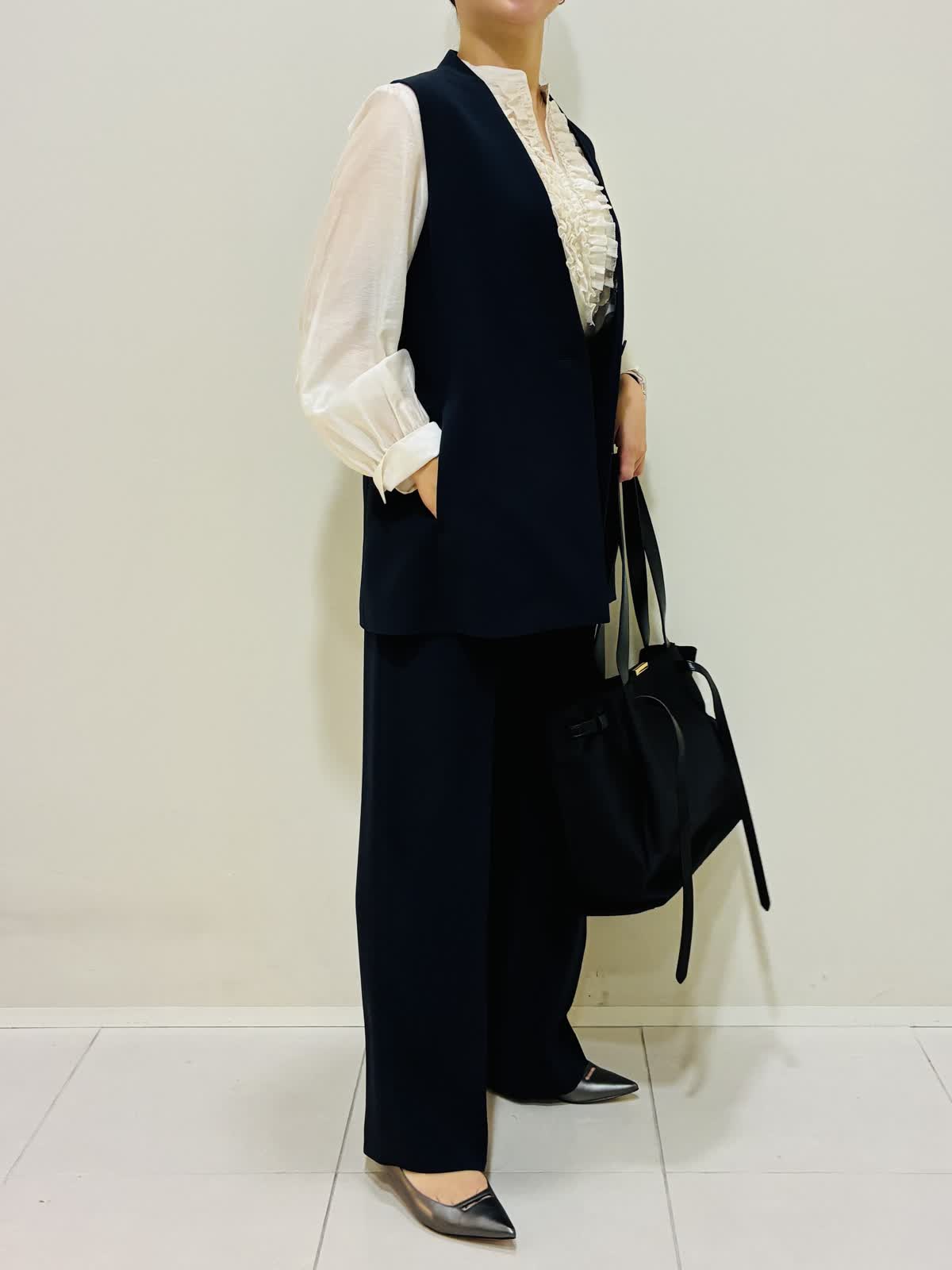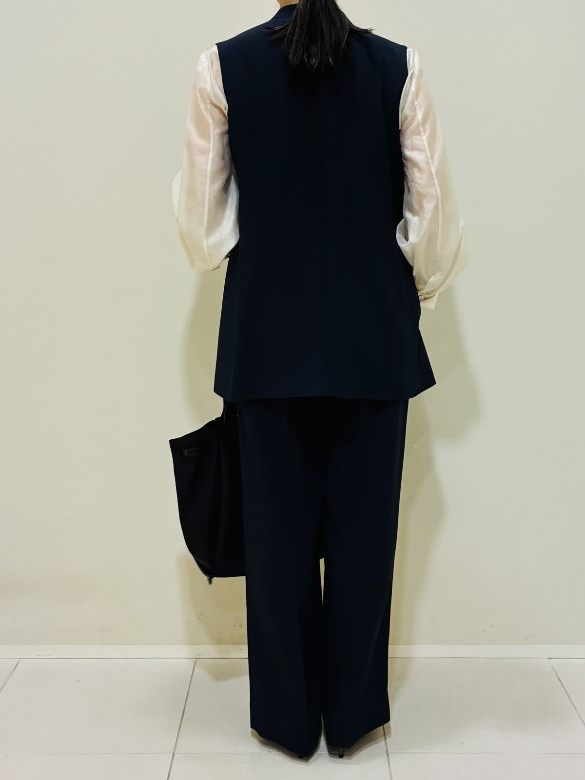 【着用サイズ】 ジレ:ネイビー:9号サイズ パンツ:ネイビー:9号サイズ ブラウス:アイボリー:9号サイズ テーラードジャケット:ネイビー:9号サイズ バッグ:ブラック 『セットアップスタイリング』 エレガントな柔らかい生地で、仕事やセレモニーどちらも使用できます。 ストレートワイドパンツの形がスッキリとしてキレイです。 ジレとテーラードは丈が少し長めでお尻が隠れるので安心です。