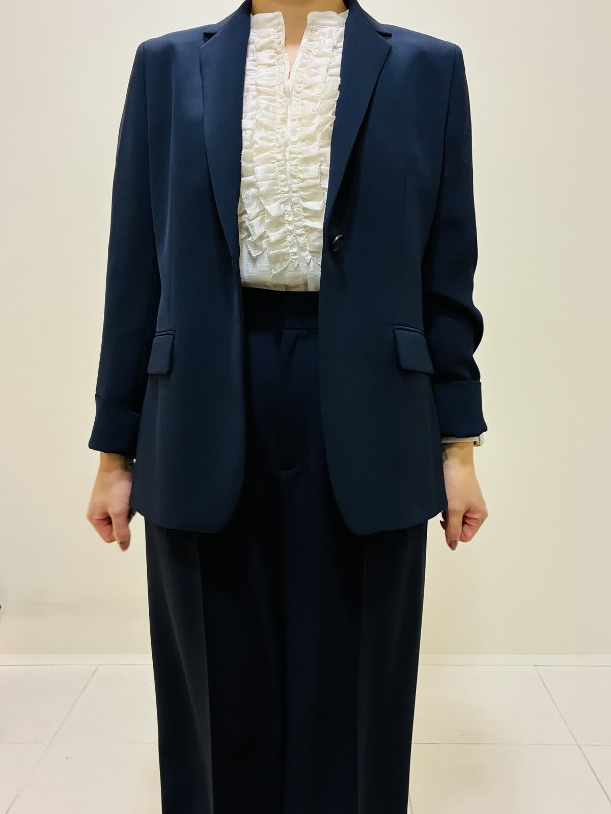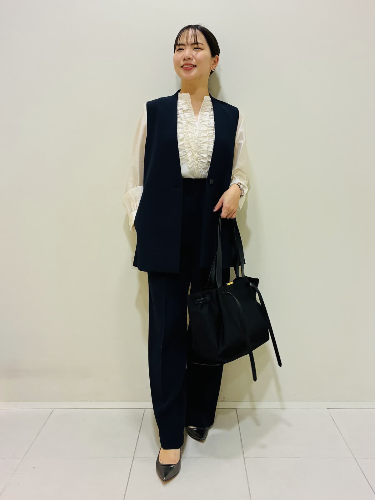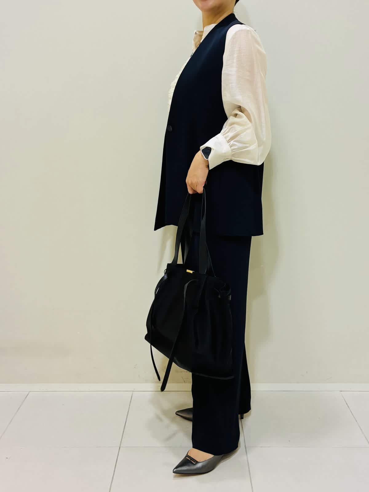 【着用サイズ】 ジレ:ネイビー:9号サイズ パンツ:ネイビー:9号サイズ ブラウス:アイボリー:9号サイズ テーラードジャケット:ネイビー:9号サイズ バッグ:ブラック 『セットアップスタイリング』 エレガントな柔らかい生地で、仕事やセレモニーどちらも使用できます。 ストレートワイドパンツの形がスッキリとしてキレイです。 ジレとテーラードは丈が少し長めでお尻が隠れるので安心です。