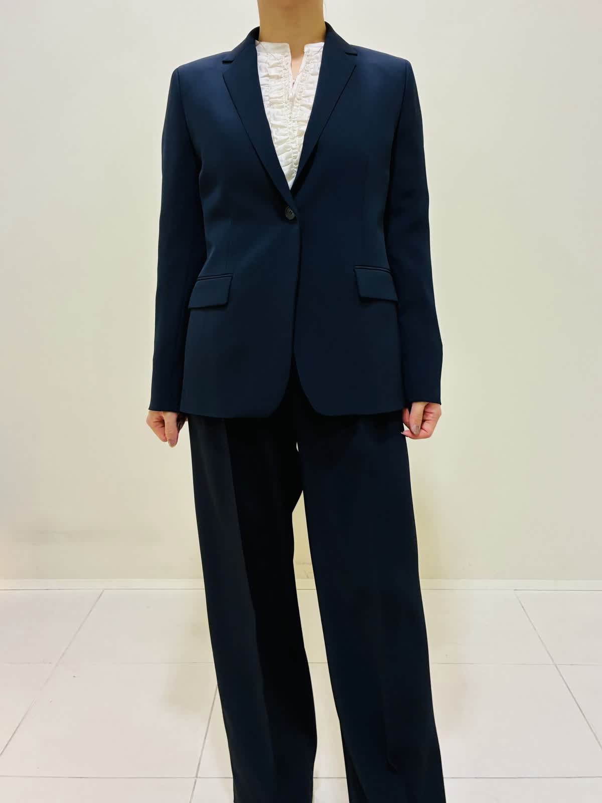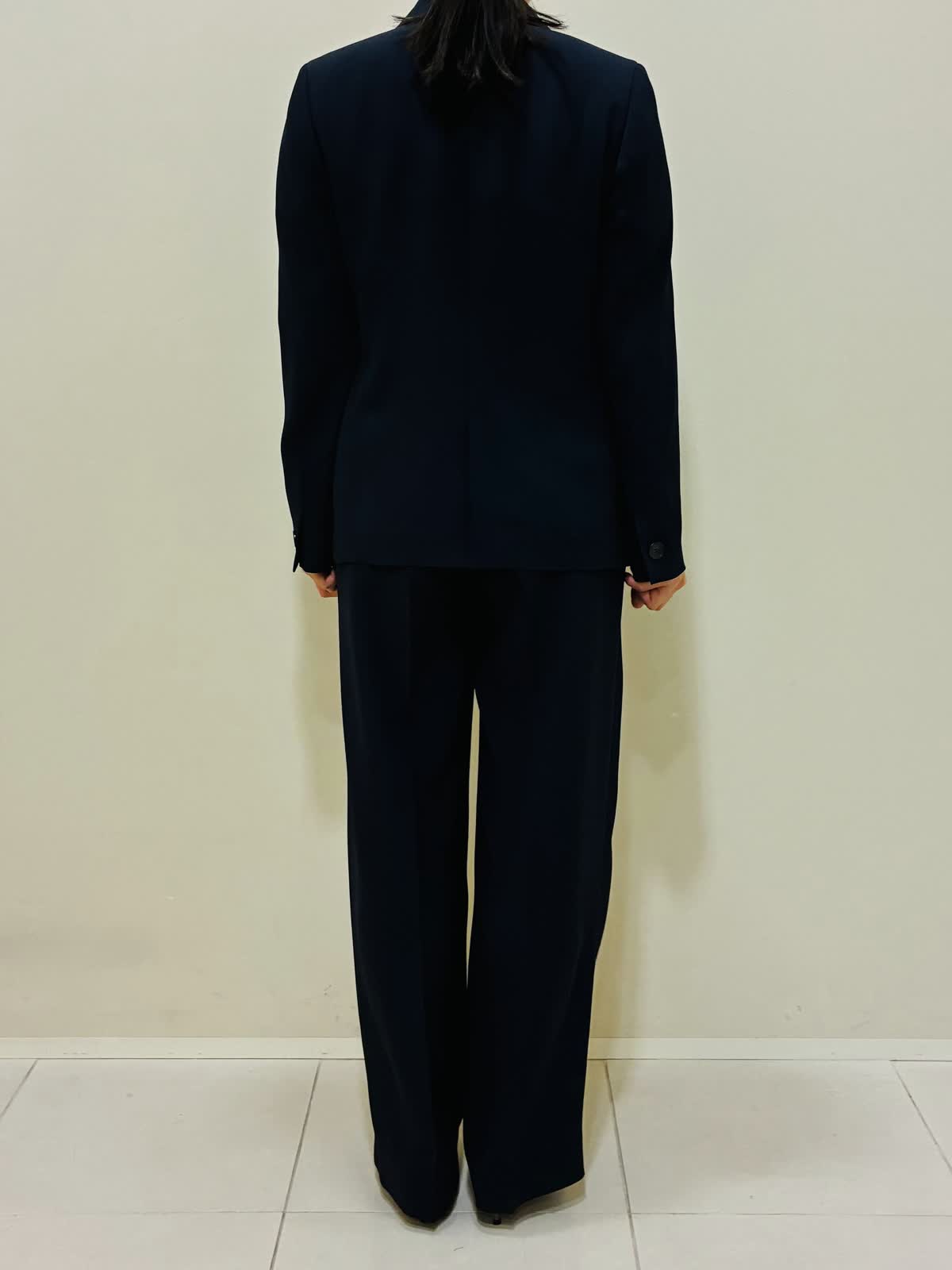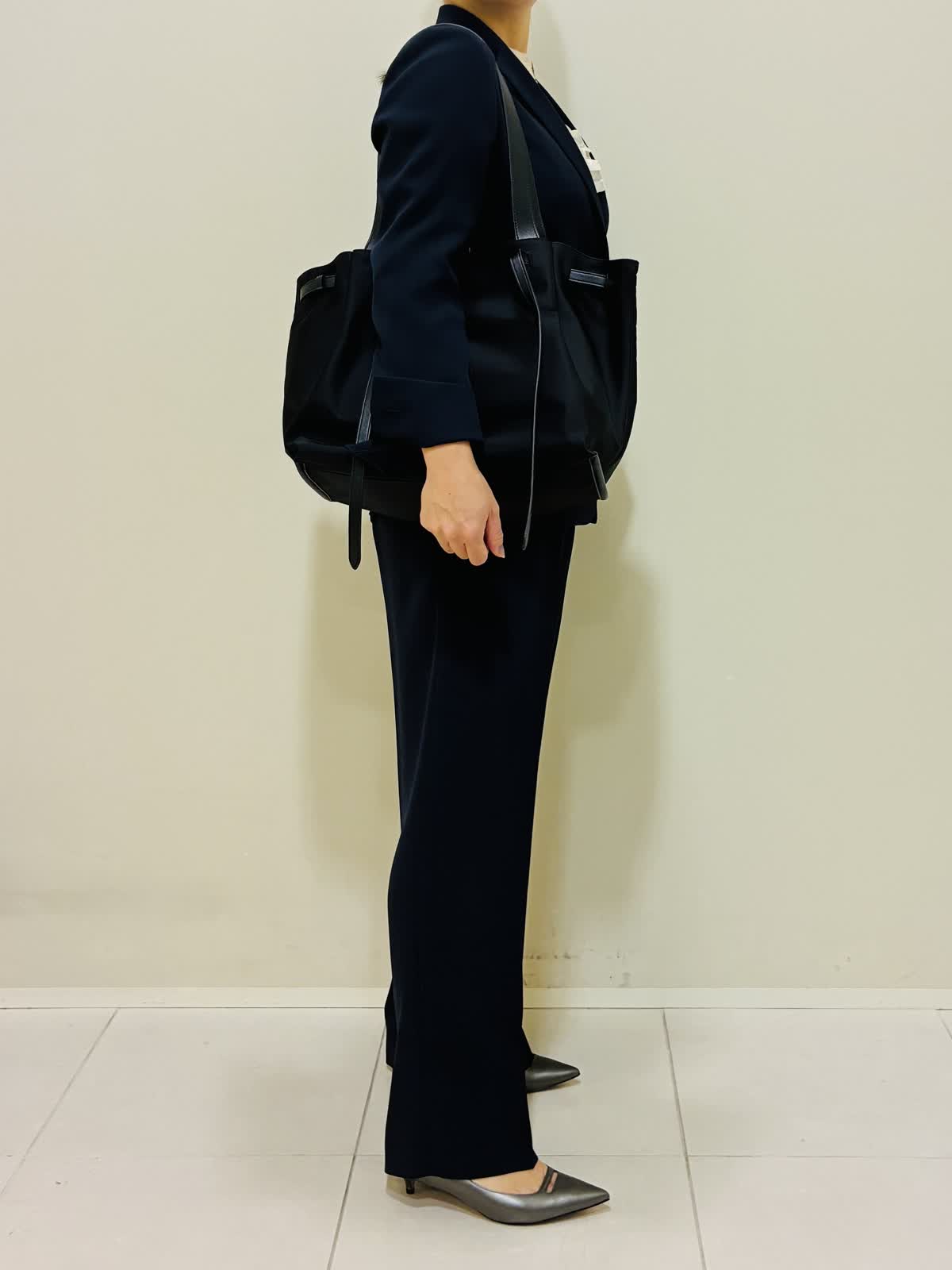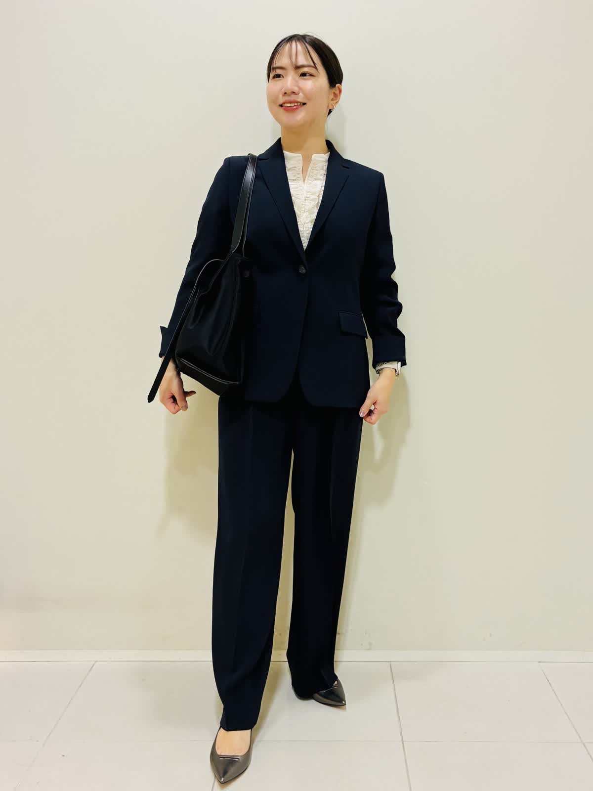【着用サイズ】 ジレ:ネイビー:9号サイズ パンツ:ネイビー:9号サイズ ブラウス:アイボリー:9号サイズ テーラードジャケット:ネイビー:9号サイズ バッグ:ブラック 『セットアップスタイリング』 エレガントな柔らかい生地で、仕事やセレモニーどちらも使用できます。 ストレートワイドパンツの形がスッキリとしてキレイです。 ジレとテーラードは丈が少し長めでお尻が隠れるので安心です。