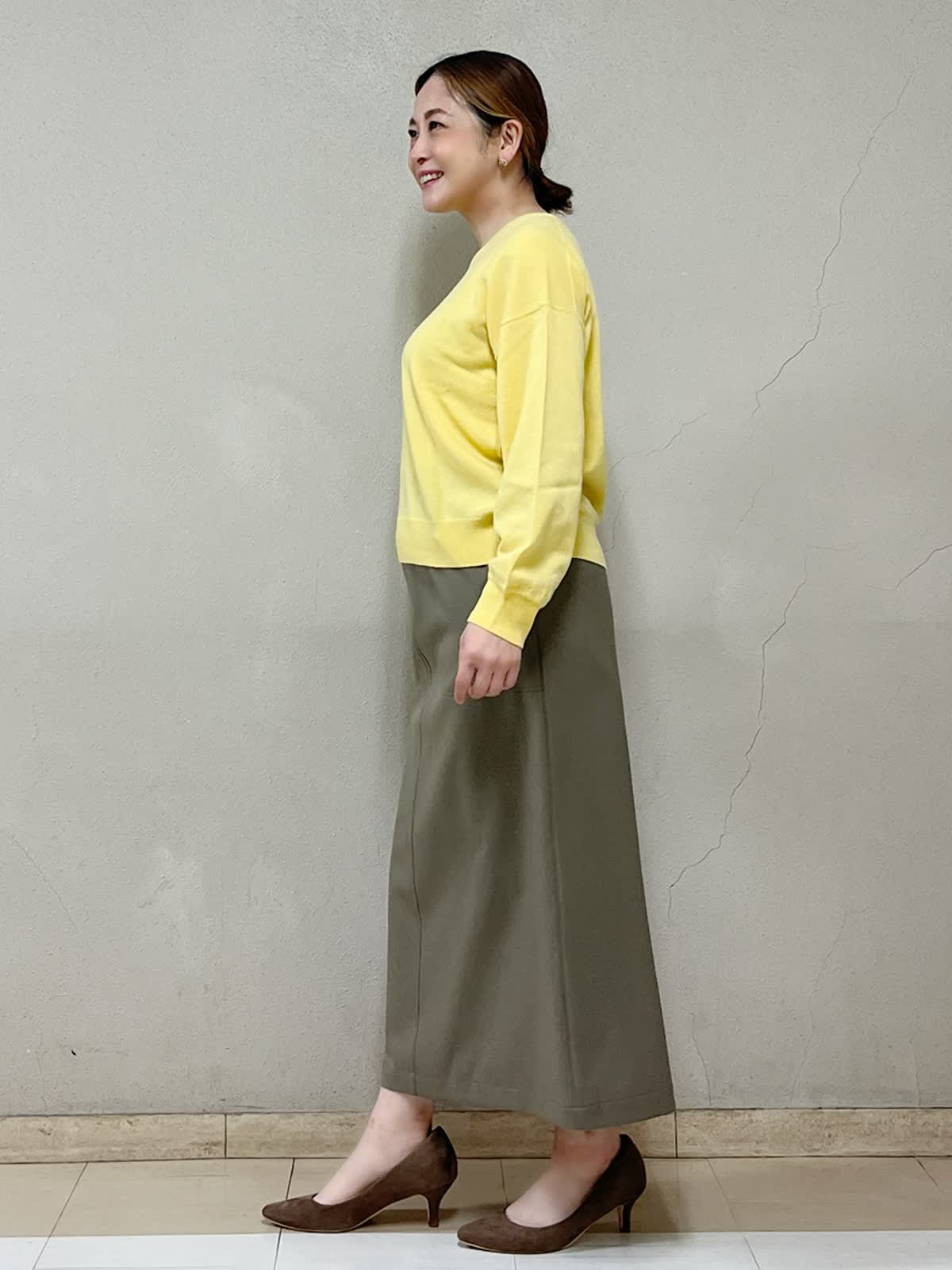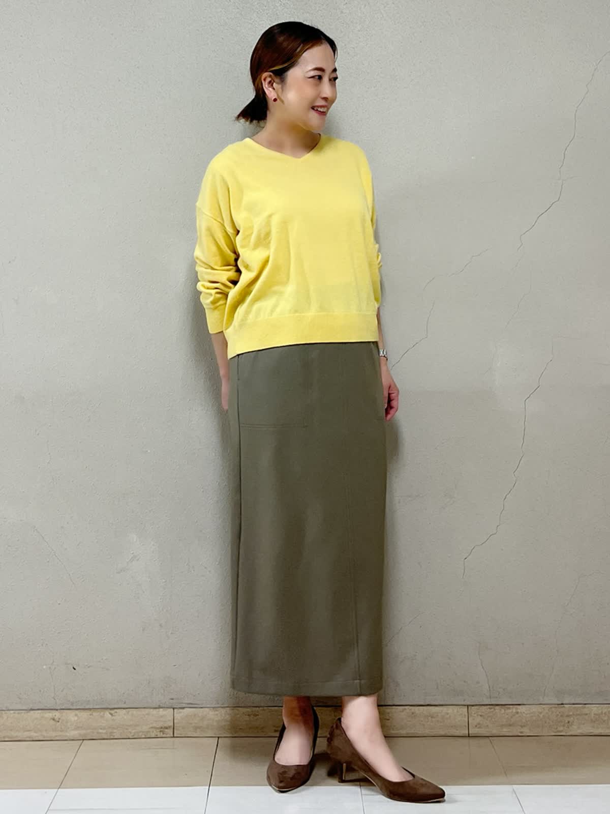 【着用サイズ】ニット:9号 スカート:9号 【着用カラー】ニット:イエロー スカート:モカチャ 仕事終わりのお出かけコーディネートです。シンプルなスタイリングですが気持ちが上がるきれい色のイエローのニットです。ふんわり柔らかく肌触りが良いです。Vネックの開きは大き過ぎず着やすいです。スカートはストレートのシルエットですっきりと見せてくれます。カジュアルにもきれいめにも合わせられます。