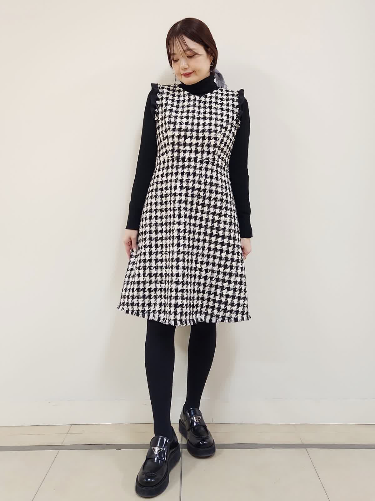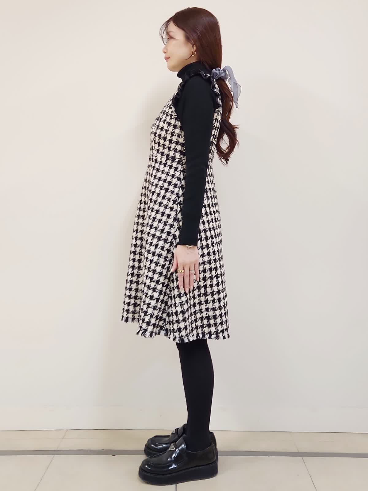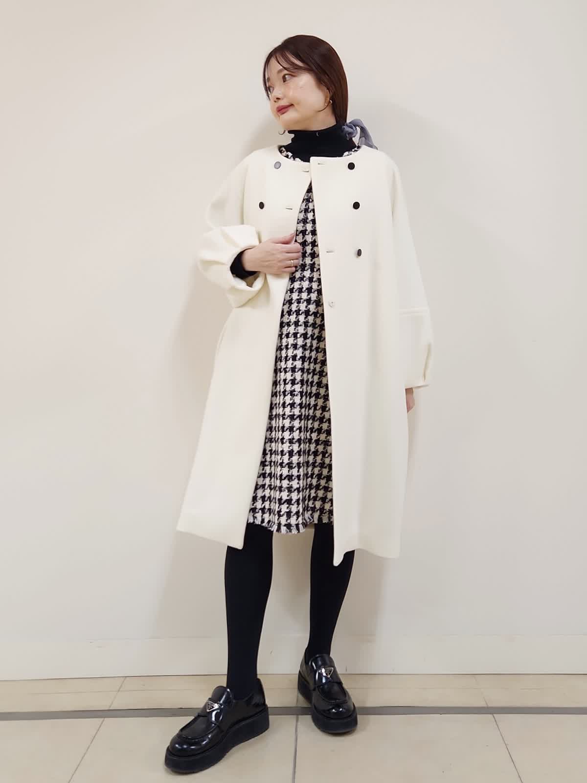 【着用サイズ】ワンピース:9号/チドリ ニット:9号/ブラック コート:9号/オフホワイト クラシカルでフェミニンな白黒のモノトーンコーデ。【ワンピース】ジャストサイズ。薄手のインナーは重ね着できます。浅めのVネックなので一枚着でカーディガンを羽織っても◎ 【ニット】INEDの冬の定番リブニット。サラサラで着心地良いです。骨ストで首が短いので、首元のタートル部分は内側に1折りしてます。【コート】袖と身幅がたっぷりで楽ちんサイズ。7号でも着られるましたが、袖丈が元々短いのでいつものサイズを選びます。