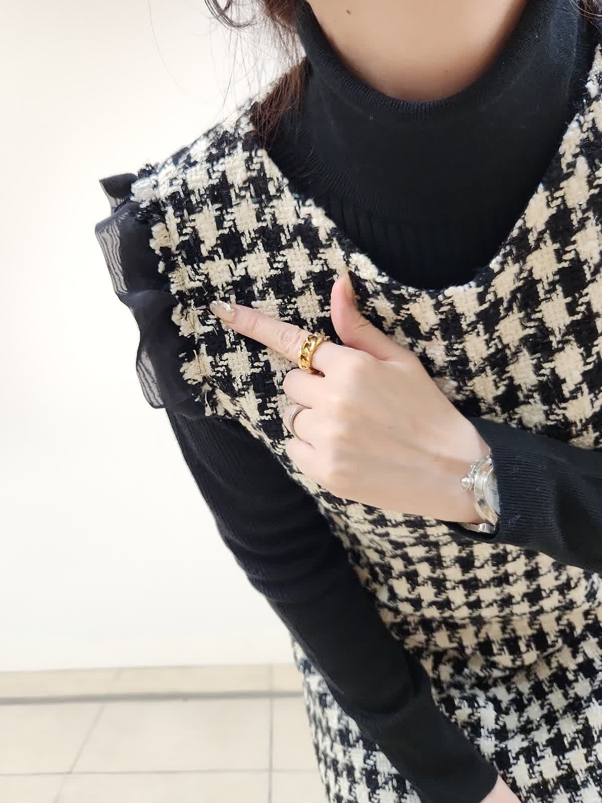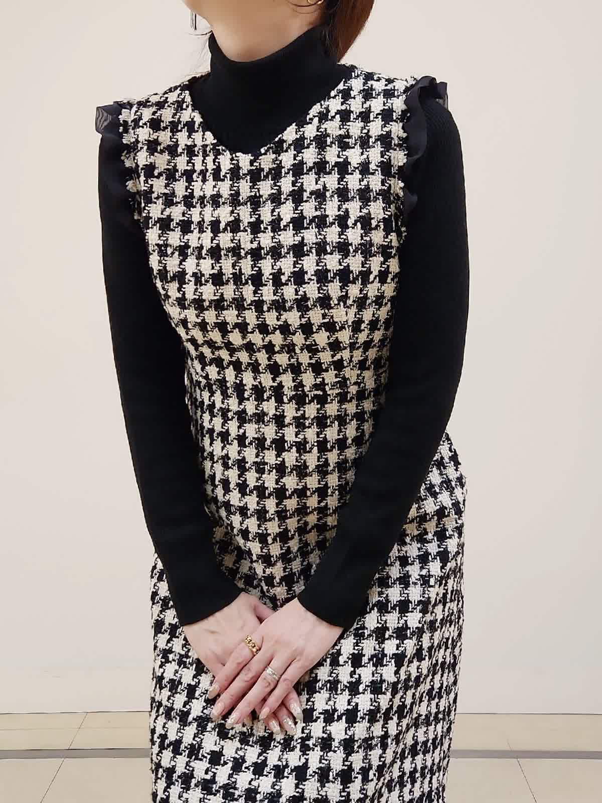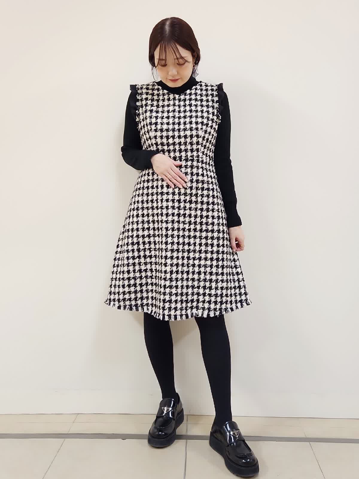 【着用サイズ】ワンピース:9号/チドリ ニット:9号/ブラック コート:9号/オフホワイト クラシカルでフェミニンな白黒のモノトーンコーデ。【ワンピース】ジャストサイズ。薄手のインナーは重ね着できます。浅めのVネックなので一枚着でカーディガンを羽織っても◎ 【ニット】INEDの冬の定番リブニット。サラサラで着心地良いです。骨ストで首が短いので、首元のタートル部分は内側に1折りしてます。【コート】袖と身幅がたっぷりで楽ちんサイズ。7号でも着られるましたが、袖丈が元々短いのでいつものサイズを選びます。
