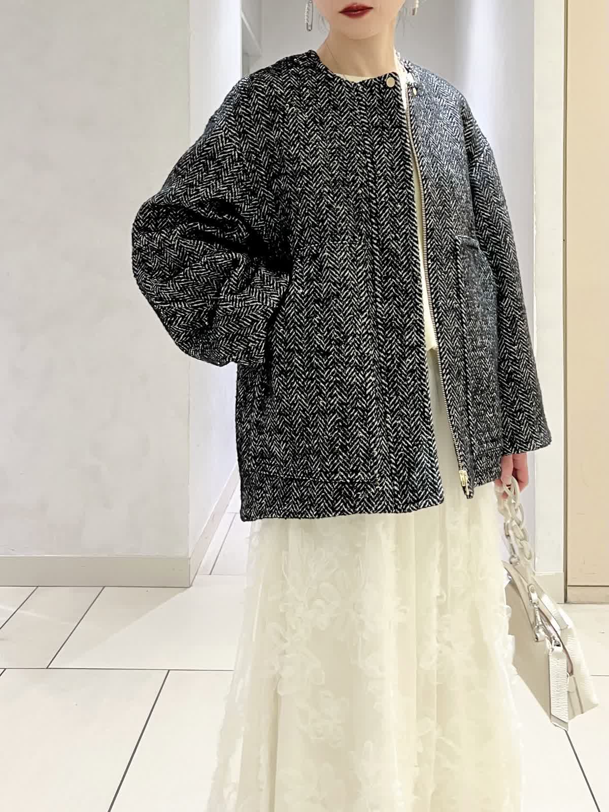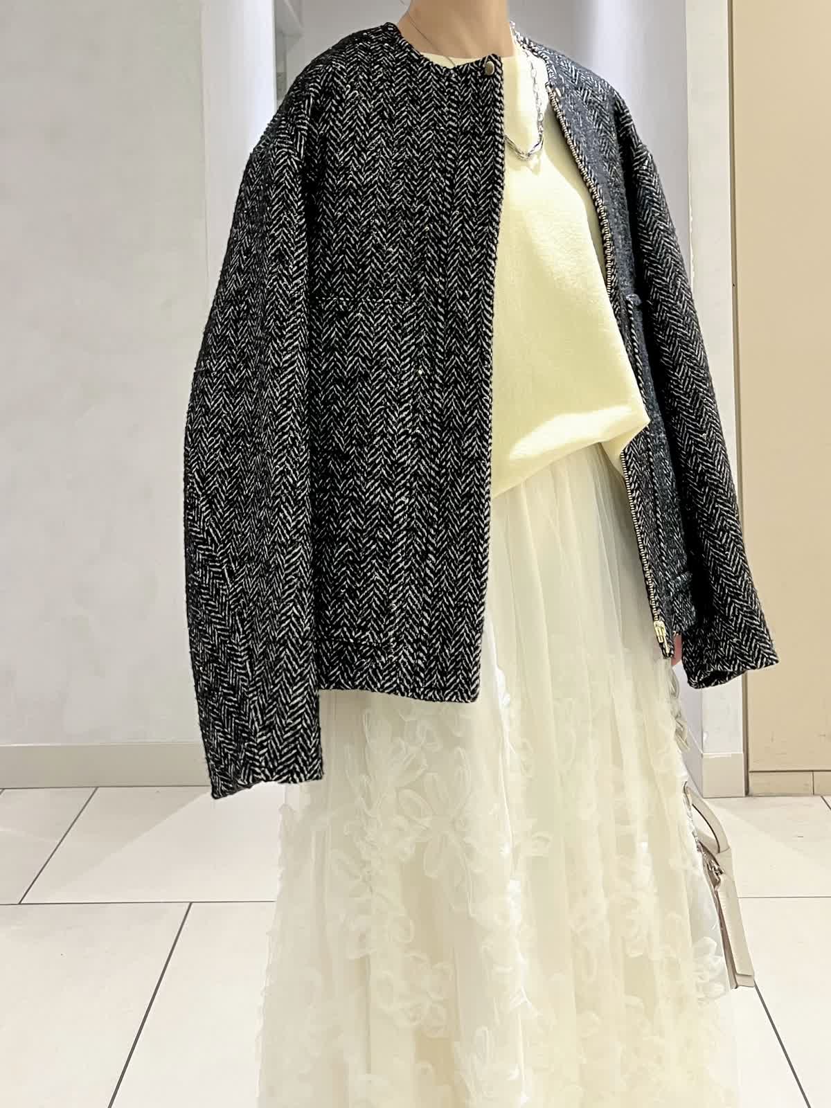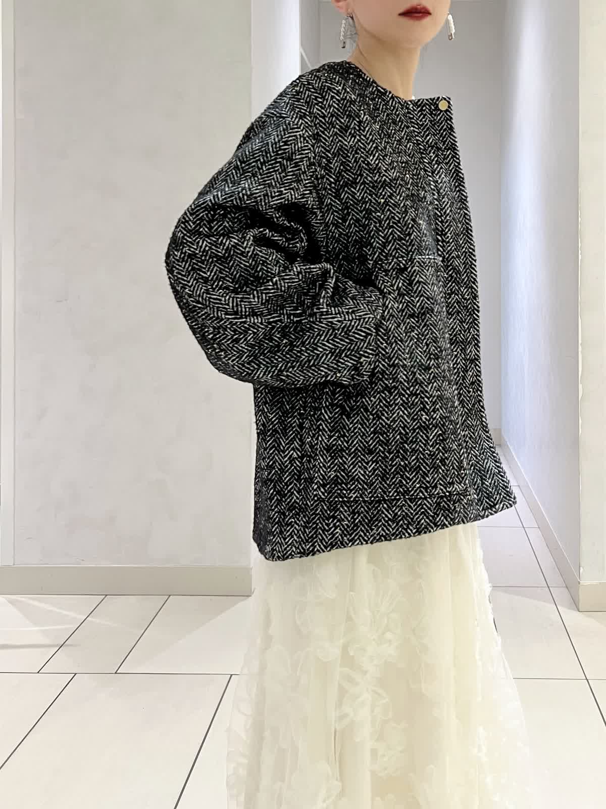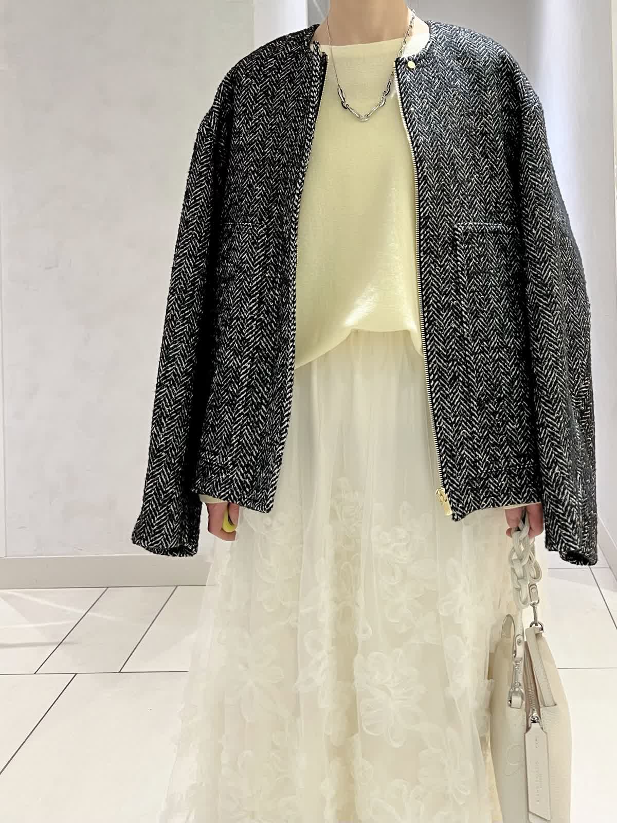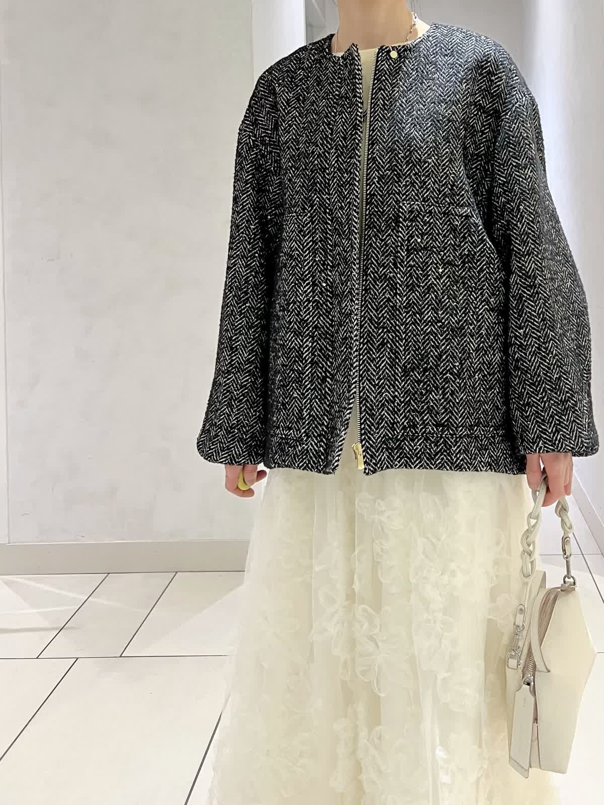 【カラー・サイズ】ジャケット:ヘリンボーン・9号 ニット:イエロー・9号 スカート:オフホワイト・9号ノーカラーに大きめポケットを合わせた、デイリーに使いやすい一着。前ジップとスナップ釦がさりげないポイントです。後ろ下がりの丈感でヒップラインをカバーし、ボトムを選ばず着回し可能。さっと羽織れて、初冬から長く活躍します。