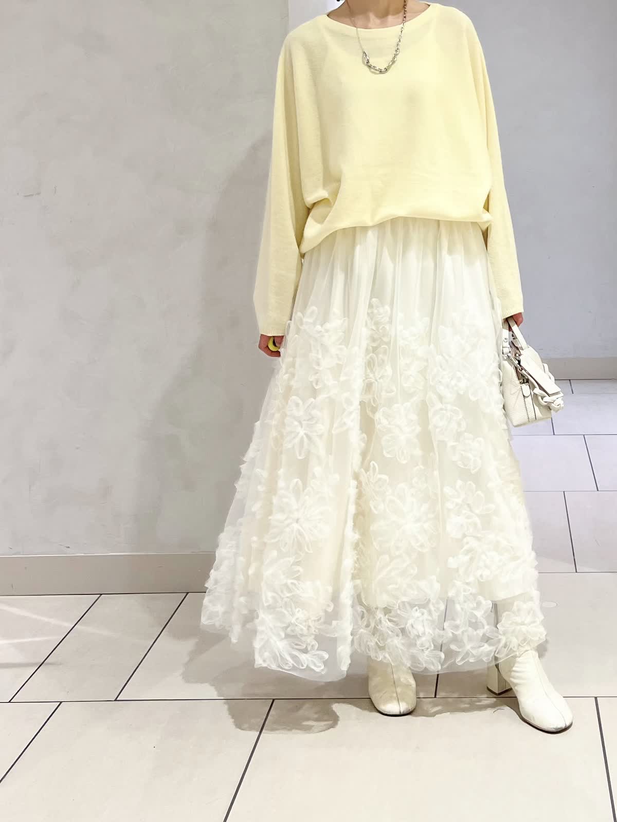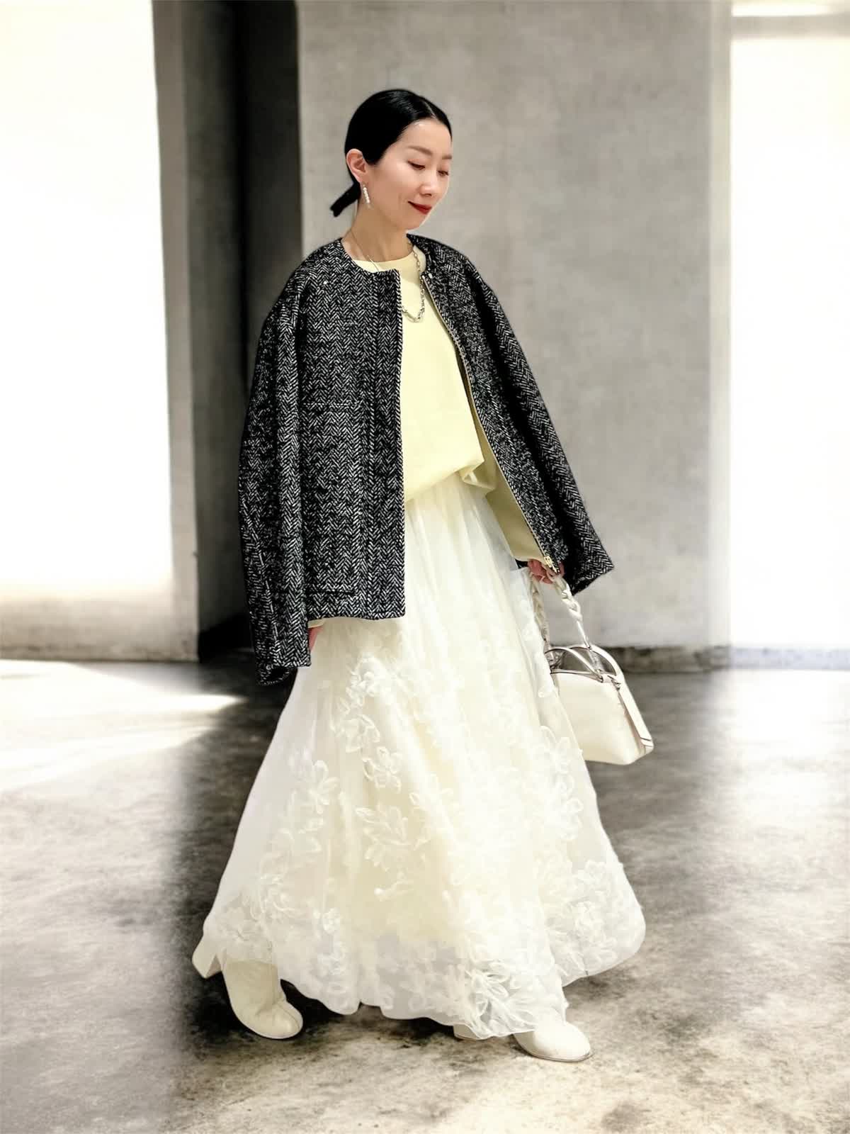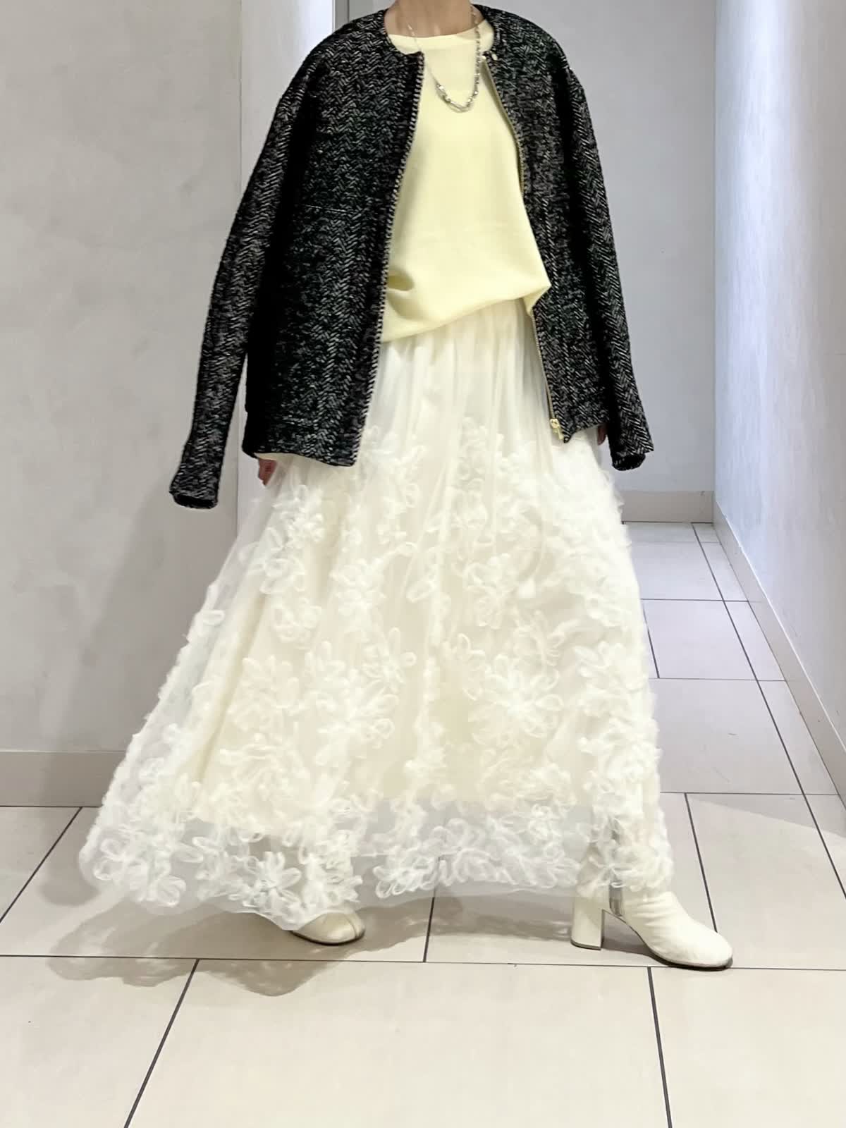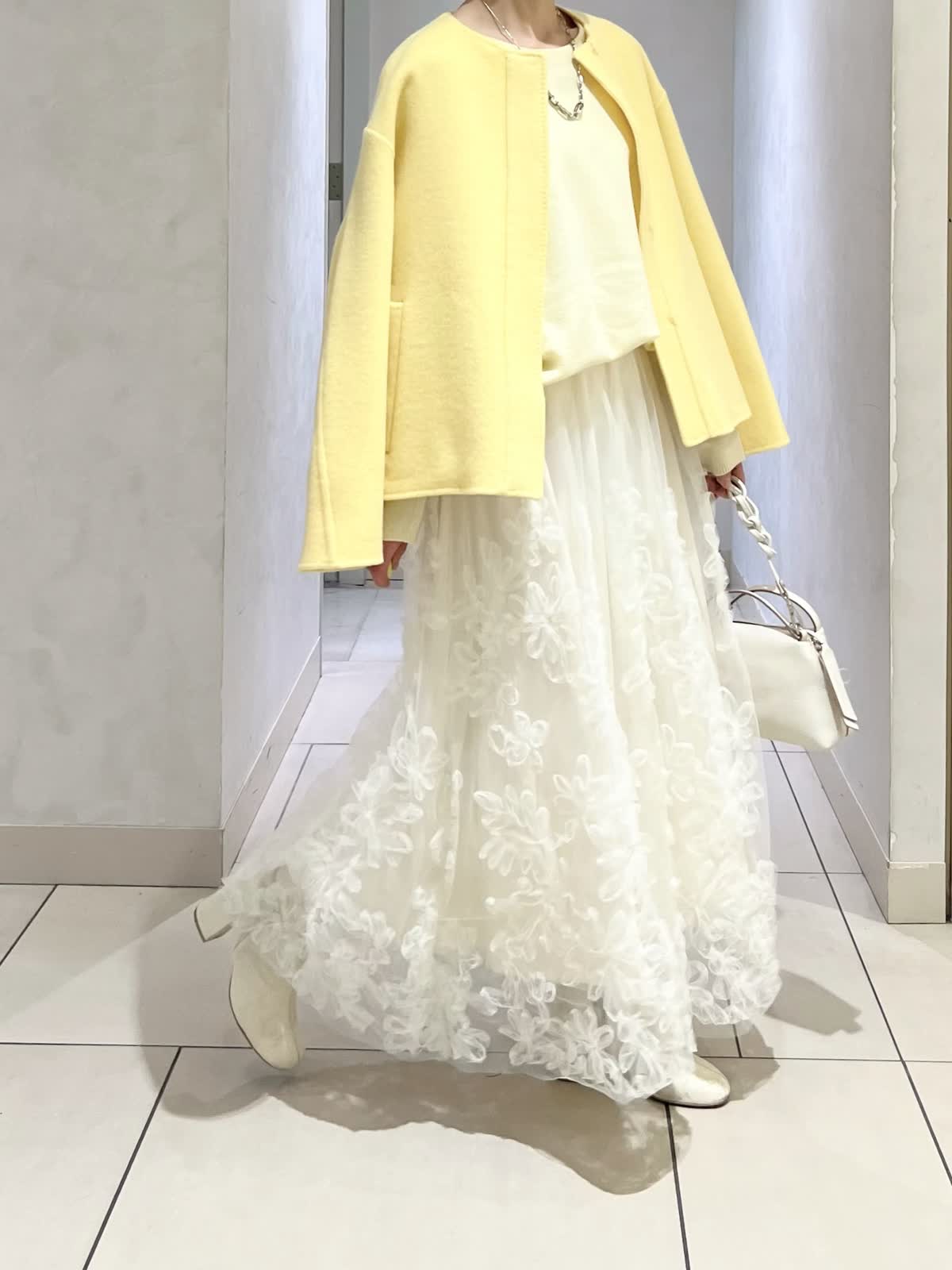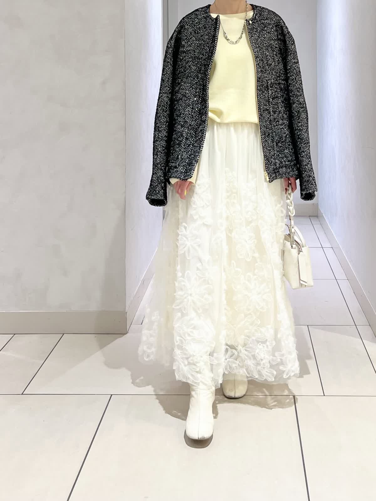 【カラー・サイズ】ジャケット:ヘリンボーン・9号 ニット:イエロー・9号 スカート:オフホワイト・9号ノーカラーに大きめポケットを合わせた、デイリーに使いやすい一着。前ジップとスナップ釦がさりげないポイントです。後ろ下がりの丈感でヒップラインをカバーし、ボトムを選ばず着回し可能。さっと羽織れて、初冬から長く活躍します。