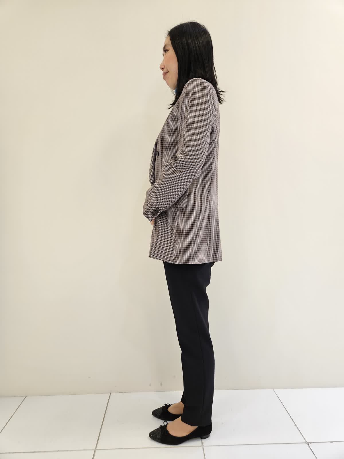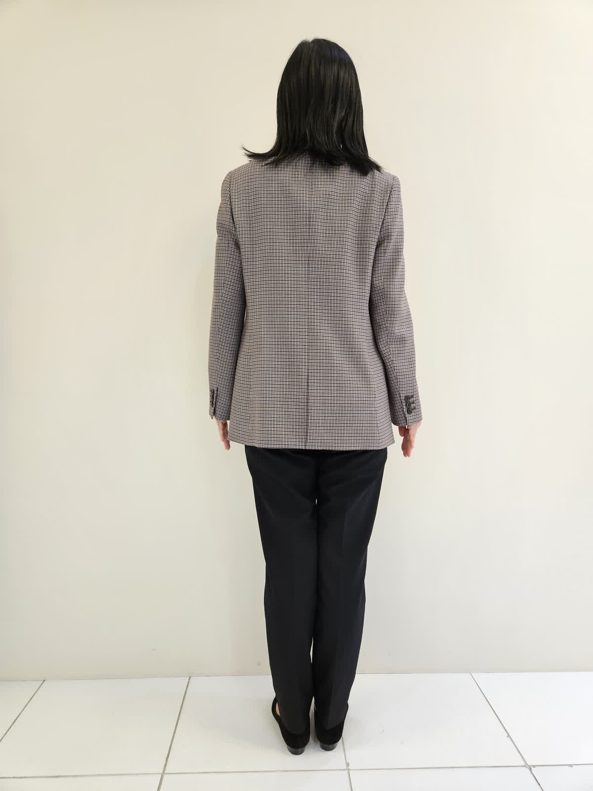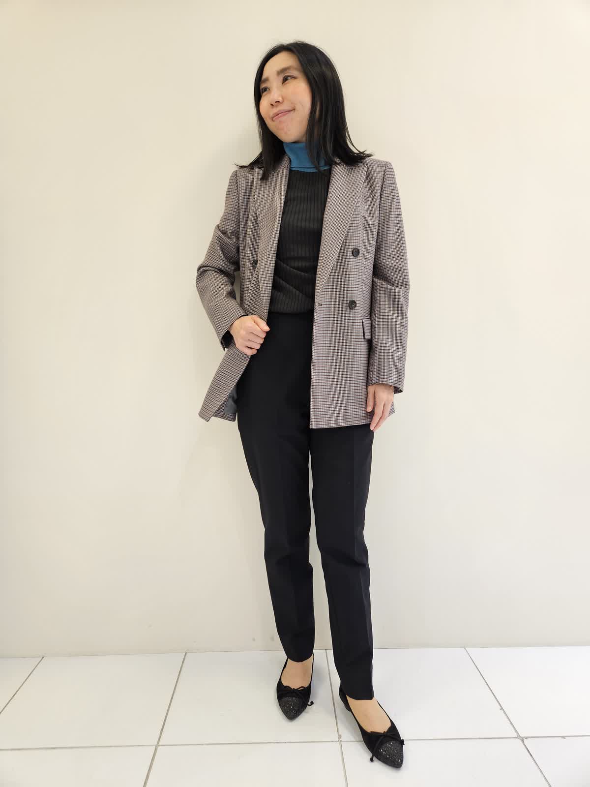 【着用サイズ・カラー】ジャケット:グレンチェック9号・ニット:スミクロ9号 ・パンツ:7号 ニットは首元と袖と色が違うのでアクセントになりワンピースや重ね着ニット合わせもお勧めです。パンツはウエストゴムで履きやすく左右にポケットもついています。ジャケットはイネドオリジナルチェックで女性らしさがありお尻までしっかり隠れます。