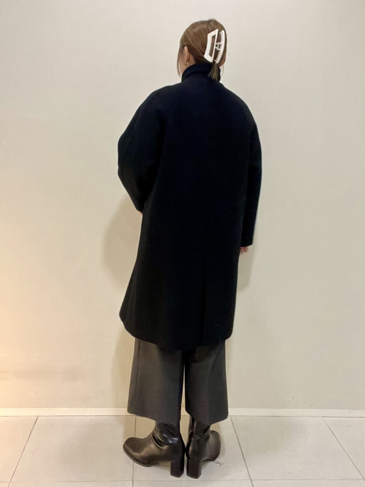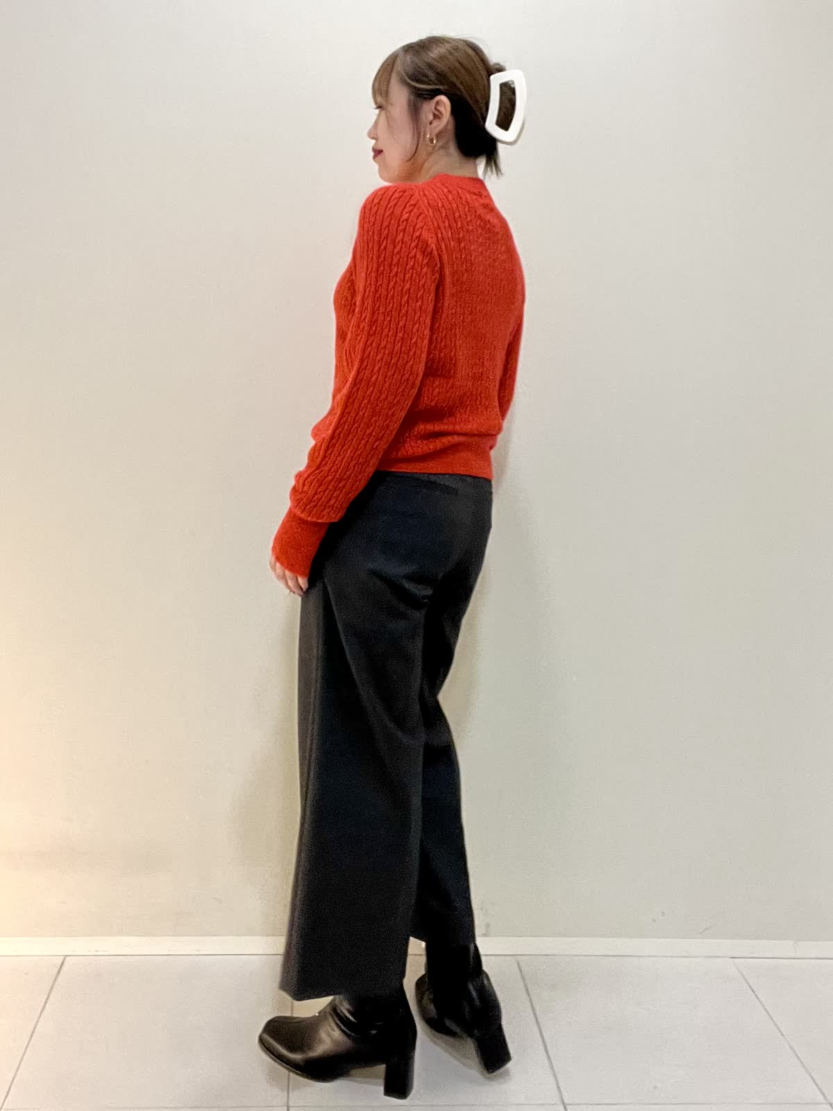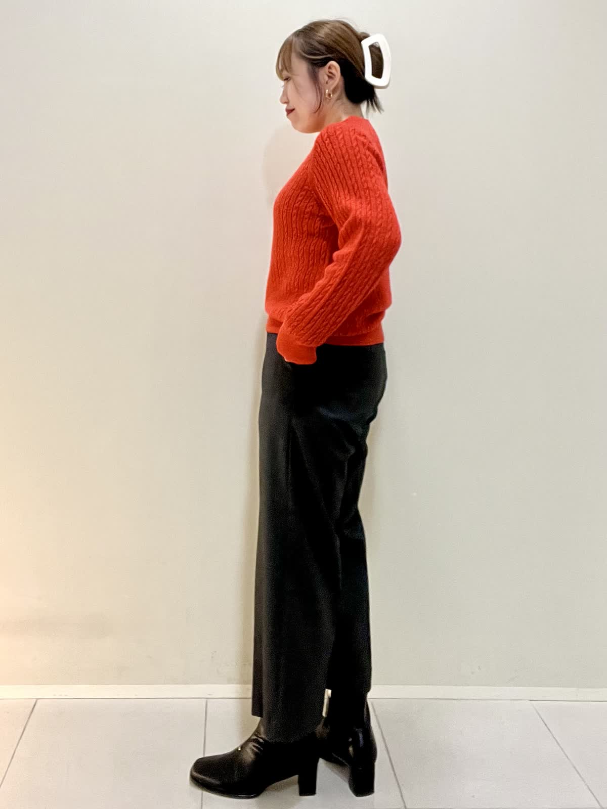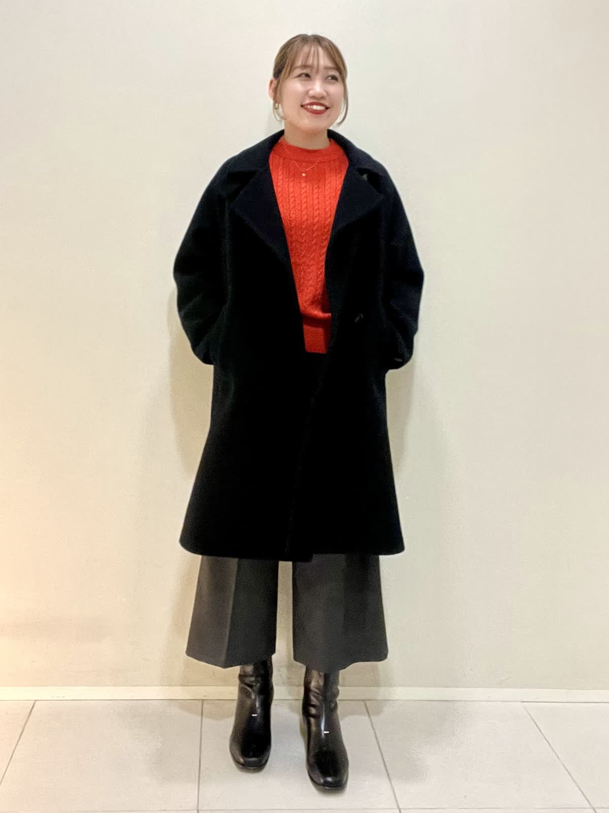 【着用サイズ】コート:フリー ニット:フリー パンツ:M 【着用カラー】コート:ブラック ニット:シュイパンツ:チャコールグレー オーソドックスなケーブル編みのニットは、カラーで目立たせてこなれ感。綺麗なシュイロで顔映りが良いです。ベビーアルパカでとても柔らかく優しい肌触りです。コートの中から少しだけ見えても綺麗な色なのが良く分かります。ロングコートとクロップド丈のパンツでクールな印象に。