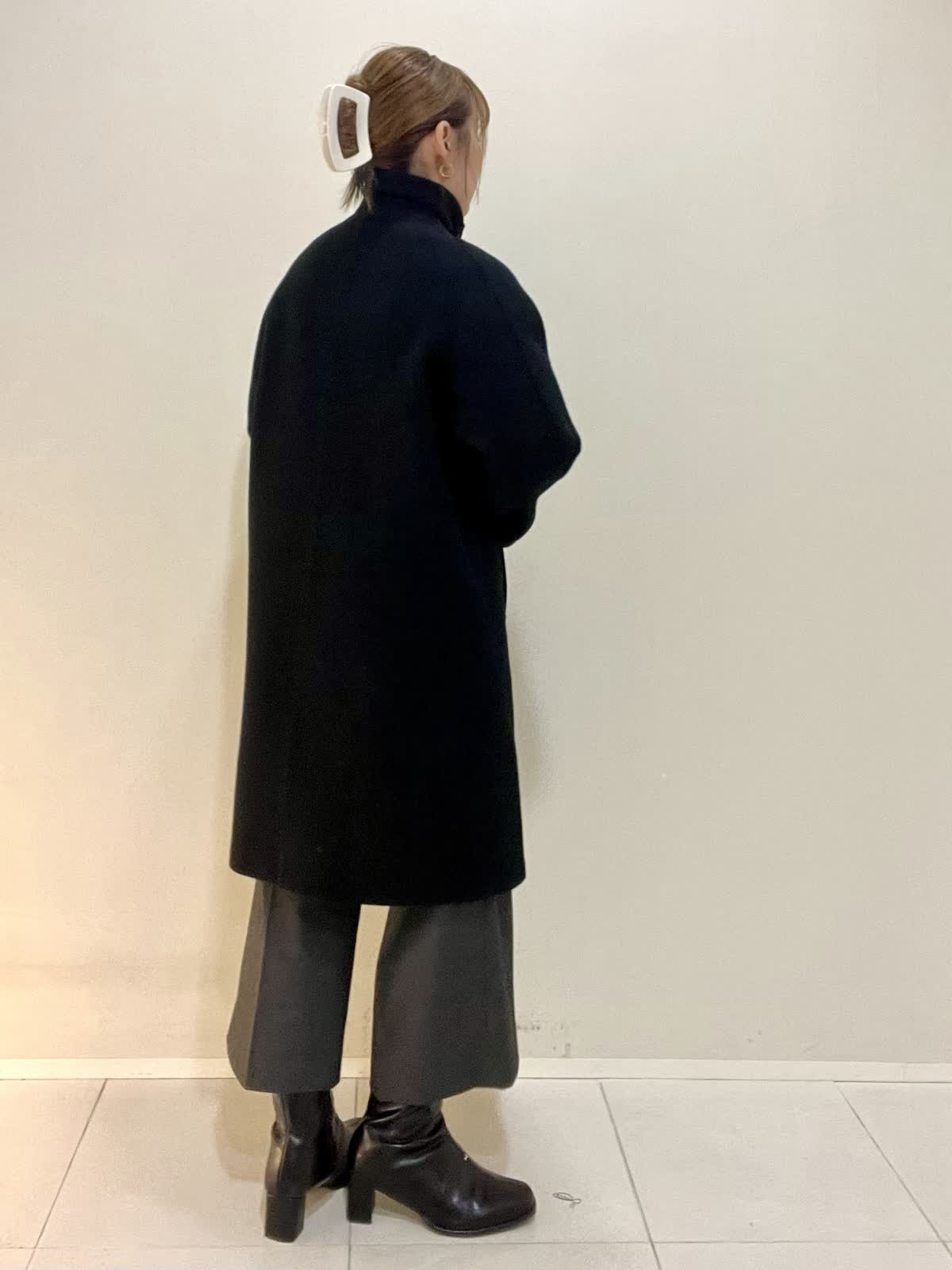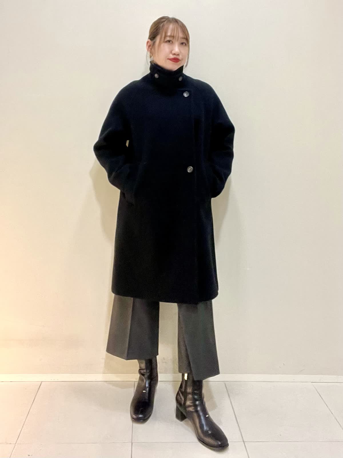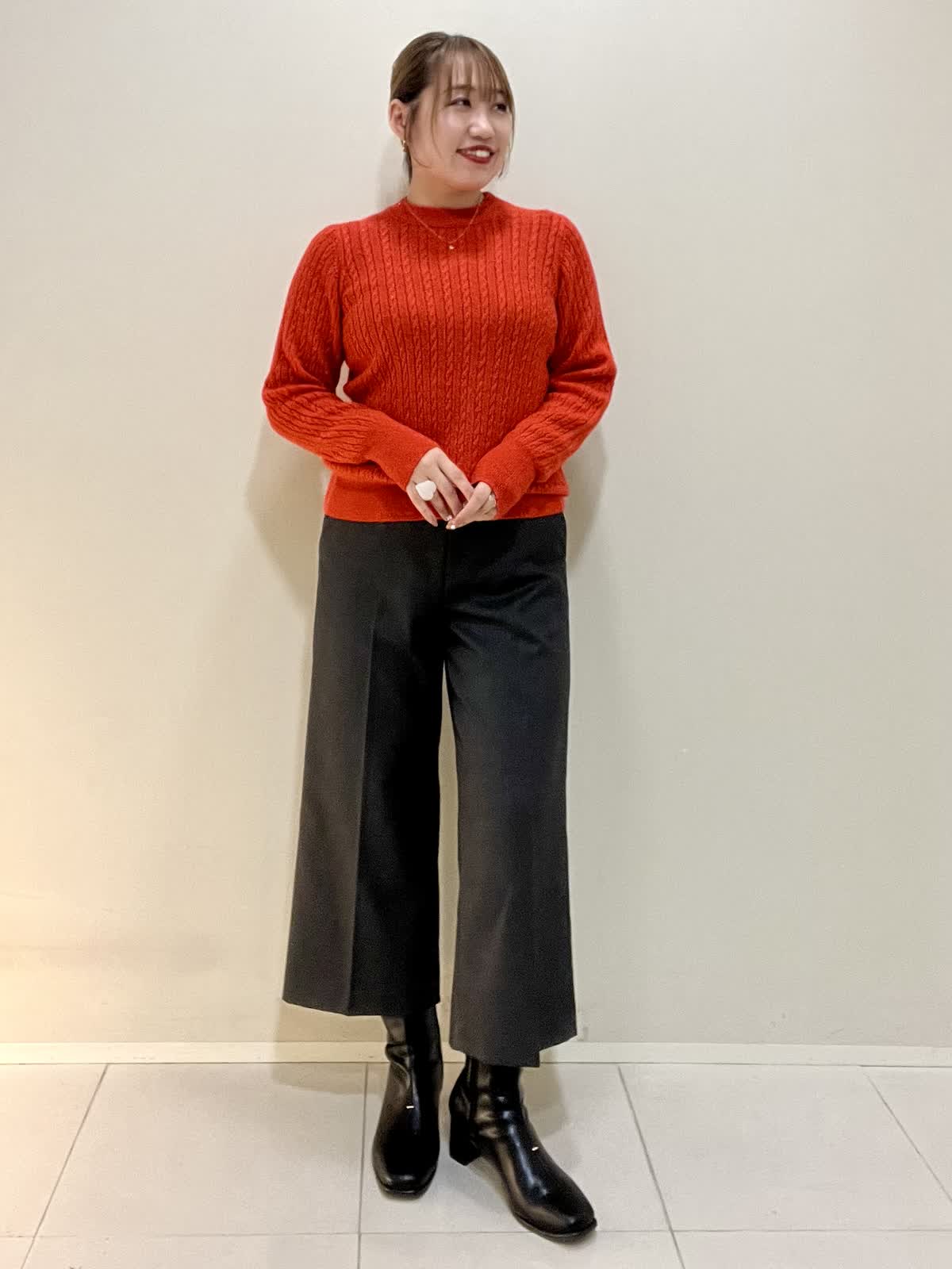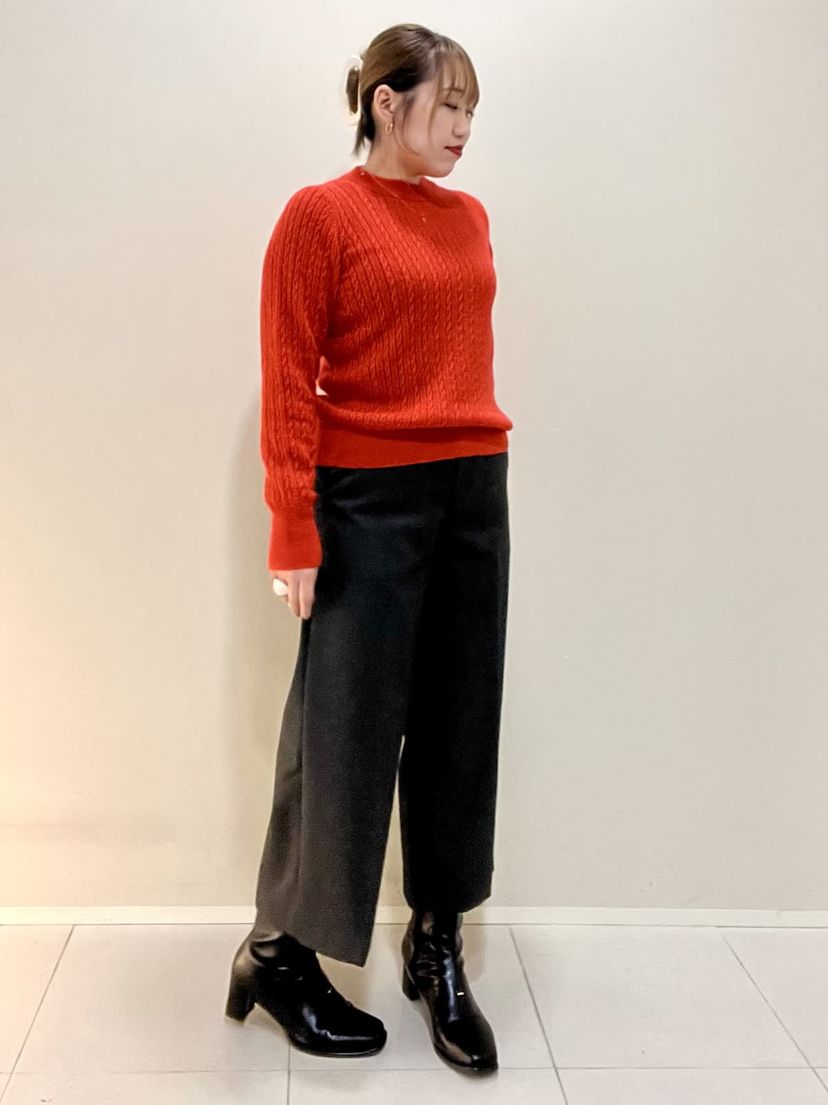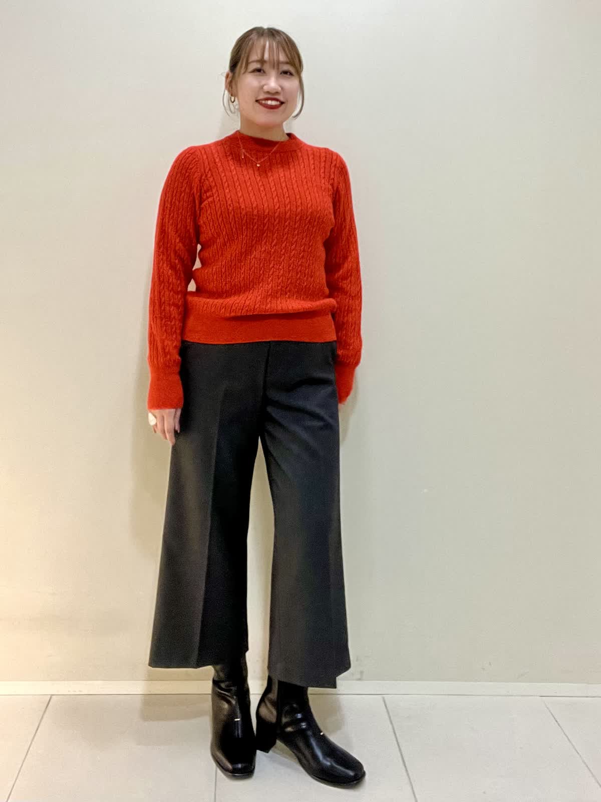 【着用サイズ】コート:フリー ニット:フリー パンツ:M 【着用カラー】コート:ブラック ニット:シュイパンツ:チャコールグレー オーソドックスなケーブル編みのニットは、カラーで目立たせてこなれ感。綺麗なシュイロで顔映りが良いです。ベビーアルパカでとても柔らかく優しい肌触りです。コートの中から少しだけ見えても綺麗な色なのが良く分かります。ロングコートとクロップド丈のパンツでクールな印象に。
