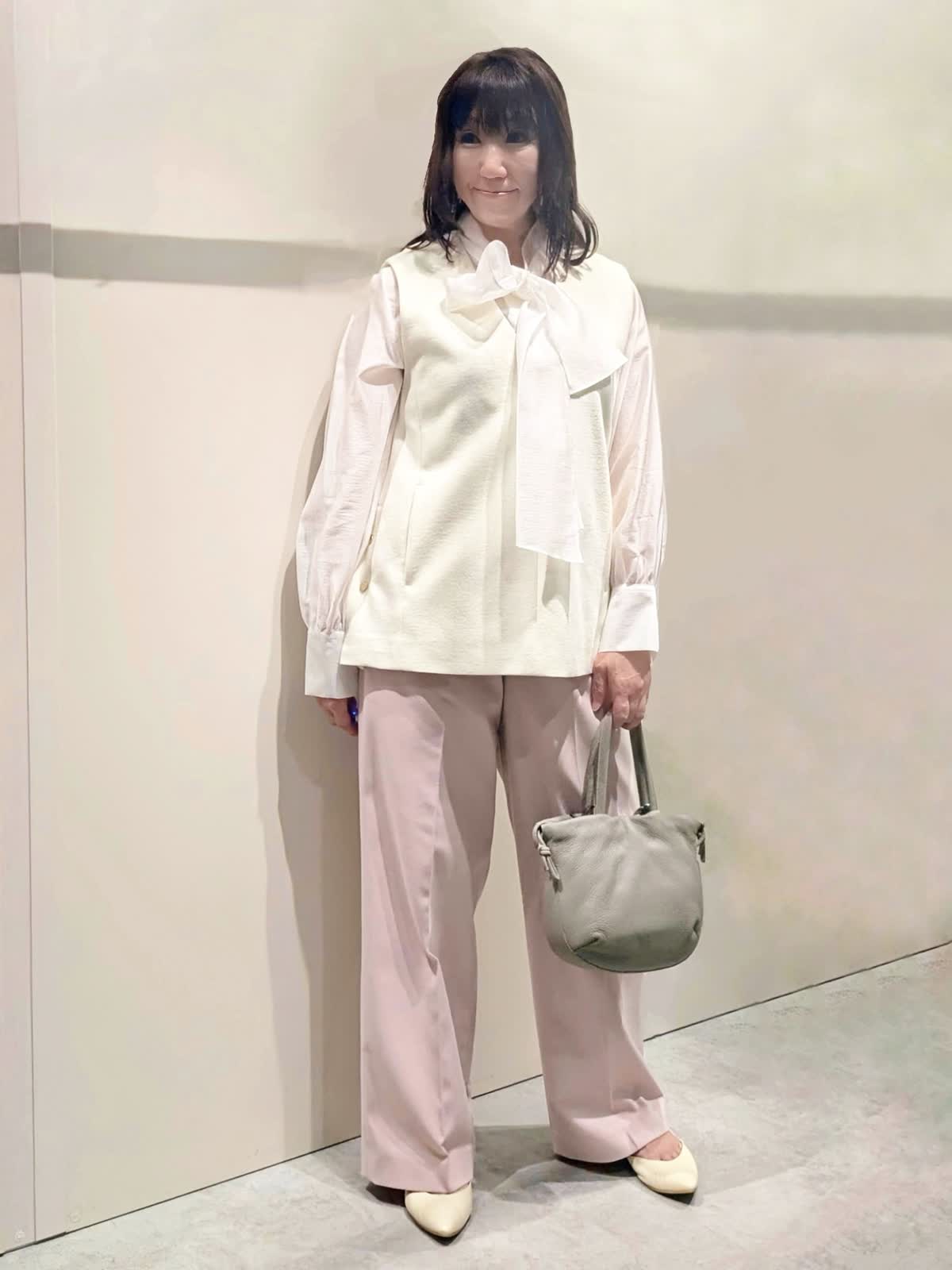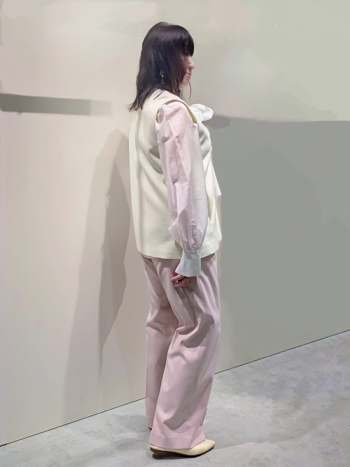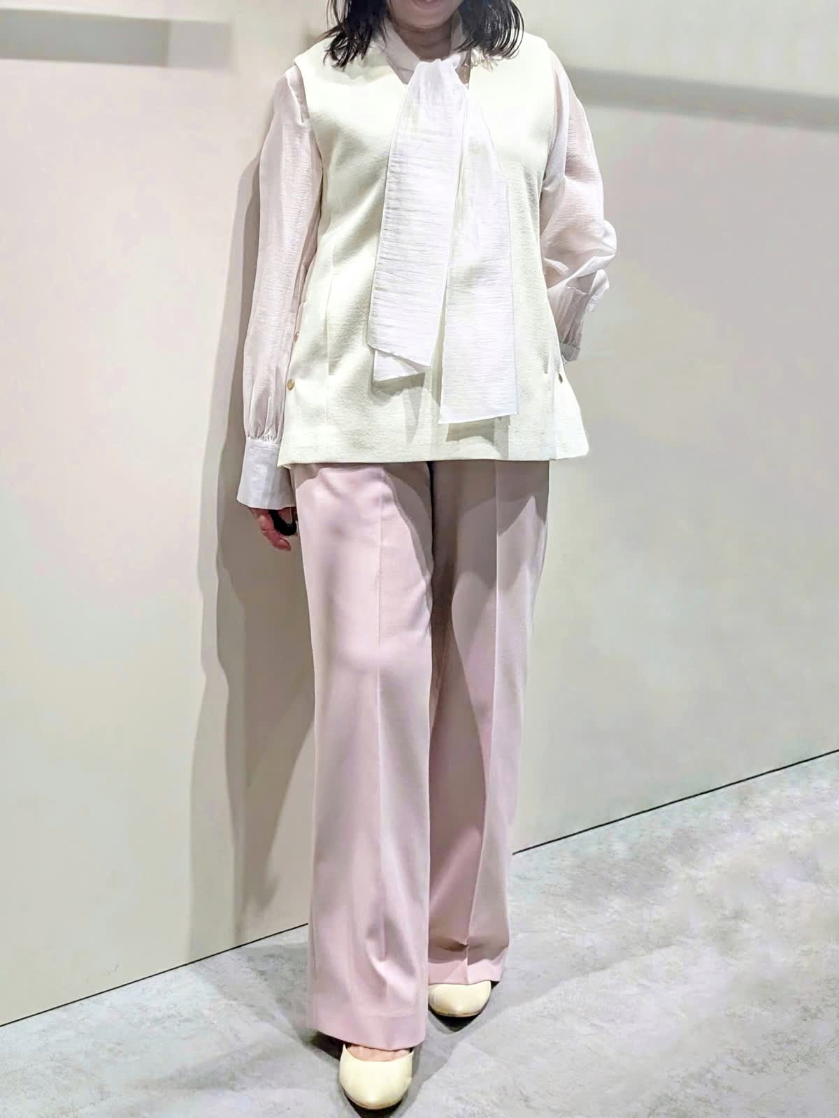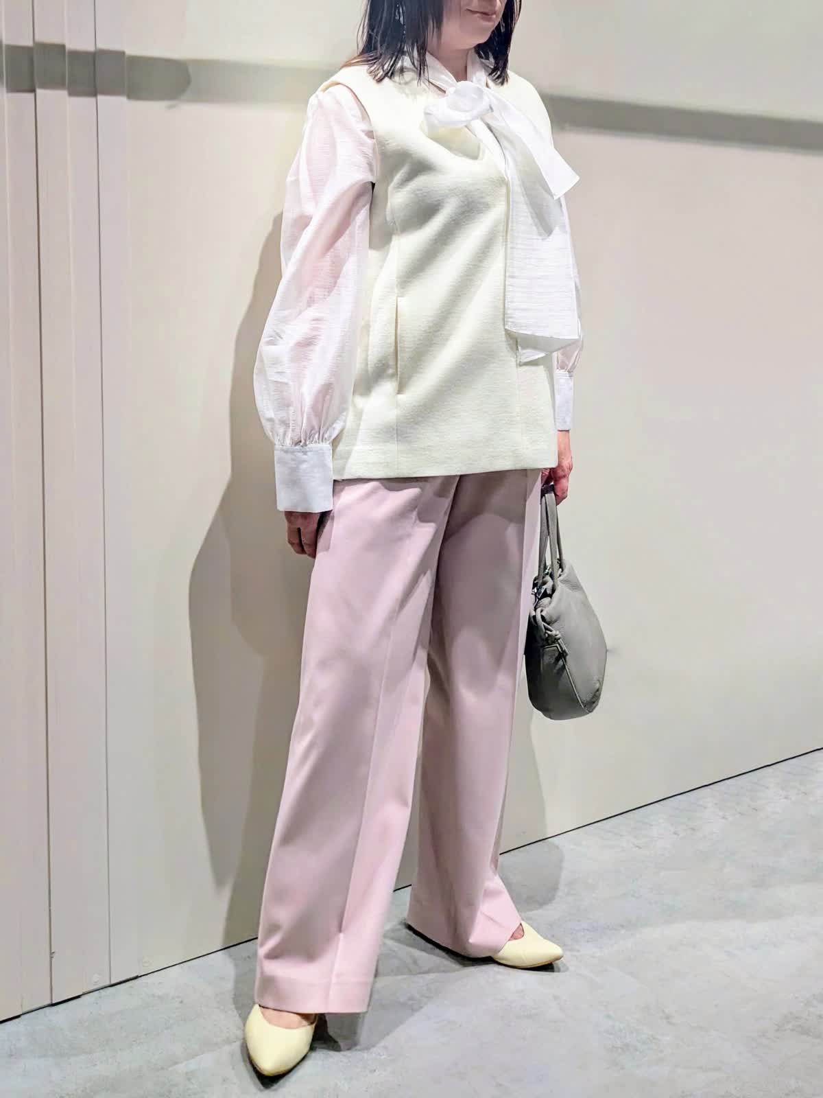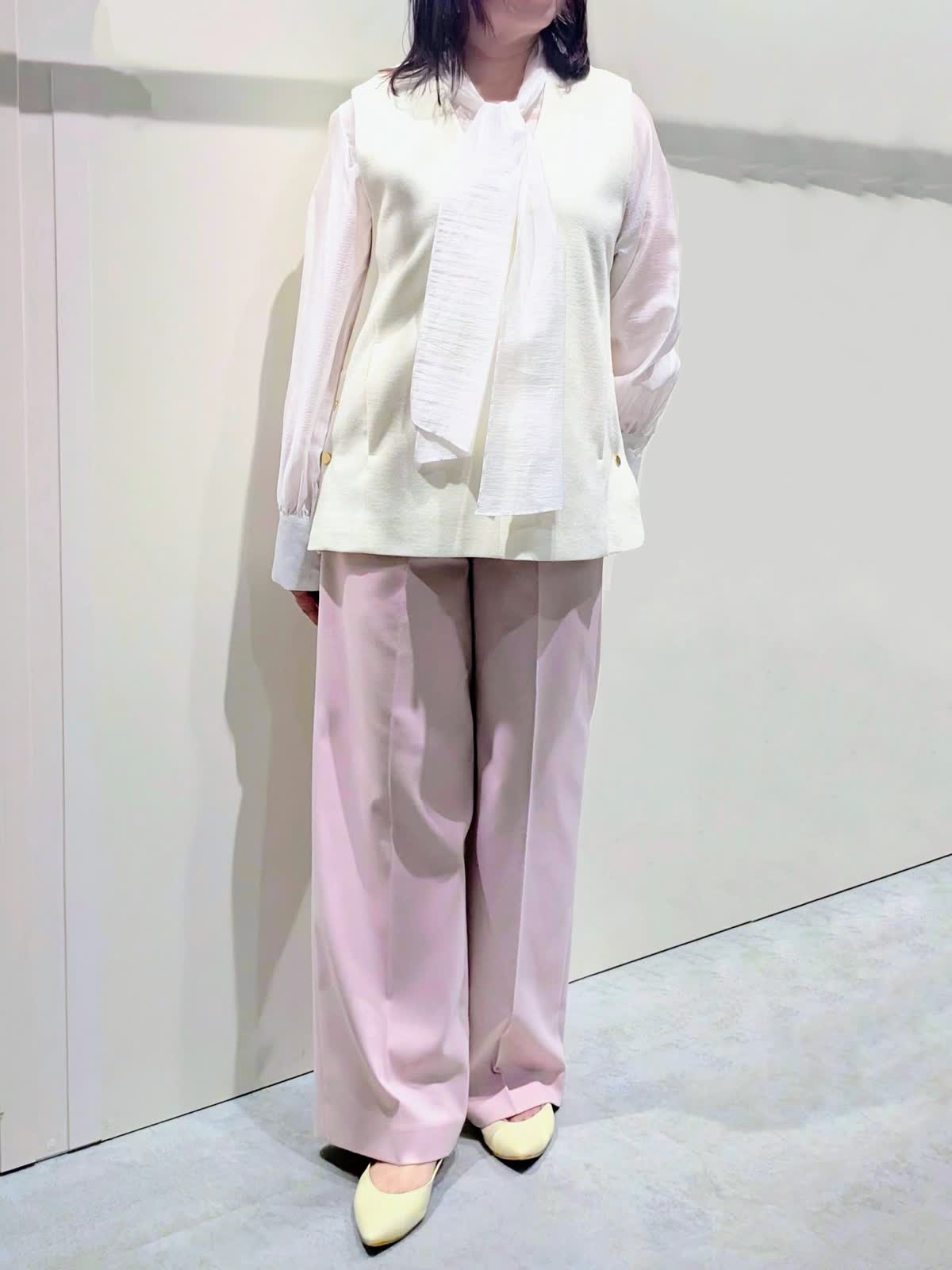 【着用サイズ】プルオーバージレ、パンツ:9号 ブラウス:フリーサイズ【着用カラー】プルオーバージレ:オフホワイト ブラウス:ホワイト パンツ:ピンク 冬のキレイ目コーディネート ウールジャージ素材のジレは、インナーのブラウスで華やかな印象に…ハイネックやシャツなど色んなレイヤードを楽しんで頂けます。サイドのボタンスリットがアクセントになり、程よいサイズ感で広がり過ぎず身体のラインを拾いません。センタープレスのワイドシルエットパンツは、きちんと感もありつつ後ろゴム仕様でストレスフリーな穿き心地です。