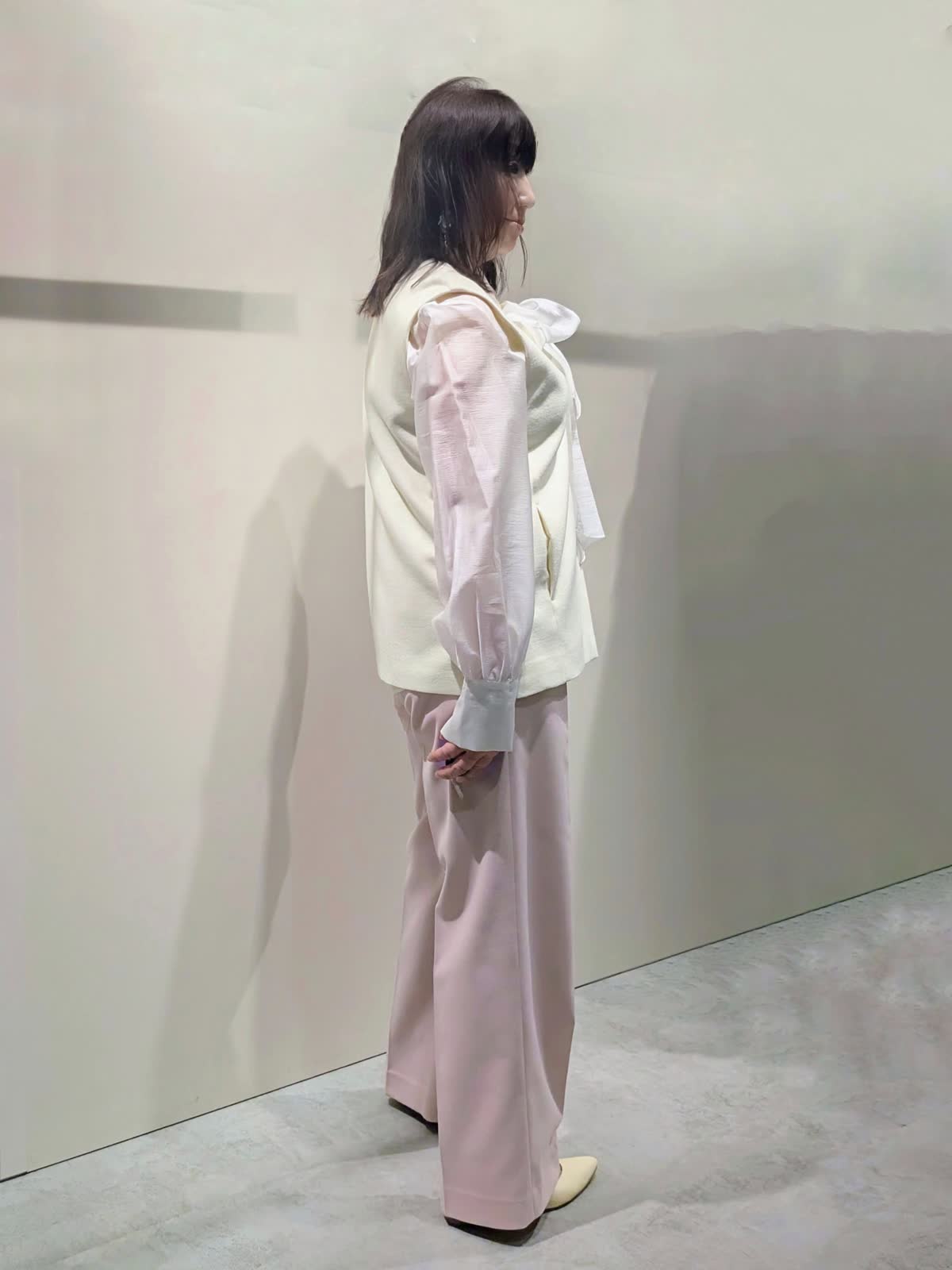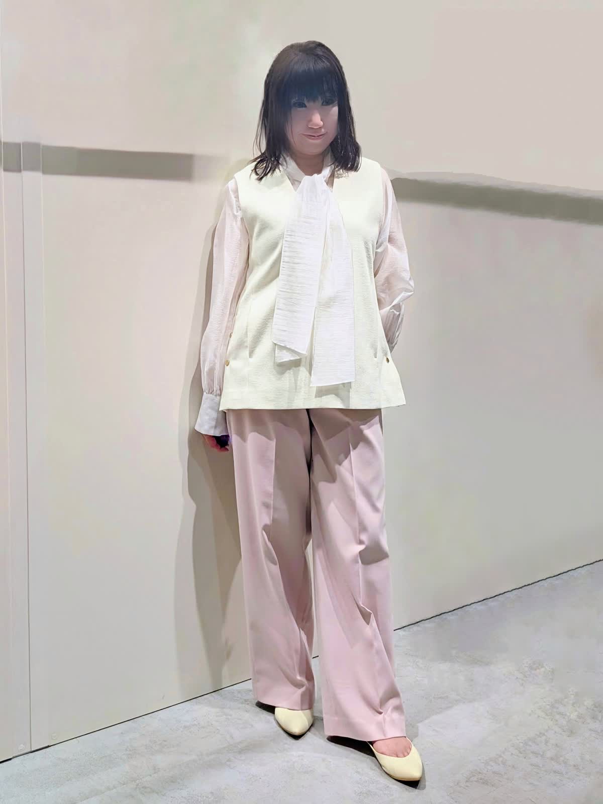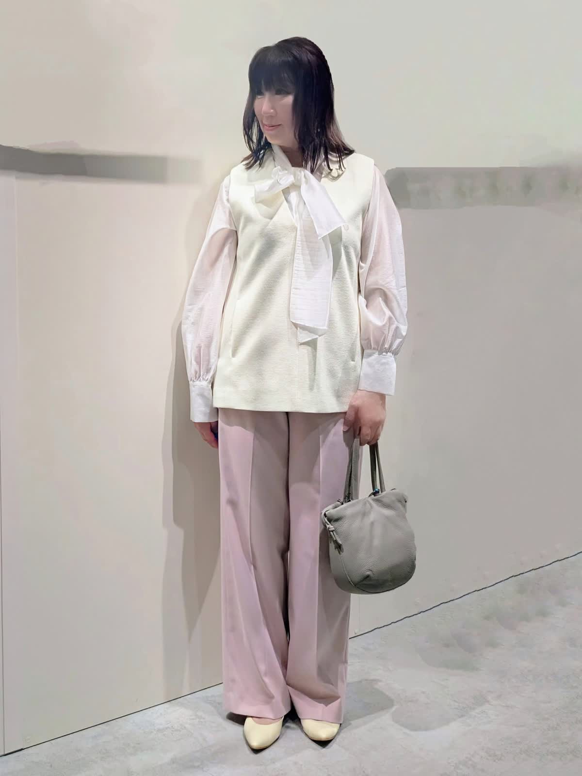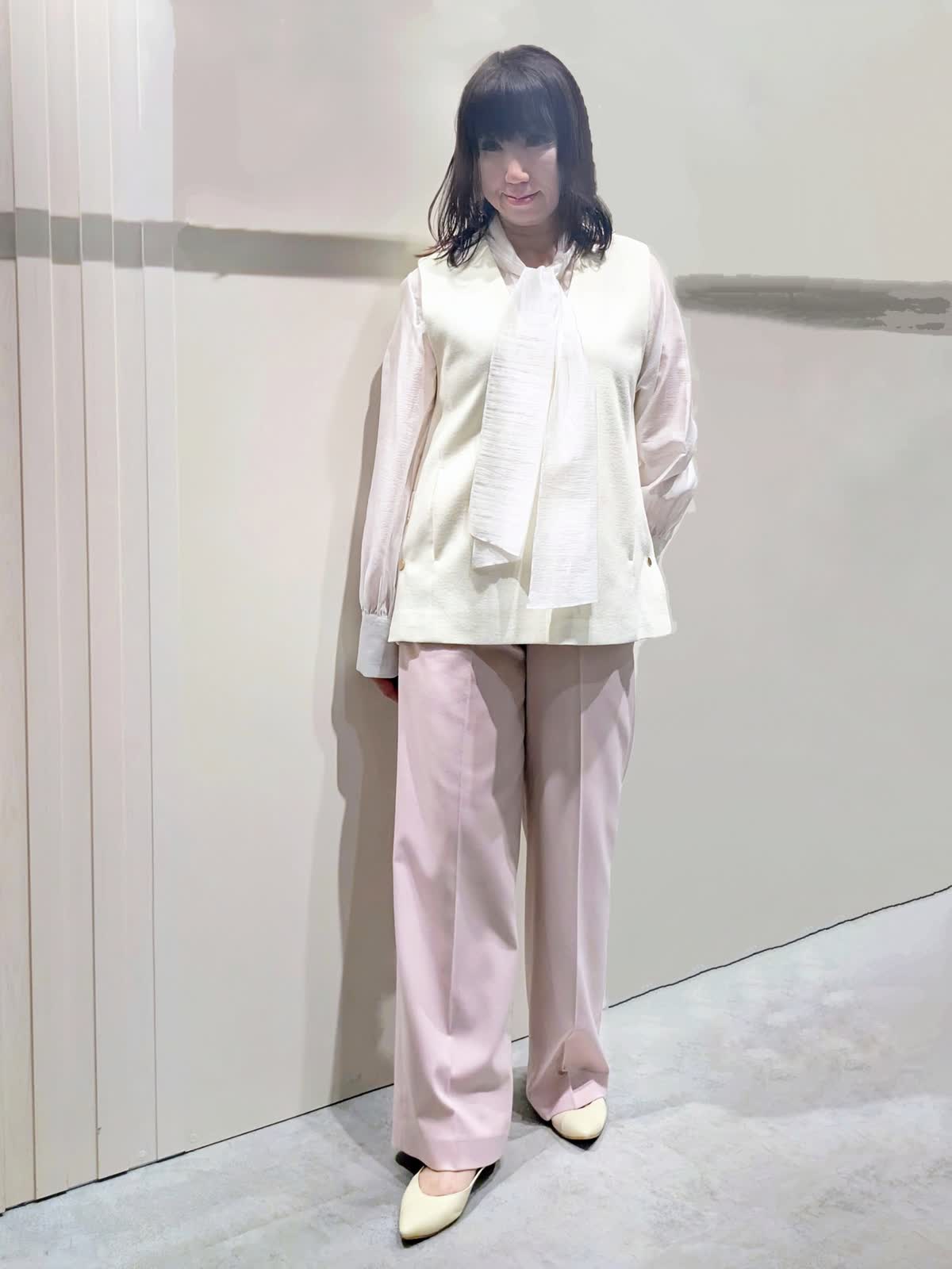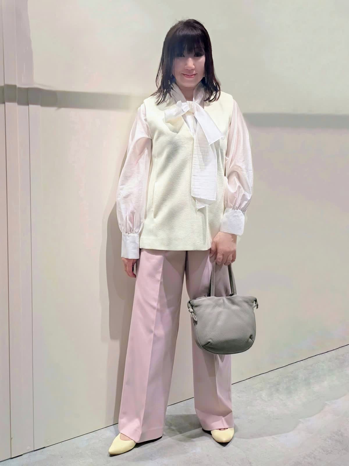 【着用サイズ】プルオーバージレ、パンツ:9号 ブラウス:フリーサイズ【着用カラー】プルオーバージレ:オフホワイト ブラウス:ホワイト パンツ:ピンク 冬のキレイ目コーディネート ウールジャージ素材のジレは、インナーのブラウスで華やかな印象に…ハイネックやシャツなど色んなレイヤードを楽しんで頂けます。サイドのボタンスリットがアクセントになり、程よいサイズ感で広がり過ぎず身体のラインを拾いません。センタープレスのワイドシルエットパンツは、きちんと感もありつつ後ろゴム仕様でストレスフリーな穿き心地です。
